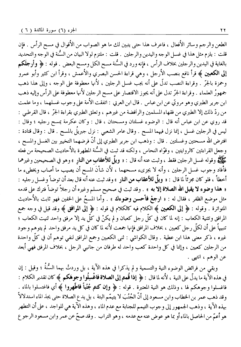 الطَّعْنُ وَالرَّجْمُ وَسَائِرُ الْأَفْعَالِ، فَاعْرِفْ هَذَا حَتَّى يَتَبَيَّنَ لَكَ مَا هُوَ الصَّوَابُ مِنَ الْأَقْوَالِ فِي مَسْحِ الرَّأْسِ. فَإِنْ قُلْتَ: يَلْزَمُ مِثْلُ هَذَا فِي غَسْلِ الْوَجْهِ وَالْيَدَيْنِ وَالرِّجْلَيْنِ. قُلْتُ: مُلْتَزِمٌ لَوْلَا الْبَيَانُ مِنَ السُّنَّةِ فِي الْوَجْهِ وَالتَّحْدِيدِ بِالْغَايَةِ فِي الْيَدَيْنِ وَالرِّجْلَيْنِ بِخِلَافِ الرَّأْسِ، فَإِنَّهُ وَرَدَ فِي السُّنَّةِ مَسْحُ الْكُلِّ وَمَسْحُ الْبَعْضِ. قَوْلُهُ: وَأَرْجُلَكُمْ إِلَى الْكَعْبَيْنِ قَرَأَ نَافِعٌ بِنَصْبِ الْأَرْجُلِ، وَهِيَ قِرَاءَةُ الْحَسَنِ الْبَصْرِيِّ وَالْأَعْمَشِ، وَقَرَأَ ابْنُ كَثِيرٍ وَأَبُو عَمْرٍو وَحَمْزَةُ بِالْجَرِّ. وَقِرَاءَةُ النَّصْبِ تَدُلُّ عَلَى أَنَّهُ يَجِبُ غَسْلُ الرجلين، لأنها معطوفة على الوجه، وإلى هذا ذَهَبَ جُمْهُورُ الْعُلَمَاءِ. وَقِرَاءَةُ الْجَرِّ تَدُلُّ عَلَى أَنَّهُ يَجُوزُ الِاقْتِصَارُ عَلَى مَسْحِ الرِّجْلَيْنِ لِأَنَّهَا مَعْطُوفَةٌ عَلَى الرَّأْسِ وَإِلَيْهِ ذَهَبَ ابْنُ جَرِيرٍ الطَّبَرِيُّ وَهُوَ مَرْوِيٌّ عَنِ ابْنِ عَبَّاسٍ. قَالَ ابْنُ الْعَرَبِيِّ: اتَّفَقَتِ الْأُمَّةُ عَلَى وُجُوبِ غَسْلِهِمَا، وَمَا عَلِمْتُ مَنْ رَدَّ ذَلِكَ إِلَّا الطَّبَرِيَّ مِنْ فُقَهَاءِ الْمُسْلِمِينَ وَالرَّافِضَةِ مِنْ غَيْرِهِمْ، وَتَعَلَّقَ الطَّبَرِيُّ بِقِرَاءَةِ الْجَرِّ، قَالَ الْقُرْطُبِيُّ:
