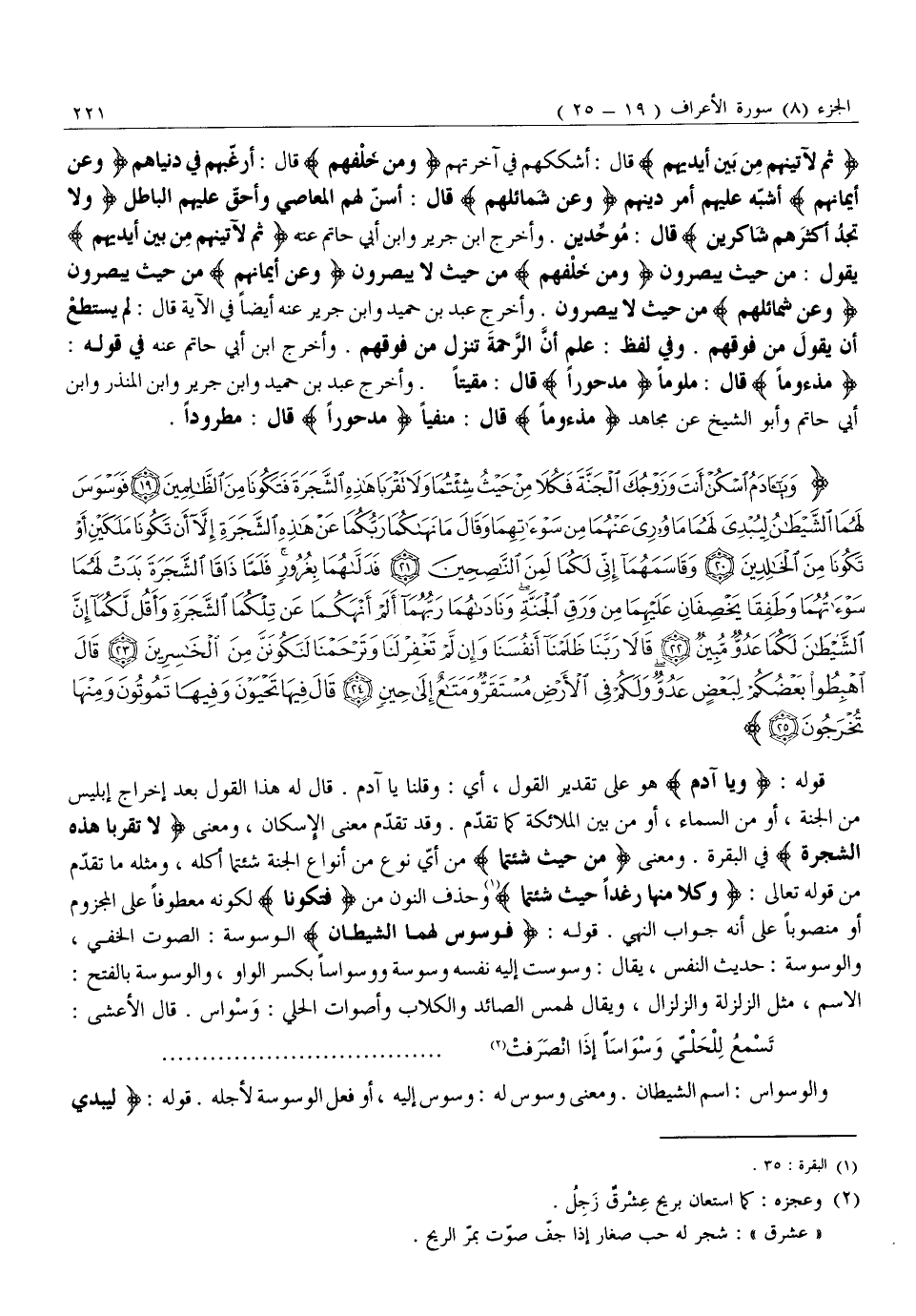 وَيا آدَمُ اسْكُنْ أَنْتَ وَزَوْجُكَ الْجَنَّةَ فَكُلا مِنْ حَيْثُ شِئْتُما وَلا تَقْرَبا هذِهِ الشَّجَرَةَ فَتَكُونا مِنَ الظَّالِمِينَ (19) فَوَسْوَسَ لَهُمَا الشَّيْطانُ لِيُبْدِيَ لَهُما مَا وُورِيَ عَنْهُما مِنْ سَوْآتِهِما وَقالَ مَا نَهاكُما رَبُّكُما عَنْ هذِهِ الشَّجَرَةِ إِلاَّ أَنْ تَكُونا مَلَكَيْنِ أَوْ تَكُونا مِنَ الْخالِدِينَ (20) وَقاسَمَهُما إِنِّي لَكُما لَمِنَ النَّاصِحِينَ (21) فَدَلاَّهُما بِغُرُورٍ فَلَمَّا ذاقَا الشَّجَرَةَ بَدَتْ لَهُما سَوْآتُهُما وَطَفِقا يَخْصِفانِ عَلَيْهِما مِنْ وَرَقِ الْجَنَّةِ وَناداهُما رَبُّهُما أَلَمْ أَنْهَكُما عَنْ تِلْكُمَا الشَّجَرَةِ وَأَقُلْ لَكُما إِنَّ الشَّيْطانَ لَكُما عَدُوٌّ مُبِينٌ (22) قَالَا رَبَّنا ظَلَمْنا أَنْفُسَنا وَإِنْ لَمْ تَغْفِرْ لَنا وَتَرْحَمْنا لَنَكُونَنَّ مِنَ الْخاسِرِينَ (23)