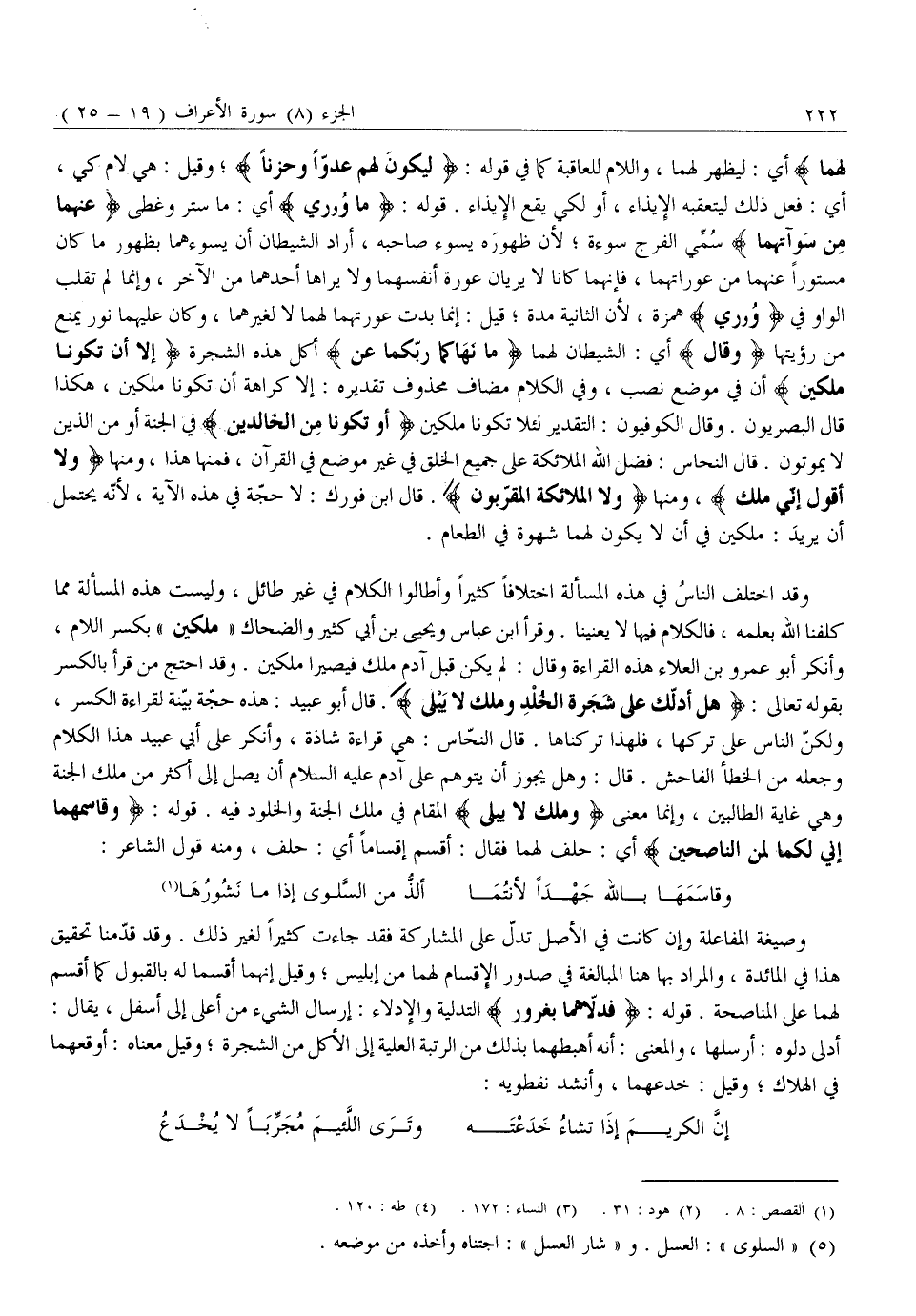 لَهُمَا أَيْ: لِيُظْهِرَ لَهُمَا، وَاللَّامُ لِلْعَاقِبَةِ كَمَا في قوله: لِيَكُونَ لَهُمْ عَدُوًّا وَحَزَناً وَقِيلَ: هِيَ لَامُ كَيْ، أَيْ: فَعَلَ ذَلِكَ لِيَتَعَقَّبَهُ الْإِيذَاءُ، أَوْ لِكَيْ يَقَعَ الْإِيذَاءُ. قَوْلُهُ: مَا وُورِيَ أَيْ: مَا سُتِرَ وَغُطِّيَ عَنْهُما مِنْ سَوْآتِهِما سَمَّى الْفَرَجَ سَوْءَةً لِأَنَّ ظُهُورَهُ يَسُوءُ صَاحِبَهُ، أَرَادَ الشَّيْطَانُ أَنْ يَسُوءَهُمَا بِظُهُورِ مَا كَانَ مَسْتُورًا عَنْهُمَا مِنْ عَوْرَاتِهِمَا، فَإِنَّهُمَا كَانَا لَا يَرَيَانِ عَوْرَةَ أَنْفُسِهِمَا وَلَا يَرَاهَا أَحَدُهُمَا مِنَ الْآخَرِ، وَإِنَّمَا لَمْ تُقْلَبِ الْوَاوُ فِي وُورِيَ هَمْزَةً، لِأَنَّ الثَّانِيَةَ مَدَّةٌ قِيلَ: إِنَّمَا بَدَتْ عَوْرَتُهُمَا لَهُمَا لَا لِغَيْرِهِمَا، وَكَانَ عَلَيْهِمَا نُورٌ يَمْنَعُ مِنْ رُؤْيَتِهَا وَقالَ أَيِ: الشَّيْطَانُ لَهُمَا مَا نَهاكُما رَبُّكُما عَنْ أَكْلِ هَذِهِ الشَّجَرَةِ إِلَّا أَنْ تَكُونا مَلَكَيْنِ أَنْ فِي مَوْضِعِ نَصْبٍ، وَفِي الْكَلَامِ مُضَافٌ مَحْذُوفٌ تقديره: إلا كَرَاهَةَ أَنْ تَكُونَا مَلَكَيْنِ، هَكَذَا قَالَ الْبَصْرِيُّونَ. وَقَالَ الْكُوفِيُّونَ: التَّقْدِيرُ لِئَلَّا تَكُونَا مَلَكَيْنِ أَوْ تَكُونا مِنَ الْخالِدِينَ فِي الْجَنَّةِ أَوْ مِنَ الَّذِينَ لَا يَمُوتُونَ. قَالَ النَّحَّاسُ: فَضَّلَ اللَّهُ الْمَلَائِكَةَ عَلَى جَمِيعِ الْخَلْقِ فِي غَيْرِ مَوْضِعٍ فِي الْقُرْآنِ، فَمِنْهَا هَذَا، وَمِنْهَا وَلا أَقُولُ إِنِّي مَلَكٌ، ومنها لَا الْمَلائِكَةُ الْمُقَرَّبُونَ