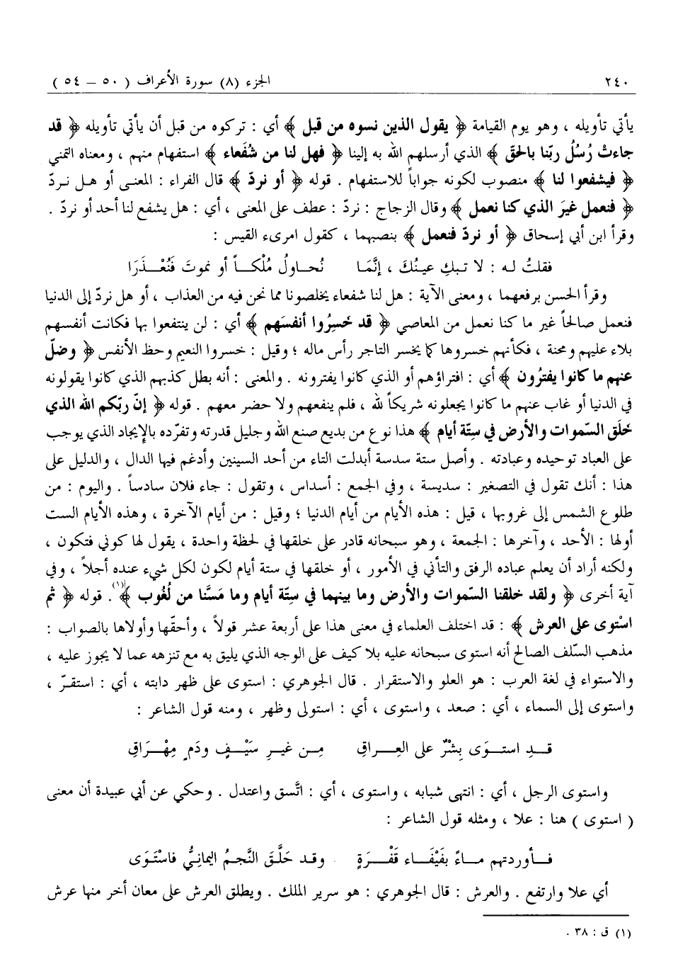 وَقَرَأَ الْحَسَنُ بِرَفْعِهِمَا، وَمَعْنَى الْآيَةِ: هَلْ لَنَا شُفَعَاءُ يُخَلِّصُونَا مِمَّا نَحْنُ فِيهِ مِنَ الْعَذَابِ، أَوْ هَلْ نُرَدُّ إِلَى الدُّنْيَا فَنَعْمَلَ صَالِحًا غَيْرَ مَا كُنَّا نَعْمَلُ مِنَ الْمَعَاصِي قَدْ خَسِرُوا أَنْفُسَهُمْ أي: لن يَنْتَفِعُوا بِهَا فَكَانَتْ أَنْفُسُهُمْ بَلَاءً عَلَيْهِمْ وَمِحْنَةً، فَكَأَنَّهُمْ خَسِرُوهَا كَمَا يَخْسَرُ التَّاجِرُ رَأْسَ مَالِهِ وَقِيلَ: خَسِرُوا النَّعِيمَ وَحَظَّ الْأَنْفُسِ وَضَلَّ عَنْهُمْ مَا كانُوا يَفْتَرُونَ أَيِ: افْتِرَاؤُهُمْ أَوِ الَّذِي كَانُوا يَفْتَرُونَهُ. وَالْمَعْنَى: أَنَّهُ بَطَلَ كَذِبُهُمُ الَّذِي كَانُوا يَقُولُونَهُ فِي الدُّنْيَا أَوْ غَابَ عَنْهُمْ مَا كَانُوا يَجْعَلُونَهُ شَرِيكًا لِلَّهِ، فَلَمْ يَنْفَعْهُمْ وَلَا حَضَرَ مَعَهُمْ. قَوْلُهُ إِنَّ رَبَّكُمُ اللَّهُ الَّذِي خَلَقَ السَّماواتِ وَالْأَرْضَ فِي سِتَّةِ أَيَّامٍ هَذَا نَوْعٌ مِنْ بَدِيعِ صُنْعِ اللَّهِ وَجَلِيلِ قَدْرَتِهِ وَتَفَرُّدِهِ بِالْإِيجَادِ الَّذِي يُوجِبُ عَلَى الْعِبَادِ تَوْحِيدَهُ وَعِبَادَتَهُ. وَأَصْلُ سِتَّةَ سِدْسَةُ أُبْدِلَتِ التَّاءُ مِنْ أَحَدِ السِّينَيْنِ وَأُدْغِمَ فِيهَا الدَّالُّ، وَالدَّلِيلُ عَلَى هَذَا: أَنَّكَ تَقُولُ فِي التَّصْغِيرِ: سُدَيْسَةُ، وفي الجمع: أسداس، وتقول: جاء فلان سَادِسًا. وَالْيَوْمُ: مِنْ طُلُوعِ الشَّمْسِ إِلَى غُرُوبِهَا، قِيلَ: هَذِهِ الْأَيَّامُ مِنْ أَيَّامِ الدُّنْيَا وَقِيلَ: مِنْ أَيَّامِ الْآخِرَةِ، وَهَذِهِ الْأَيَّامُ السِّتُّ أَوَّلُهَا: الْأَحَدُ، وَآخِرُهَا: الْجُمُعَةُ، وَهُوَ سُبْحَانُهُ قَادِرٌ عَلَى خَلْقِهَا فِي لَحْظَةٍ وَاحِدَةٍ، يَقُولُ لَهَا كَوْنِي فَتَكُونُ، وَلَكِنَّهُ أَرَادَ أَنْ يُعَلِّمَ عِبَادَهُ الرِّفْقَ وَالتَّأَنِّيَ فِي الْأُمُورِ، أَوْ خَلَقَهَا فِي سِتَّةِ أيام لكون شَيْءٍ عِنْدَهُ أَجَلًا، وَفِي آيَةٍ أُخْرَى وَلَقَدْ خَلَقْنَا السَّماواتِ وَالْأَرْضَ وَما بَيْنَهُما فِي سِتَّةِ أَيَّامٍ وَما مَسَّنا مِنْ لُغُوبٍ «1» . قَوْلُهُ ثُمَّ اسْتَوى عَلَى الْعَرْشِ: قَدِ اخْتَلَفَ الْعُلَمَاءُ فِي مَعْنَى هَذَا عَلَى أَرْبَعَةَ عَشَرَ قَوْلًا، وَأَحَقُّهَا وَأَوْلَاهَا بِالصَّوَابِ: