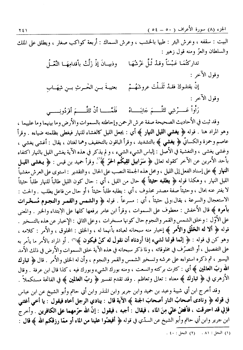 وَقَدْ ثَبَتَ فِي الْأَحَادِيثِ الصَّحِيحَةِ صِفَةُ عَرْشِ الرَّحْمَنِ وَإِحَاطَتِهِ بالسموات وَالْأَرْضِ وَمَا بَيْنَهُمَا وَمَا عَلَيْهِمَا، وَهُوَ الْمُرَادُ هُنَا. قَوْلُهُ يُغْشِي اللَّيْلَ النَّهارَ أَيْ: يَجْعَلُ اللَّيْلَ كَالْغِشَاءِ لِلنَّهَارِ فَيُغَطِّي بِظُلْمَتِهِ ضِيَاءَهُ. وَقَرَأَ عَاصِمٌ وَحَمْزَةُ وَالْكِسَائِيُّ يُغَشِّي بِالتَّشْدِيدِ، وَقَرَأَ الْبَاقُونَ بِالتَّخْفِيفِ وَهُمَا لُغَتَانِ، يُقَالُ: أَغْشَى يُغْشِي، وَغَشَّى يُغَشِّي، وَالتَّغْشِيَةُ فِي الْأَصْلِ: إِلْبَاسُ الشَّيْءِ الشَّيْءَ، وَلَمْ يَذْكُرْ فِي هَذِهِ الْآيَةِ يُغْشِي اللَّيْلَ بِالنَّهَارِ اكْتِفَاءً بِأَحَدِ الْأَمْرَيْنِ عَنِ الْآخَرِ كَقَوْلِهِ تعالى سَرابِيلَ تَقِيكُمُ الْحَرَّ «1» . وَقَرَأَ حُمَيْدُ بْنُ قَيْسٍ: يُغْشِي اللَّيْلَ النَّهارَ عَلَى إِسْنَادِ الْفِعْلِ إِلَى اللَّيْلِ، وَمَحَلُّ هَذِهِ الْجُمْلَةِ النَّصْبُ عَلَى الْحَالِ، وَالتَّقْدِيرُ: اسْتَوَى عَلَى الْعَرْشِ مُغْشِيًا اللَّيْلَ النَّهَارَ، وَهَكَذَا قَوْلُهُ يَطْلُبُهُ حَثِيثاً حَالٌ مِنَ اللَّيْلِ، أَيْ: حَالَ كَوْنِ اللَّيْلِ طَالِبًا لِلنَّهَارِ طَلَبًا حَثِيثًا لَا يَفْتُرُ عَنْهُ بِحَالٍ، وَحَثِيثًا صِفَةُ مَصْدَرٍ مَحْذُوفٍ، أَيْ: يَطْلُبُهُ طَلَبًا حَثِيثًا أَوْ حَالٌ مِنْ فَاعِلِ يَطْلُبُ. وَالْحَثُّ: