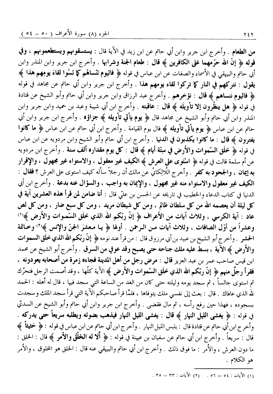 مِنَ الطَّعَامِ. وَأَخْرَجَ ابْنُ جَرِيرٍ وَابْنُ أَبِي حَاتِمٍ عَنِ ابْنِ زَيْدٍ فِي الْآيَةِ قَالَ: يَسْتَسْقُونَهُمْ وَيَسْتَطْعِمُونَهُمْ، وَفِي قَوْلِهِ إِنَّ اللَّهَ حَرَّمَهُما عَلَى الْكافِرِينَ قَالَ: طَعَامُ الْجَنَّةِ وَشَرَابُهَا. وَأَخْرَجَ ابْنُ جَرِيرٍ وَابْنُ الْمُنْذِرِ وَابْنُ أَبِي حَاتِمٍ وَالْبَيْهَقِيُّ فِي الْأَسْمَاءِ وَالصِّفَاتِ عَنِ ابْنِ عَبَّاسٍ فِي قَوْلِهِ فَالْيَوْمَ نَنْساهُمْ كَما نَسُوا لِقاءَ يَوْمِهِمْ هَذَا يَقُولُ: نَتْرُكُهُمْ فِي النَّارِ كَمَا تَرَكُوا لِقَاءَ يَوْمِهِمْ هَذَا. وَأَخْرَجَ ابْنُ جَرِيرٍ وَابْنُ أَبِي حَاتِمٍ عَنْ مُجَاهِدٍ فِي قَوْلِهِ فَالْيَوْمَ نَنْساهُمْ قَالَ: نُؤَخِّرُهُمْ. وَأَخْرَجَ عَبْدُ الرَّزَّاقِ وَابْنُ جَرِيرٍ وَابْنُ أَبِي حَاتِمٍ وَأَبُو الشَّيْخِ عَنْ قَتَادَةَ فِي قَوْلِهِ هَلْ يَنْظُرُونَ إِلَّا تَأْوِيلَهُ قَالَ: عَاقِبَتَهُ. وَأَخْرَجَ ابْنُ أَبِي شَيْبَةَ وَعَبْدُ بْنُ حُمَيْدٍ وَابْنُ جَرِيرٍ وَابْنُ الْمُنْذِرِ وَابْنُ أَبِي حَاتِمٍ وَأَبُو الشَّيْخِ عَنْ مُجَاهِدٍ قَالَ يَوْمَ يَأْتِي تَأْوِيلُهُ جَزَاؤُهُ. وَأَخْرَجَ ابْنُ جَرِيرٍ وَابْنُ أَبِي حَاتِمٍ عَنِ ابْنِ عَبَّاسٍ يَوْمَ يَأْتِي تَأْوِيلُهُ قَالَ يَوْمَ الْقِيَامَةِ. وَأَخْرَجَ ابْنُ أَبِي حَاتِمٍ عَنِ ابْنِ عَبَّاسٍ مَا كانُوا يَفْتَرُونَ قَالَ: مَا كَانُوا يُكَذِّبُونَ فِي الدُّنْيَا. وَأَخْرَجَ ابْنُ أَبِي حَاتِمٍ وَأَبُو الشَّيْخِ وَابْنُ مَرْدَوَيْهِ عَنِ ابْنِ عَبَّاسٍ فِي قَوْلِهِ خَلَقَ السَّماواتِ وَالْأَرْضَ فِي سِتَّةِ أَيَّامٍ قَالَ: كُلُّ يَوْمٍ مِقْدَارُهُ أَلْفُ سَنَةٍ. وَأَخْرَجَ ابْنُ مَرْدَوَيْهِ عَنْ أُمِّ سَلَمَةَ قَالَتْ فِي قَوْلِهِ اسْتَوى عَلَى الْعَرْشِ الْكَيْفُ غَيْرُ مَعْقُولٍ، وَالِاسْتِوَاءُ غَيْرُ مَجْهُولٍ، وَالْإِقْرَارُ بِهِ إِيمَانٌ، والجحود به كُفْرٌ. وَأَخْرَجَ اللَّالْكَائِيُّ عَنْ مَالِكٍ أَنَّ رَجُلًا سَأَلَهُ كَيْفَ اسْتَوَى عَلَى الْعَرْشِ؟ فَقَالَ: