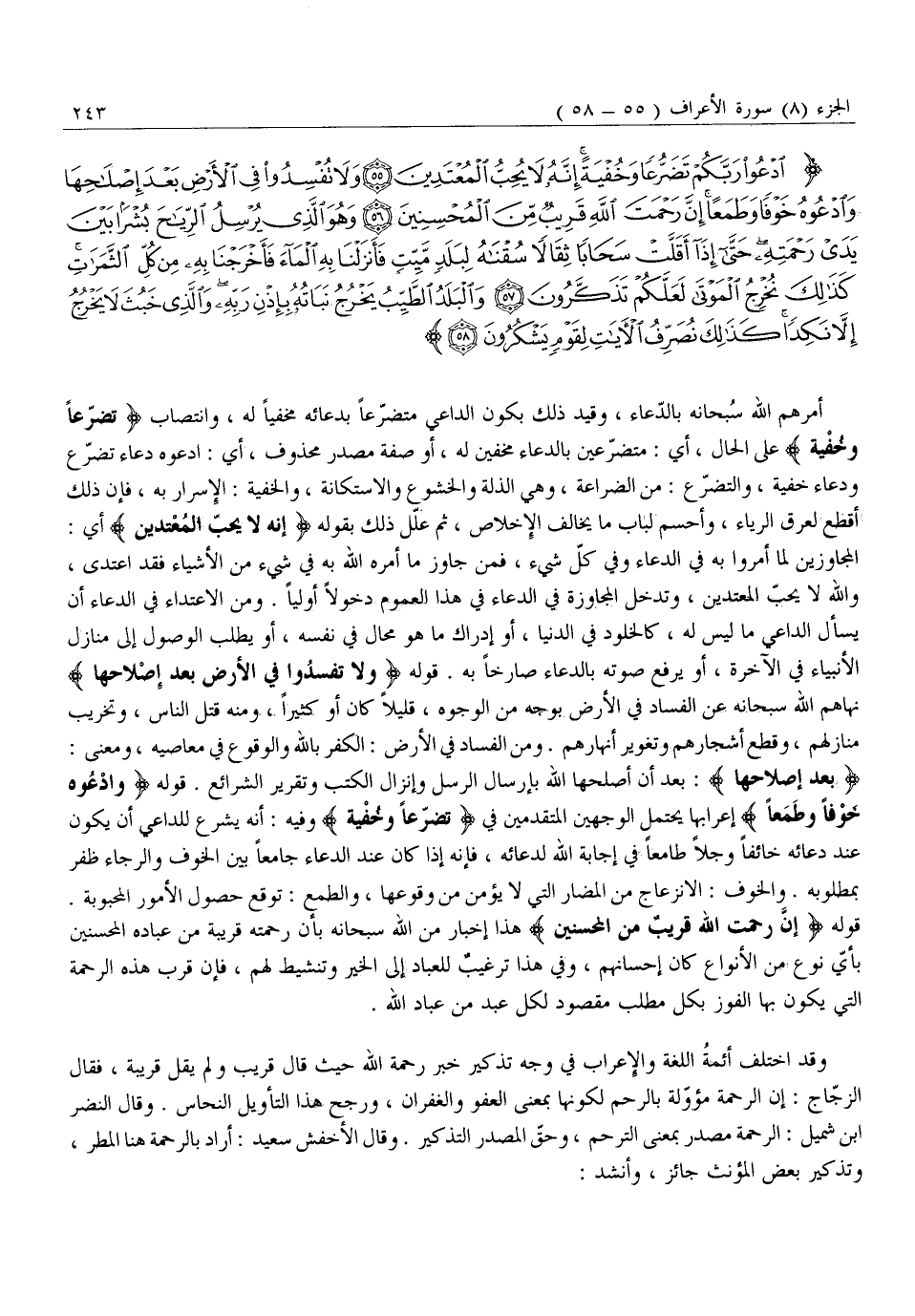 ادْعُوا رَبَّكُمْ تَضَرُّعاً وَخُفْيَةً إِنَّهُ لَا يُحِبُّ الْمُعْتَدِينَ (55) وَلا تُفْسِدُوا فِي الْأَرْضِ بَعْدَ إِصْلاحِها وَادْعُوهُ خَوْفاً وَطَمَعاً إِنَّ رَحْمَتَ اللَّهِ قَرِيبٌ مِنَ الْمُحْسِنِينَ (56) وَهُوَ الَّذِي يُرْسِلُ الرِّياحَ بُشْراً بَيْنَ يَدَيْ رَحْمَتِهِ حَتَّى إِذا أَقَلَّتْ سَحاباً ثِقالاً سُقْناهُ لِبَلَدٍ مَيِّتٍ فَأَنْزَلْنا بِهِ الْماءَ فَأَخْرَجْنا بِهِ مِنْ كُلِّ الثَّمَراتِ كَذلِكَ نُخْرِجُ الْمَوْتى لَعَلَّكُمْ تَذَكَّرُونَ (57) وَالْبَلَدُ الطَّيِّبُ يَخْرُجُ نَباتُهُ بِإِذْنِ رَبِّهِ وَالَّذِي خَبُثَ لَا يَخْرُجُ إِلاَّ نَكِداً كَذلِكَ نُصَرِّفُ الْآياتِ لِقَوْمٍ يَشْكُرُونَ (58)