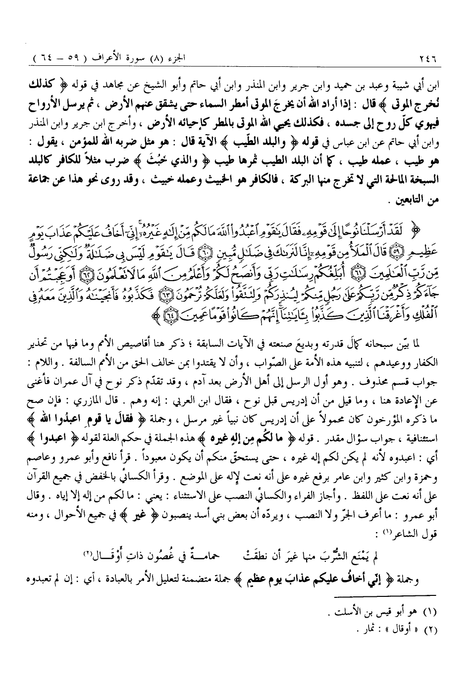 جَوَابُ قَسَمٍ مَحْذُوفٍ. وَهُوَ أَوَّلُ الرُّسُلِ إِلَى أَهْلِ الْأَرْضِ بَعْدَ آدَمَ، وَقَدْ تَقَدَّمَ ذِكْرُ نُوحٍ فِي آلِ عِمْرَانَ فَأَغْنَى عَنِ الْإِعَادَةِ هُنَا، وَمَا قِيلَ مِنْ أَنَّ إِدْرِيسَ قَبْلَ نُوحٍ، فَقَالَ ابْنُ الْعَرَبِيِّ: إِنَّهُ وَهْمٌ. قَالَ الْمَازِرِيُّ: فَإِنْ صَحَّ مَا ذَكَرَهُ الْمُؤَرِّخُونَ كَانَ مَحْمُولًا عَلَى أَنَّ إِدْرِيسَ كَانَ نبيا غير مرسل، وجملة فَقالَ يا قَوْمِ اعْبُدُوا اللَّهَ اسْتِئْنَافِيَّةٌ، جَوَابُ سُؤَالٍ مُقَدَّرٍ. قَوْلُهُ مَا لَكُمْ مِنْ إِلهٍ غَيْرُهُ هَذِهِ الْجُمْلَةُ فِي حُكْمِ الْعِلَّةِ لِقَوْلِهِ اعْبُدُوا أَيِ: اعْبُدُوهُ لِأَنَّهُ لَمْ يَكُنْ لَكُمْ إِلَهٌ غَيْرُهُ، حَتَّى يَسْتَحِقَّ مِنْكُمْ أَنْ يَكُونَ مَعْبُودًا. قَرَأَ نَافِعٌ وَأَبُو عَمْرٍو وَعَاصِمٌ وَحَمْزَةُ وَابْنُ كَثِيرٍ وَابْنُ عَامِرٍ بِرَفْعِ غَيْرِهِ عَلَى أَنَّهُ نَعْتٌ لِإِلَهٍ عَلَى الْمَوْضِعِ. وَقَرَأَ الْكِسَائِيُّ بِالْخَفْضِ فِي جَمِيعِ الْقُرْآنِ عَلَى أَنَّهُ نَعْتٌ عَلَى اللَّفْظِ. وَأَجَازَ الْفَرَّاءُ وَالْكِسَائِيُّ النَّصْبَ عَلَى الِاسْتِثْنَاءِ: يَعْنِي: مَا لَكُمْ مِنْ إِلَهٍ إِلَّا إِيَّاهُ. وَقَالَ أَبُو عَمْرٍو: مَا أَعْرِفُ الْجَرَّ وَلَا النَّصْبَ، وَيَرُدُّهُ أَنَّ بَعْضَ بَنِي أَسَدٍ يَنْصِبُونَ غَيْرَ فِي جَمِيعِ الْأَحْوَالِ، وَمِنْهُ قَوْلُ الشَّاعِرِ «1» :
