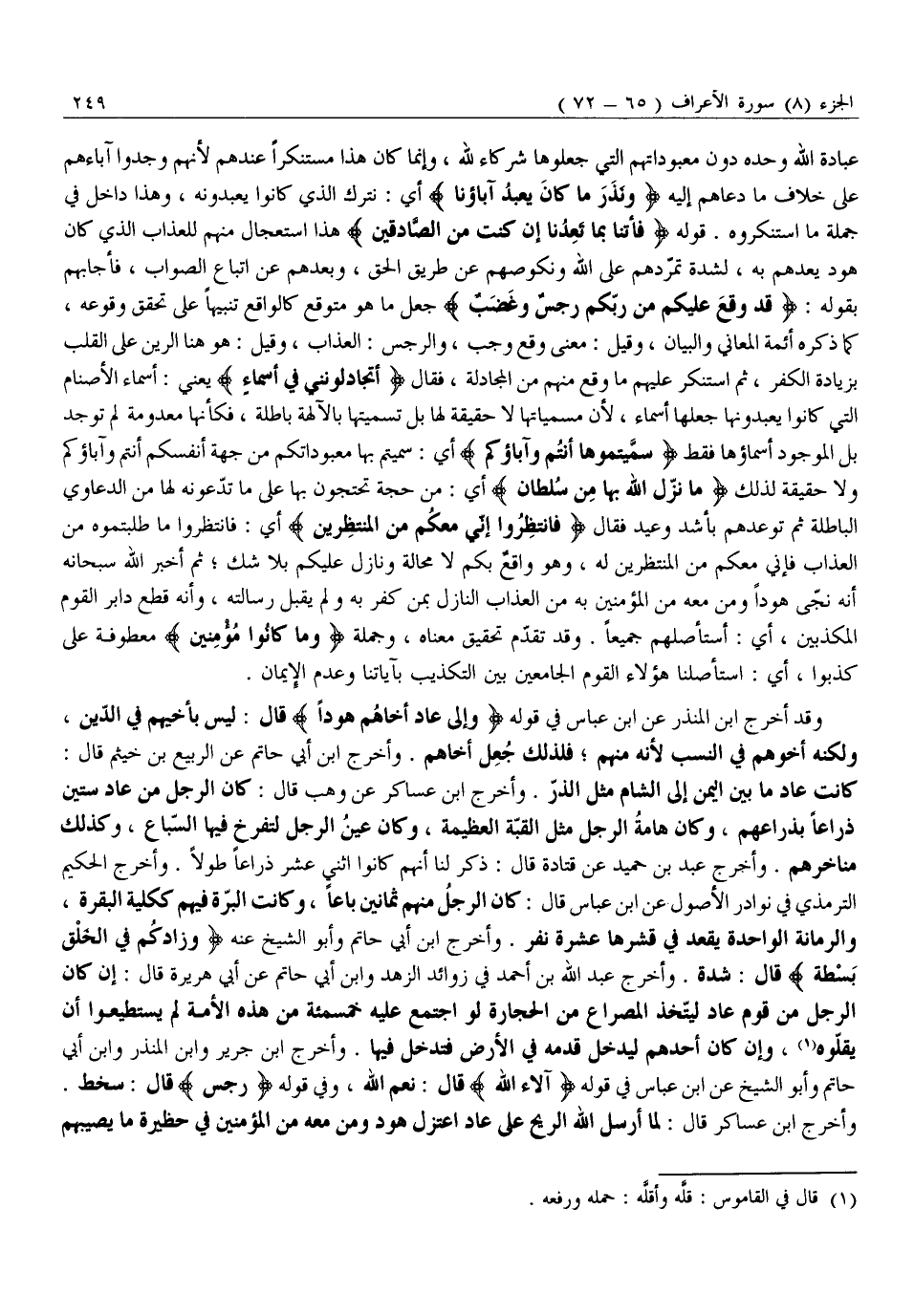 كَانَتْ عَادٌ مَا بَيْنَ الْيَمَنِ إِلَى الشَّامِ مِثْلَ الذَّرِّ. وَأَخْرَجَ ابْنُ عَسَاكِرَ عَنْ وَهْبٍ قَالَ: كَانَ الرَّجُلُ مِنْ عَادٍ سِتِّينَ ذِرَاعًا بِذِرَاعِهِمْ، وَكَانَ هَامَةُ الرَّجُلِ مِثْلَ الْقُبَّةِ الْعَظِيمَةِ، وَكَانَ عَيْنُ الرَّجُلِ لَتُفْرِخُ فِيهَا السِّبَاعُ، وَكَذَلِكَ مَنَاخِرُهُمْ. وَأَخْرَجَ عَبْدُ بْنُ حُمَيْدٍ عَنْ قَتَادَةَ قَالَ: ذُكِرَ لَنَا أَنَّهُمْ كَانُوا اثْنَيْ عَشَر ذِرَاعًا طُولًا. وَأَخْرَجَ الْحَكِيمُ التِّرْمِذِيُّ فِي نَوَادِرِ الْأُصُولِ عَنِ ابْنِ عباس قال: كان الرجل منهم ثمانين بَاعًا، وَكَانَتِ الْبُرَّةُ فِيهِمْ كَكُلْيَةِ الْبَقَرَةِ، وَالرُّمَّانَةُ الْوَاحِدَةُ يَقْعُدُ فِي قِشْرِهَا عَشَرَةُ نَفَرٍ. وَأَخْرَجَ ابْنُ أَبِي حَاتِمٍ وَأَبُو الشَّيْخِ عَنْهُ وَزادَكُمْ فِي الْخَلْقِ بَصْطَةً قَالَ: شِدَّةً. وَأَخْرَجَ عَبْدِ اللَّهِ بْنِ أَحْمَدَ فِي زَوَائِدِ الزُّهْدِ وَابْنُ أَبِي حَاتِمٍ عَنْ أَبِي هُرَيْرَةَ قَالَ: إِنْ كَانَ الرَّجُلُ مِنْ قَوْمِ عَادٍ لَيَتَّخِذُ الْمِصْرَاعَ مِنَ الْحِجَارَةِ لَوِ اجْتَمَعَ عَلَيْهِ خَمْسُمِائَةٍ مِنْ هَذِهِ الْأُمَّةِ لَمْ يَسْتَطِيعُوا أَنْ يُقِلُّوهُ «1» ، وَإِنْ كَانَ أَحَدُهُمْ لَيُدْخِلُ قَدَمَهُ فِي الْأَرْضِ فَتَدْخُلُ فِيهَا. وَأَخْرَجَ ابْنُ جَرِيرٍ وَابْنُ الْمُنْذِرِ وَابْنُ أَبِي حَاتِمٍ وَأَبُو الشَّيْخِ عَنِ ابْنِ عَبَّاسٍ فِي قَوْلِهِ آلاءَ اللَّهِ قَالَ: نِعَمَ اللَّهِ، وَفِي قَوْلِهِ رِجْسٌ قَالَ: سُخْطٌ.