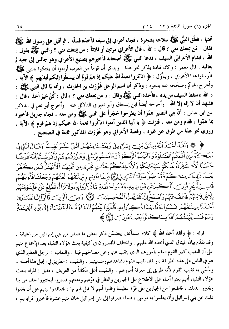 قَوْلُهُ: وَلَقَدْ أَخَذَ اللَّهُ كَلَامٌ مُسْتَأْنَفٌ يَتَضَمَّنُ ذِكْرَ بَعْضِ مَا صَدَرَ مِنْ بَنِي إِسْرَائِيلَ مِنَ الْخِيَانَةِ.