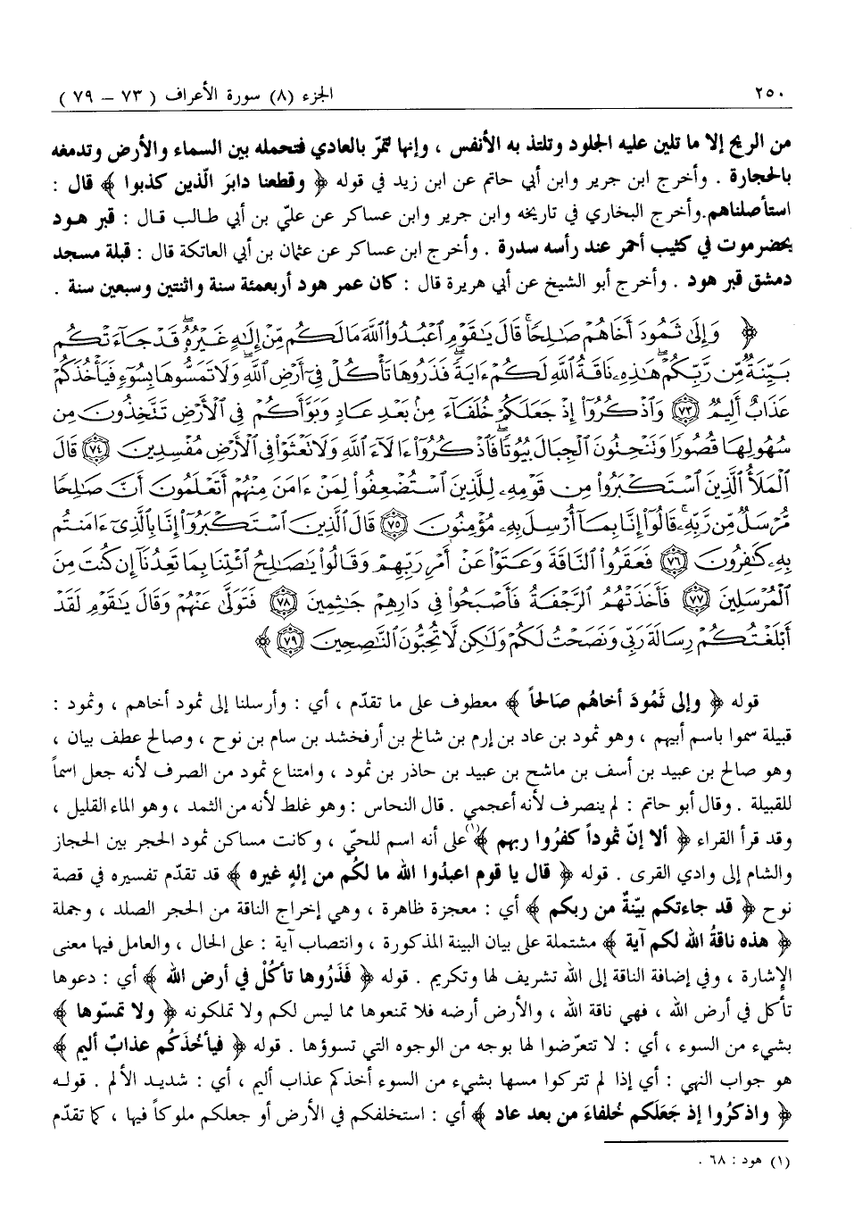 وَإِلى ثَمُودَ أَخاهُمْ صالِحاً قالَ يَا قَوْمِ اعْبُدُوا اللَّهَ مَا لَكُمْ مِنْ إِلهٍ غَيْرُهُ قَدْ جاءَتْكُمْ بَيِّنَةٌ مِنْ رَبِّكُمْ هذِهِ ناقَةُ اللَّهِ لَكُمْ آيَةً فَذَرُوها تَأْكُلْ فِي أَرْضِ اللَّهِ وَلا تَمَسُّوها بِسُوءٍ فَيَأْخُذَكُمْ عَذابٌ أَلِيمٌ (73) وَاذْكُرُوا إِذْ جَعَلَكُمْ خُلَفاءَ مِنْ بَعْدِ عادٍ وَبَوَّأَكُمْ فِي الْأَرْضِ تَتَّخِذُونَ مِنْ سُهُولِها قُصُوراً وَتَنْحِتُونَ الْجِبالَ بُيُوتاً فَاذْكُرُوا آلاءَ اللَّهِ وَلا تَعْثَوْا فِي الْأَرْضِ مُفْسِدِينَ (74) قالَ الْمَلَأُ الَّذِينَ اسْتَكْبَرُوا مِنْ قَوْمِهِ لِلَّذِينَ اسْتُضْعِفُوا لِمَنْ آمَنَ مِنْهُمْ أَتَعْلَمُونَ أَنَّ صالِحاً مُرْسَلٌ مِنْ رَبِّهِ قالُوا إِنَّا بِما أُرْسِلَ بِهِ مُؤْمِنُونَ (75) قالَ الَّذِينَ اسْتَكْبَرُوا إِنَّا بِالَّذِي آمَنْتُمْ بِهِ كافِرُونَ (76) فَعَقَرُوا النَّاقَةَ وَعَتَوْا عَنْ أَمْرِ رَبِّهِمْ وَقالُوا يَا صالِحُ ائْتِنا بِما تَعِدُنا إِنْ كُنْتَ مِنَ الْمُرْسَلِينَ (77)