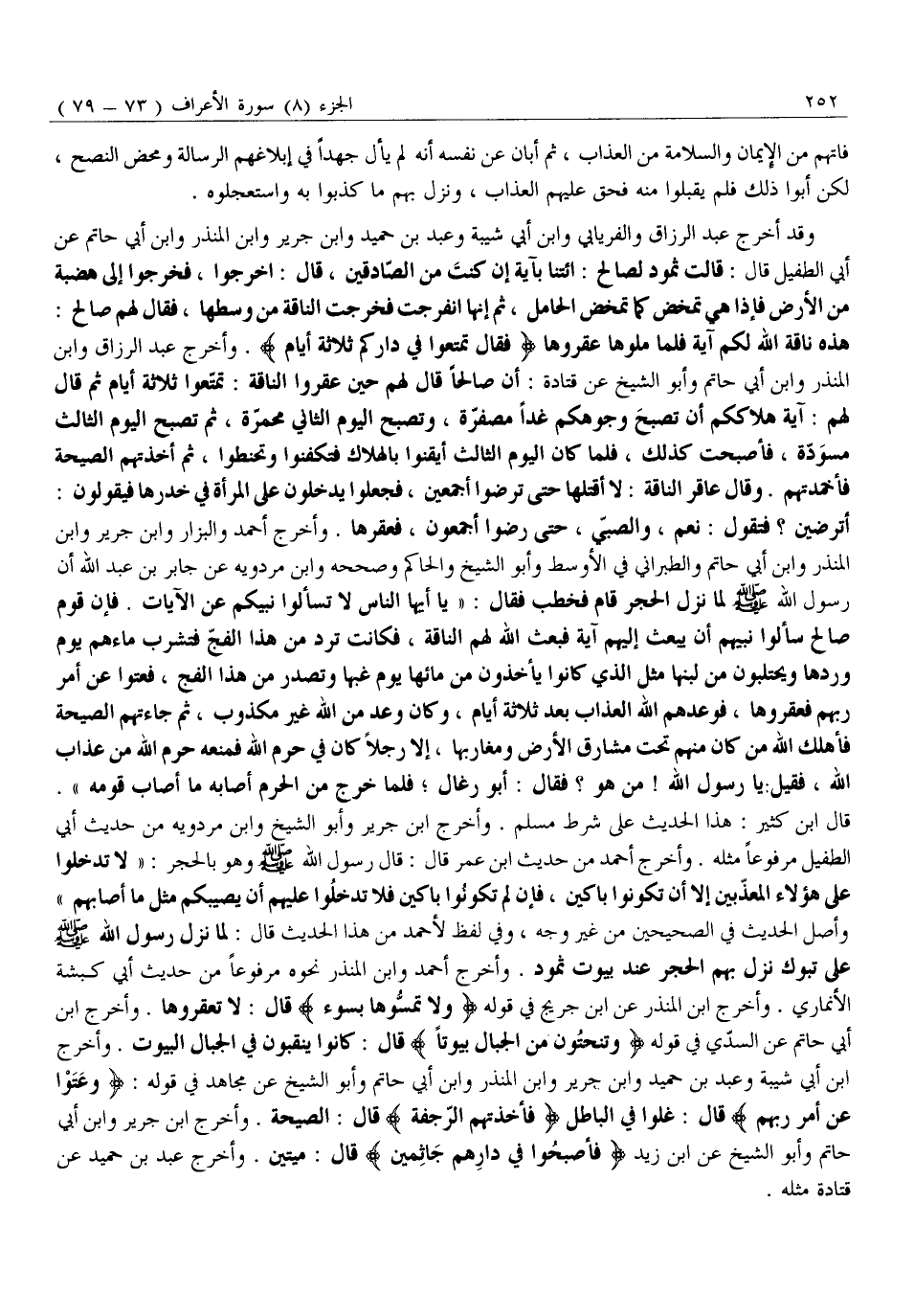 قَالَ ابْنُ كَثِيرٍ: هَذَا الْحَدِيثُ عَلَى شَرْطِ مُسْلِمٍ. وَأَخْرَجَ ابْنُ جَرِيرٍ وَأَبُو الشَّيْخِ وَابْنُ مَرْدَوَيْهِ مِنْ حَدِيثِ أَبِي الطُّفَيْلِ مَرْفُوعًا مِثْلَهُ. وَأَخْرَجَ أَحْمَدُ مِنْ حَدِيثِ ابْنِ عُمَرَ قَالَ: قَالَ رَسُولُ اللَّهِ صَلَّى الله عليه وَسَلَّمَ وَهُوَ بِالْحِجْرِ: «لَا تَدْخُلُوا عَلَى هَؤُلَاءِ الْمُعَذَّبِينَ إِلَّا أَنْ تَكُونُوا بَاكِينَ، فَإِنْ لَمْ تَكُونُوا بَاكِينَ فَلَا تَدْخُلُوا عَلَيْهِمْ أَنْ يُصِيبَكُمْ مِثْلُ مَا أَصَابَهُمْ» وَأَصْلُ الْحَدِيثِ فِي الصَّحِيحَيْنِ مِنْ غَيْرِ وَجْهٍ، وَفِي لَفْظٍ لِأَحْمَدَ مِنْ هَذَا الْحَدِيثِ قَالَ: لَمَّا نَزَلَ رَسُولُ اللَّهِ صَلَّى اللَّهُ عَلَيْهِ وَسَلَّمَ عَلَى تَبُوكَ نَزَلَ بِهِمُ الْحِجْرَ عِنْدَ بُيُوتِ ثَمُودَ. وَأَخْرَجَ أَحْمَدُ وَابْنُ الْمُنْذِرِ نَحْوَهُ مَرْفُوعًا مِنْ حَدِيثِ أَبِي كَبْشَةَ الْأَنْمَارِيِّ. وَأَخْرَجَ ابْنُ الْمُنْذِرِ عَنِ ابْنِ جُرَيْجٍ فِي قوله وَلا تَمَسُّوها بِسُوءٍ قَالَ: لَا تَعْقِرُوهَا. وَأَخْرَجَ ابْنُ أَبِي حَاتِمٍ عَنِ السُّدِّيِّ فِي قَوْلِهِ وَتَنْحِتُونَ مِنَ الْجِبالِ بُيُوتاً قَالَ: كَانُوا يَنْقُبُونَ فِي الْجِبَالِ الْبُيُوتَ. وَأَخْرَجَ ابْنُ أَبِي شَيْبَةَ وَعَبْدُ بْنُ حُمَيْدٍ وَابْنُ جَرِيرٍ وَابْنُ الْمُنْذِرِ وَابْنُ أَبِي حَاتِمٍ وَأَبُو الشَّيْخِ عَنْ مُجَاهِدٍ فِي قَوْلِهِ: وَعَتَوْا عَنْ أَمْرِ رَبِّهِمْ قَالَ: غَلَوْا فِي الْبَاطِلِ فَأَخَذَتْهُمُ الرَّجْفَةُ قَالَ: الصَّيْحَةُ. وَأَخْرَجَ ابْنُ جَرِيرٍ وَابْنُ أَبِي حَاتِمٍ وَأَبُو الشَّيْخِ عَنِ ابْنِ زَيْدٍ فَأَصْبَحُوا فِي دارِهِمْ جاثِمِينَ قَالَ: مَيِّتِينَ. وَأَخْرَجَ عَبْدُ بْنُ حُمَيْدٍ عَنْ قَتَادَةَ مِثْلَهُ.