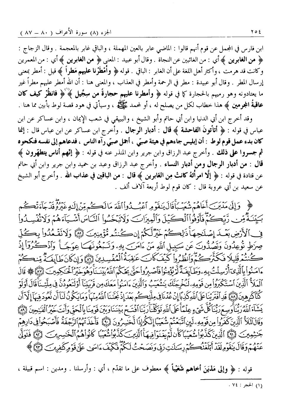 مِنَ الْغابِرِينَ أَيْ: مِنَ الْغَائِبِينَ عَنِ النَّجَاةِ. وَقَالَ اَبُو عُبَيْدٍ: الْمَعْنَى مِنَ الْغابِرِينَ أَيْ: مِنَ الْمُعَمَّرِينَ وَكَانَتْ قَدْ هَرِمَتْ، وَأَكْثَرَ أَهْلُ اللُّغَةِ عَلَى أَنَّ الْغَابِرَ: الْبَاقِي. قَوْلُهُ وَأَمْطَرْنا عَلَيْهِمْ مَطَراً قِيلَ: أَمْطَرَ بِمَعْنَى إِرْسَالِ الْمَطَرِ. وَقَالَ أَبُو عُبَيْدَةَ: مَطَرَ فِي الرَّحْمَةِ وَأَمْطَرَ فِي الْعَذَابِ، وَالْمَعْنَى هُنَا: أَنَّ اللَّهَ أَمْطَرَ عَلَيْهِمْ مَطَرًا غَيْرَ مَا يَعْتَادُونَهُ وَهُوَ رَمْيُهُمْ بِالْحِجَارَةِ كَمَا فِي قَوْلِهِ وَأَمْطَرْنا عَلَيْهِمْ حِجارَةً مِنْ سِجِّيلٍ «1» فَانْظُرْ كَيْفَ كانَ عاقِبَةُ الْمُجْرِمِينَ هَذَا خِطَابٌ لِكُلِّ مَنْ يَصْلُحُ لَهُ، أَوْ لِمُحَمَّدٍ صَلَّى الله عليه وَسَلَّمَ، وَسَيَأْتِي فِي هُودٍ قِصَّةُ لُوطٍ بِأَبْيَنَ مِمَّا هُنَا.