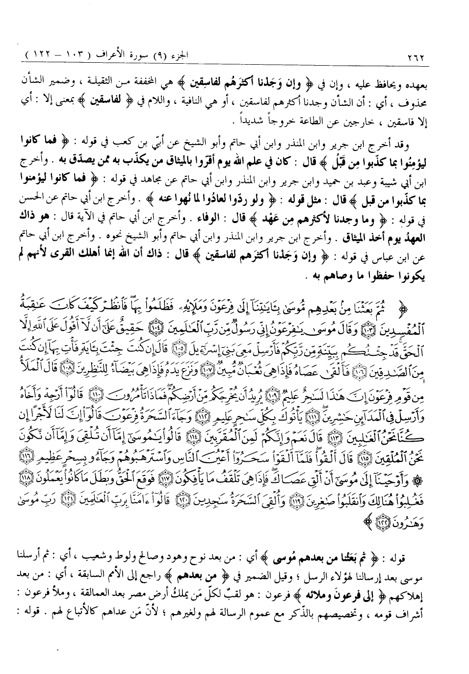 بِعَهْدِهِ وَيُحَافِظُ عَلَيْهِ، وَإِنْ فِي وَإِنْ وَجَدْنا أَكْثَرَهُمْ لَفاسِقِينَ هِيَ الْمُخَفَّفَةُ مِنَ الثَّقِيلَةِ، وَضَمِيرُ الشَّأْنِ مَحْذُوفٌ، أَيْ: أَنَّ الشَّأْنَ وَجَدْنَا أَكْثَرَهُمْ لَفَاسِقِينَ، أَوْ هِيَ النَّافِيَةُ، وَاللَّامُ فِي لَفاسِقِينَ بِمَعْنَى إِلَّا: أَيْ إِلَّا فَاسِقِينَ، خَارِجِينَ عَنِ الطَّاعَةِ خُرُوجًا شَدِيدًا.