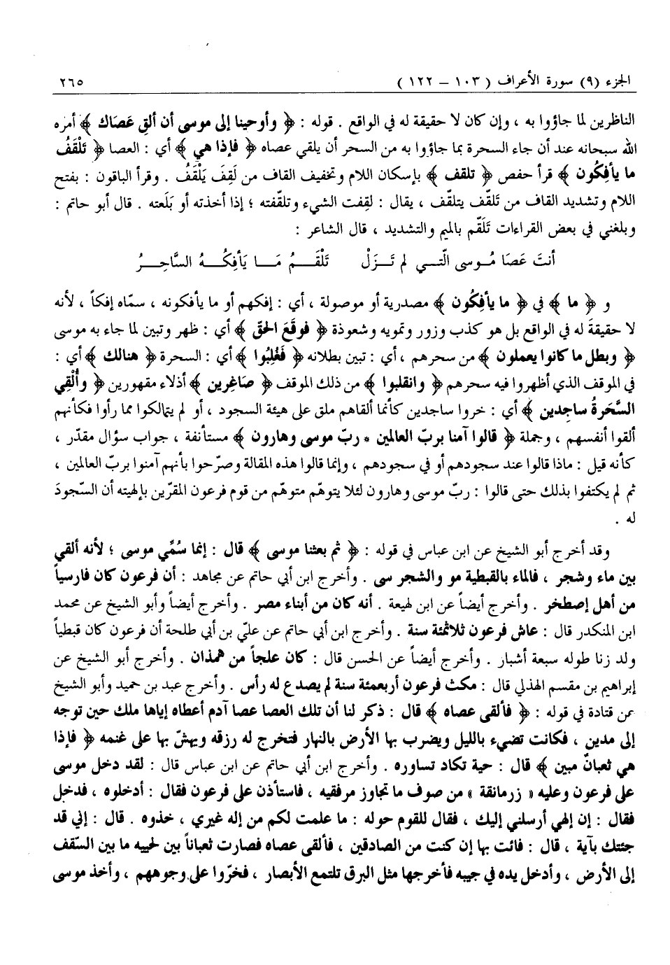 وَقَدْ أَخْرَجَ أَبُو الشَّيْخِ عَنِ ابْنِ عَبَّاسٍ فِي قَوْلِهِ: ثُمَّ بَعَثْنا مُوسى قَالَ: إِنَّمَا سُمِّيَ مُوسَى لِأَنَّهُ أُلْقِيَ بَيْنَ مَاءٍ وَشَجَرٍ، فَالْمَاءُ بِالْقِبْطِيَّةِ مُو وَالشَّجَرُ سِي. وَأَخْرَجَ ابْنُ أَبِي حَاتِمٍ عَنْ مُجَاهِدٍ: أَنَّ فِرْعَوْنَ كَانَ فَارِسِيًّا مِنْ أَهْلِ إِصْطَخْرَ. وَأَخْرَجَ أَيْضًا عَنِ ابْنِ لَهِيعَةَ. أَنَّهُ كَانَ مِنْ أَبْنَاءِ مِصْرَ. وَأَخْرَجَ أَيْضًا وأبو الشيخ عن محمد ابن الْمُنْكَدِرِ قَالَ: عَاشَ فِرْعَوْنُ ثَلَاثَمِائَةِ سَنَةٍ. وَأَخْرَجَ ابْنُ أَبِي حَاتِمٍ عَنْ عَلِيِّ بْنِ أَبِي طَلْحَةَ أَنَّ فِرْعَوْنَ كَانَ قِبْطِيًّا وَلَدَ زِنَا طُولُهُ سَبْعَةُ أَشْبَارٍ. وَأَخْرَجَ أَيْضًا عَنِ الْحَسَنِ قَالَ: كَانَ عِلْجًا مِنْ هَمَذَانَ. وَأَخْرَجَ أَبُو الشَّيْخِ عَنْ إِبْرَاهِيمَ بْنِ مُقْسِمٍ الْهُذَلِيِّ قَالَ: مَكَثَ فِرْعَوْنُ أَرْبَعَمِائَةِ سَنَةٍ لَمْ يُصْدَعْ لَهُ رَأْسٌ. وَأَخْرَجَ عَبْدُ بْنُ حُمَيْدٍ وَأَبُو الشَّيْخِ عَنْ قَتَادَةَ فِي قَوْلِهِ: فَأَلْقى عَصاهُ قَالَ: ذُكِرَ لَنَا أَنَّ تِلْكَ الْعَصَا عَصَا آدَمَ أَعْطَاهُ إِيَّاهَا مَلَكٌ حِينَ تَوَجَّهَ إِلَى مَدْيَنَ، فَكَانَتْ تُضِيءُ بِاللَّيْلِ وَيَضْرِبُ بِهَا الْأَرْضَ بِالنَّهَارِ فَتُخْرِجُ لَهُ رِزْقَهُ وَيَهُشُّ بِهَا عَلَى غَنَمِهِ فَإِذا هِيَ ثُعْبانٌ مُبِينٌ قَالَ: حَيَّةٌ تَكَادُ تُسَاوِرُهُ. وَأَخْرَجَ ابْنُ أَبِي حَاتِمٍ عَنِ ابْنِ عَبَّاسٍ قَالَ: لَقَدْ دَخَلَ مُوسَى عَلَى فِرْعَوْنَ وَعَلَيْهِ «زَرْمَانَقَةٌ» مِنْ صُوفٍ مَا تَجَاوِزُ مِرْفَقَيْهِ، فَاسْتَأْذَنَ عَلَى فِرْعَوْنَ فَقَالَ: أَدْخِلُوهُ، فَدَخَلَ فَقَالَ: إِنَّ إِلَهِي أَرْسَلَنِي إِلَيْكَ، فَقَالَ لِلْقَوْمِ حَوْلَهُ: مَا عَلِمْتُ لَكُمْ مِنْ إِلَهٍ غَيْرِي، خُذُوهُ. قَالَ: إِنِّي قَدْ جِئْتُكَ بِآيَةٍ، قَالَ: فَائِتٌ بِهَا إِنْ كُنْتَ مِنَ الصَّادِقِينَ، فَأَلْقَى عَصَاهُ فَصَارَتْ ثُعْبَانًا بَيْنَ لَحْيَيْهِ مَا بَيْنَ السَّقْفِ إِلَى الْأَرْضِ، وَأَدْخَلَ يَدَهُ فِي جَيْبِهِ فَأَخْرَجَهَا مِثْلَ الْبَرْقِ تَلْتَمِعُ الْأَبْصَارَ، فَخَرُّوا عَلَى وُجُوهِهِمْ، وأخذ موسى