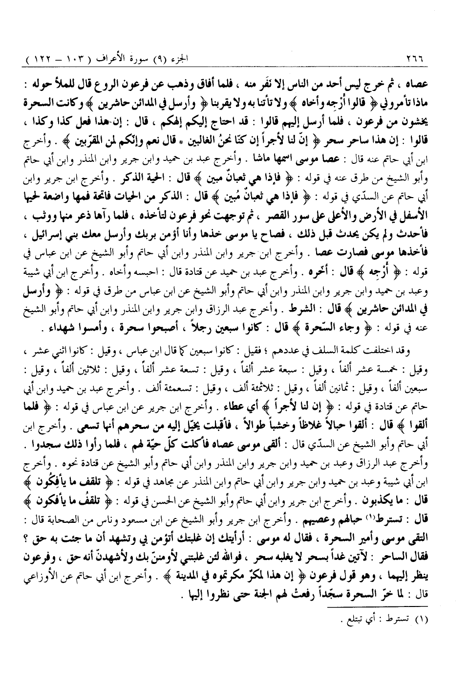 مَاذَا تَأْمُرُونِي قالُوا أَرْجِهْ وَأَخاهُ وَلَا تَأْتِنَا بِهِ وَلَا يَقْرَبُنَا وَأَرْسِلْ فِي الْمَدائِنِ حاشِرِينَ وَكَانَتِ السَّحَرَةُ يَخْشَوْنَ مِنْ فِرْعَوْنَ، فَلَمَّا أَرْسَلَ إِلَيْهِمْ قَالُوا: قَدِ احْتَاجَ إِلَيْكُمْ إِلَهُكُمْ، قَالَ: إِنَّ هَذَا فَعَلَ كَذَا وَكَذَا، قَالُوا: إِنَّ هَذَا سَاحِرٌ سَحَرَ إِنَّ لَنا لَأَجْراً إِنْ كُنَّا نَحْنُ الْغالِبِينَ- قالَ نَعَمْ وَإِنَّكُمْ لَمِنَ الْمُقَرَّبِينَ. وَأَخْرَجَ ابْنُ أَبِي حَاتِمٍ عَنْهُ قَالَ: عَصَا مُوسَى اسْمُهَا مَاشَا. وَأَخْرَجَ عَبْدُ بْنُ حُمَيْدٍ وَابْنُ جَرِيرٍ وَابْنُ الْمُنْذِرِ وَابْنُ أَبِي حَاتِمٍ وَأَبُو الشَّيْخِ مِنْ طُرُقٍ عَنْهُ فِي قَوْلِهِ: فَإِذا هِيَ ثُعْبانٌ مُبِينٌ قَالَ: الْحَيَّةُ الذَّكَرُ. وَأَخْرَجَ ابْنُ جَرِيرٍ وَابْنُ أَبِي حَاتِمٍ عَنِ السُّدِّيِّ فِي قَوْلِهِ: فَإِذا هِيَ ثُعْبانٌ مُبِينٌ قَالَ: الذَّكَرُ مِنَ الْحَيَّاتِ فَاتِحَةً فَمَهَا وَاضِعَةً لَحْيَهَا الْأَسْفَلَ فِي الْأَرْضِ وَالْأَعْلَى عَلَى سُورِ الْقَصْرِ، ثُمَّ تَوَجَّهَتْ نَحْوَ فِرْعَوْنَ لِتَأْخُذَهُ، فَلَمَّا رَآهَا ذُعِرَ مِنْهَا وَوَثَبَ، فَأَحْدَثَ وَلَمْ يَكُنْ يُحْدِثُ قَبْلَ ذَلِكَ، فَصَاحَ يَا مُوسَى خُذْهَا وَأَنَا أُؤْمِنُ بِرَبِّكَ وَأُرْسِلُ مَعَكَ بَنِي إِسْرَائِيلَ، فَأَخَذَهَا مُوسَى فَصَارَتْ عَصًا. وَأَخْرَجَ ابْنُ جَرِيرٍ وَابْنُ الْمُنْذِرِ وَابْنُ أَبِي حَاتِمٍ وَأَبُو الشَّيْخِ عَنِ ابْنِ عَبَّاسٍ فِي قَوْلِهِ: أَرْجِهْ قَالَ: أَخِّرْهُ. وَأَخْرَجَ عَبْدُ بْنُ حُمَيْدٍ عَنْ قَتَادَةَ قَالَ: احْبِسْهُ وَأَخَاهُ. وَأَخْرَجَ ابْنُ أَبِي شَيْبَةَ وَعَبْدُ بْنُ حُمَيْدٍ وَابْنُ جَرِيرٍ وَابْنُ الْمُنْذِرِ وَابْنُ أَبِي حَاتِمٍ وَأَبُو الشَّيْخِ عَنِ ابْنِ عَبَّاسٍ مِنْ طُرُقٍ فِي قَوْلِهِ: وَأَرْسِلْ فِي الْمَدائِنِ حاشِرِينَ قَالَ: الشُّرَطُ. وَأَخْرَجَ عَبْدُ الرَّزَّاقِ وَابْنُ جَرِيرٍ وَابْنُ الْمُنْذِرِ وَابْنُ أَبِي حَاتِمٍ وَأَبُو الشَّيْخِ عَنْهُ فِي قَوْلِهِ: وَجاءَ السَّحَرَةُ قَالَ: كَانُوا سَبْعِينَ رَجُلًا، أَصْبَحُوا سَحَرَةً، وَأَمْسَوْا شُهَدَاءَ.
