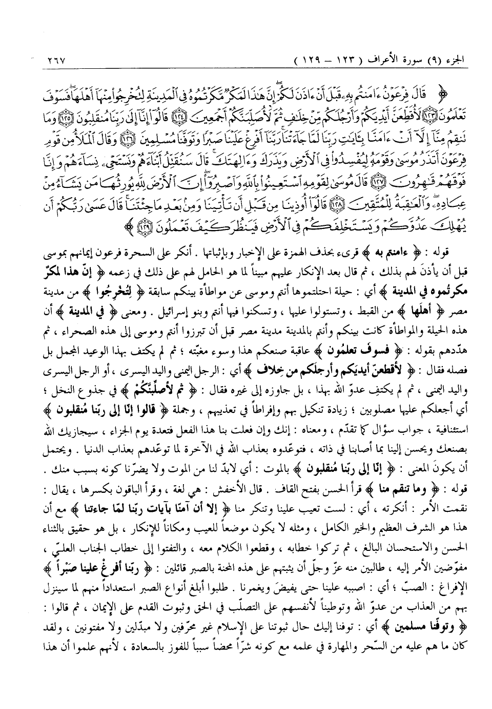 قَوْلُهُ: آمَنْتُمْ بِهِ قُرِئَ بِحَذْفِ الْهَمْزَةِ عَلَى الْإِخْبَارِ وَبِإِثْبَاتِهَا. أَنْكَرَ عَلَى السَّحَرَةِ فِرْعَوْنُ إِيمَانَهُمْ بِمُوسَى قَبْلَ أَنْ يَأْذَنَ لَهُمْ بِذَلِكَ، ثُمَّ قَالَ بَعْدَ الْإِنْكَارِ عَلَيْهِمْ مُبَيِّنًا لِمَا هُوَ الْحَامِلُ لَهُمْ عَلَى ذَلِكَ فِي زَعْمِهِ إِنَّ هَذَا لَمَكْرٌ مَكَرْتُمُوهُ فِي الْمَدِينَةِ أَيْ: حِيلَةً احْتَلْتُمُوهَا أَنْتُمْ وَمُوسَى عَنْ مُوَاطَأَةٍ بَيْنَكُمْ سَابِقَةٍ لِتُخْرِجُوا مِنْ مَدِينَةِ مِصْرَ أَهْلَها مِنَ الْقِبْطِ، وَتَسْتَوْلُوا عَلَيْهَا، وَتَسْكُنُوا فِيهَا أَنْتُمْ وَبَنُو إِسْرَائِيلَ. وَمَعْنَى فِي الْمَدِينَةِ أَنَّ هَذِهِ الْحِيلَةَ وَالْمُوَاطَأَةَ كَانَتْ بَيْنَكُمْ وَأَنْتُمْ بِالْمَدِينَةِ مَدِينَةِ مِصْرَ قَبْلَ أَنْ تَبْرُزُوا أَنْتُمْ وَمُوسَى إِلَى هَذِهِ الصَّحْرَاءِ، ثُمَّ هَدَّدَهُمْ بِقَوْلِهِ: فَسَوْفَ تَعْلَمُونَ عَاقِبَةَ صُنْعِكُمْ هَذَا وَسُوءَ مَغَبَّتِهِ ثُمَّ لَمْ يَكْتَفِ بِهَذَا الْوَعِيدِ الْمُجْمَلِ بَلْ فَصَّلَهُ فَقَالَ: لَأُقَطِّعَنَّ أَيْدِيَكُمْ وَأَرْجُلَكُمْ مِنْ خِلافٍ أَيِ: الرِّجْلَ الْيُمْنَى وَالْيَدَ الْيُسْرَى، أَوِ الرِّجْلَ الْيُسْرَى وَالْيَدَ الْيُمْنَى، ثُمَّ لَمْ يَكْتَفِ عَدُوُّ اللَّهِ بِهَذَا، بَلْ جَاوَزَهُ إِلَى غَيْرِهِ فَقَالَ: ثُمَّ لَأُصَلِّبَنَّكُمْ فِي جُذُوعِ النَّخْلِ أَيْ أَجْعَلُكُمْ عَلَيْهَا مَصْلُوبِينَ زِيَادَةَ تَنْكِيلٍ بِهِمْ وَإِفْرَاطًا فِي تَعْذِيبِهِمْ، وَجُمْلَةُ قالُوا إِنَّا إِلى رَبِّنا مُنْقَلِبُونَ اسْتِئْنَافِيَّةٌ، جَوَابُ سُؤَالٍ كَمَا تَقَدَّمَ، وَمَعْنَاهُ: إِنَّكَ وَإِنْ فَعَلْتَ بِنَا هَذَا الْفِعْلَ فَتَعُدُّهُ يَوْمَ الْجَزَاءِ، سَيُجَازِيكَ اللَّهُ بِصُنْعِكَ وَيُحْسِنُ إِلَيْنَا بِمَا أَصَابَنَا فِي ذَاتِهِ، فَتَوَعَّدُوهُ بِعَذَابِ اللَّهِ فِي الْآخِرَةِ لَمَّا تَوَعَّدَهُمْ بِعَذَابِ الدُّنْيَا. وَيَحْتَمِلُ أَنْ يَكُونَ الْمَعْنَى: إِنَّا إِلى رَبِّنا مُنْقَلِبُونَ