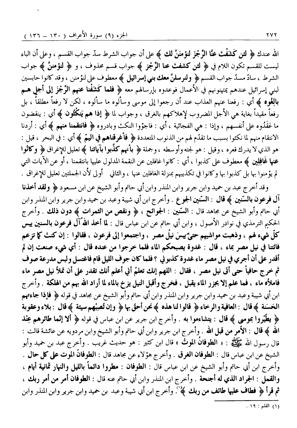 وَقَدْ أَخْرَجَ عَبْدُ بْنُ حُمَيْدٍ وَابْنُ جَرِيرٍ وَابْنُ الْمُنْذِرِ وَابْنُ أَبِي حَاتِمٍ وَأَبُو الشَّيْخِ عَنِ ابْنِ مَسْعُودٍ وَلَقَدْ أَخَذْنا آلَ فِرْعَوْنَ بِالسِّنِينَ قَالَ: السِّنِينُ الْجُوعُ. وَأَخْرَجَ ابْنُ أَبِي شَيْبَةَ وَعَبْدُ بْنُ حُمَيْدٍ وَابْنُ جَرِيرٍ وَابْنُ الْمُنْذِرِ وَابْنُ أَبِي حَاتِمٍ وَأَبُو الشَّيْخِ عَنْ مُجَاهِدٍ قَالَ: السِّنِينُ: الْجَوَائِحُ، وَنَقْصٍ مِنَ الثَّمَراتِ دُونَ ذَلِكَ. وَأَخْرَجَ الْحَكِيمُ التِّرْمِذِيُّ فِي نَوَادِرِ الْأُصُولِ، وَابْنُ أَبِي حَاتِمٍ عَنِ ابْنِ عَبَّاسٍ قَالَ: لَمَّا أَخَذَ اللَّهُ آلَ فِرْعَوْنَ بِالسِّنِينَ يَبِسَ كُلُّ شَيْءٍ لَهُمْ، وَذَهَبَتْ مَوَاشِيهِمْ حَتَّى يَبِسَ نِيلُ مِصْرَ، وَاجْتَمَعُوا إِلَى فِرْعَوْنَ، فَقَالُوا: إِنْ كُنْتَ كَمَا تَزْعُمُ فَائْتِنَا فِي نِيلِ مِصْرَ بِمَاءٍ، قَالَ: غُدْوَةً يُصَبِّحُكُمُ الْمَاءُ فَلَمَّا خَرَجُوا مِنْ عِنْدِهِ قَالَ: أَيُّ شَيْءٍ صَنَعْتُ إِنْ لَمْ أَقْدِرْ عَلَى أَنْ أُجْرِيَ فِي نِيلِ مِصْرَ مَاءً غُدْوَةً كَذَّبُونِي؟ فَلَمَّا كَانَ جَوْفُ اللَّيْلِ قَامَ فَاغْتَسَلَ وَلَبِسَ مَدْرَعَةَ صُوفٍ ثُمَّ خَرَجَ حَافِيًا حَتَّى أَتَى نِيلَ مِصْرَ، فَقَالَ: اللَّهُمَّ إِنَّكَ تَعْلَمُ أَنِّي أَعْلَمُ أَنَّكَ تَقْدِرُ عَلَى أَنْ تَمْلَأَ نِيلَ مِصْرَ مَاءً فَامْلَأْهُ مَاءً، فَمَا عَلِمَ إِلَّا بِجَزْرِ الْمَاءِ يُقْبِلُ، فَخَرَجَ وَأَقْبَلَ النِّيلُ يَزُخُّ بِالْمَاءِ لِمَا أَرَادَ اللَّهُ بِهِمْ مِنَ الْهَلَكَةِ. وَأَخْرَجَ ابْنُ أَبِي شَيْبَةَ وَعَبْدُ بْنُ حُمَيْدٍ وَابْنُ جَرِيرٍ وَابْنُ الْمُنْذِرِ وَابْنُ أَبِي حَاتِمٍ وَأَبُو الشَّيْخِ عَنْ مُجَاهِدٍ فِي قَوْلِهِ فَإِذا جاءَتْهُمُ الْحَسَنَةُ قَالَ: الْعَافِيَةُ وَالرَّخَاءُ قالُوا لَنا هذِهِ نَحْنُ أَحَقُّ بِهَا وَإِنْ تُصِبْهُمْ سَيِّئَةٌ قَالَ: بَلَاءٌ وَعُقُوبَةٌ يَطَّيَّرُوا بِمُوسى قَالَ: يَتَشَاءَمُوا بِهِ. وَأَخْرَجَ ابْنُ جَرِيرٍ عَنِ ابْنِ عَبَّاسٍ فِي قَوْلِهِ أَلا إِنَّما طائِرُهُمْ عِنْدَ اللَّهِ قَالَ: الْأَمْرُ مِنْ قِبَلِ اللَّهِ. وَأَخْرَجَ ابْنُ جَرِيرٍ وَابْنُ أَبِي حَاتِمٍ وَأَبُو الشَّيْخِ وَابْنُ مَرْدَوَيْهِ عَنْ عَائِشَةَ قَالَتْ: