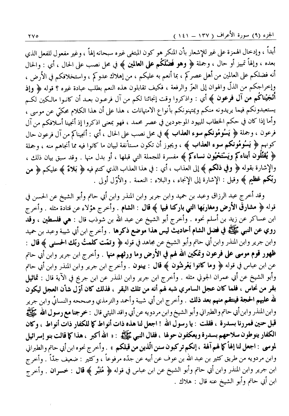 ظُهُورُ قَوْمِ مُوسَى عَلَى فِرْعَوْنَ وَتَمْكِينُ اللَّهِ لَهُمْ فِي الْأَرْضِ وَمَا وَرَّثَهُمْ مِنْهَا. وَأَخْرَجَ ابْنُ جَرِيرٍ وَابْنُ أَبِي حَاتِمٍ عَنِ ابْنِ عَبَّاسٍ فِي قَوْلِهِ وَما كانُوا يَعْرِشُونَ قَالَ: يَبْنُونَ. وَأَخْرَجَ ابْنُ جَرِيرٍ وَابْنُ الْمُنْذِرِ وَابْنُ أَبِي حَاتِمٍ وَأَبُو الشَّيْخِ عَنْ أَبِي عِمْرَانَ الْجَوْنِيِّ مِثْلَهُ. وَأَخْرَجَ ابْنُ جَرِيرٍ وَابْنُ الْمُنْذِرِ عَنْ ابْنُ جُرَيْجٍ فِي الْآيَةِ قَالَ: تَمَاثِيلُ بَقَرٍ مِنْ نُحَاسٍ، فَلَمَّا كَانَ عِجْلُ السَّامِرِيِّ شُبِّهَ لَهُمْ أَنَّهُ مِنْ تِلْكَ الْبَقَرِ، فَذَلِكَ كَانَ أَوَّلَ شَأْنِ الْعِجْلِ لِيَكُونَ لِلَّهِ عَلَيْهِمُ الْحُجَّةُ فَيَنْتَقِمُ مِنْهُمْ بَعْدَ ذَلِكَ. وَأَخْرَجَ ابْنُ أَبِي شَيْبَةَ وَأَحْمَدُ وَالتِّرْمِذِيُّ وَصَحَّحَهُ وَالنَّسَائِيُّ وَابْنُ جَرِيرٍ وَابْنُ الْمُنْذِرِ وَابْنُ أَبِي حَاتِمٍ وَالطَّبَرَانِيُّ وَأَبُو الشَّيْخِ وَابْنُ مَرْدَوَيْهِ عَنْ أَبِي وَاقِدٍ اللَّيْثِيِّ قَالَ: خَرَجْنَا مَعَ رَسُولِ اللَّهِ صَلَّى اللَّهُ عَلَيْهِ وَسَلَّمَ قَبْلَ حُنَيْنٍ فَمَرَرْنَا بِسِدْرَةٍ، فَقُلْتُ: يَا رسول الله! اجعل لنا هذه ذات أنواط كما للكفار ذات أَنْوَاطٍ، وَكَانَ الْكُفَّارُ يَنُوطُونَ سِلَاحَهُمْ بِسِدْرَةٍ وَيَعْكُفُونَ حولها، فقال النبي صلّى الله عليه وَسَلَّمَ: «اللَّهُ أَكْبَرُ، هَذَا كَمَا قَالَتْ بَنُو إِسْرَائِيلَ لِمُوسَى: اجْعَلْ لَنَا إِلَهًا كَمَا لَهُمْ آلِهَةٌ، إِنَّكُمْ تَرْكَبُونَ سَنَنَ الَّذِينَ مِنْ قَبْلِكُمْ» . وَأَخْرَجَ نَحْوَهُ ابْنُ أَبِي حَاتِمٍ وَالطَّبَرَانِيُّ وَابْنُ مَرْدَوَيْهِ مِنْ طَرِيقِ كَثِيرِ بْنِ عَبْدِ اللَّهِ بْنِ عَوْفٍ عَنْ أَبِيهِ عَنْ جَدِّهِ مَرْفُوعًا، وَكَثِيرٌ: ضَعِيفٌ جِدًّا. وَأَخْرَجَ ابْنُ جَرِيرٍ وَابْنُ الْمُنْذِرِ وَابْنُ أَبِي حَاتِمٍ وَأَبُو الشَّيْخِ عَنِ ابْنِ عَبَّاسٍ فِي قَوْلِهِ مُتَبَّرٌ قَالَ: خُسْرَانٌ. وَأَخْرَجَ ابْنُ أَبِي حَاتِمٍ وَأَبُو الشَّيْخِ عَنْهُ قال: هلاك.