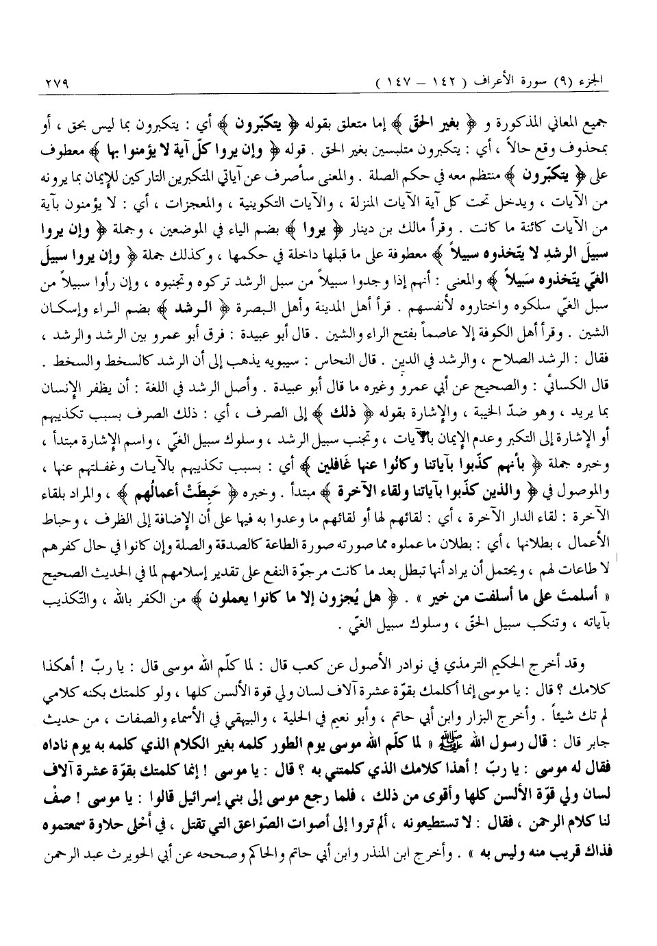 جميع المعاني المذكورة وبِغَيْرِ الْحَقِّ إِمَّا مُتَعَلِّقٌ بِقَوْلِهِ يَتَكَبَّرُونَ أَيْ: يَتَكَبَّرُونَ بِمَا لَيْسَ بِحَقٍّ، أَوْ بِمَحْذُوفٍ وَقَعَ حَالًا، أَيْ: يَتَكَبَّرُونَ مُتَلَبِّسِينَ بِغَيْرِ الْحَقِّ. قَوْلُهُ وَإِنْ يَرَوْا كُلَّ آيَةٍ لَا يُؤْمِنُوا بِها مَعْطُوفٌ عَلَى يَتَكَبَّرُونَ مُنْتَظِمٌ مَعَهُ فِي حُكْمِ الصِّلَةِ. وَالْمَعْنَى سَأَصْرِفُ عَنْ آيَاتِي الْمُتَكَبِّرِينَ التَّارِكِينَ لِلْإِيمَانِ بِمَا يَرَوْنَهُ مِنَ الْآيَاتِ، وَيَدْخُلُ تَحْتَ كُلِّ آيَةٍ الْآيَاتُ الْمُنَزَّلَةُ، وَالْآيَاتُ التَّكْوِينِيَّةُ، وَالْمُعْجِزَاتُ، أَيْ: لَا يُؤْمِنُونَ بِآيَةٍ مِنَ الْآيَاتِ كَائِنَةً مَا كَانَتْ. وَقَرَأَ مَالِكُ بْنُ دِينَارٍ يَرَوْا بِضَمِّ الْيَاءِ فِي الْمَوْضِعَيْنِ، وَجُمْلَةُ وَإِنْ يَرَوْا سَبِيلَ الرُّشْدِ لَا يَتَّخِذُوهُ سَبِيلًا مَعْطُوفَةٌ عَلَى مَا قَبْلَهَا دَاخِلَةٌ فِي حُكْمِهَا، وَكَذَلِكَ جُمْلَةُ وَإِنْ يَرَوْا سَبِيلَ الغَيِّ يَتَّخِذُوهُ سَبِيلًا وَالْمَعْنَى: أَنَّهُمْ إِذَا وَجَدُوا سَبِيلًا مِنْ سُبُلِ الرُّشْدِ تَرَكُوهُ وَتَجَنَّبُوهُ، وَإِنْ رَأَوْا سَبِيلًا مِنْ سُبُلِ الْغَيِّ سَلَكُوهُ وَاخْتَارُوهُ لِأَنْفُسِهِمْ. قَرَأَ أَهْلُ الْمَدِينَةِ وَأَهْلُ الْبَصْرَةِ الرُّشْدِ بِضَمِّ الرَّاءِ وَإِسْكَانِ الشِّينِ. وَقَرَأَ أَهْلُ الْكُوفَةِ إِلَّا عَاصِمًا بِفَتْحِ الرَّاءِ وَالشِّينِ. قَالَ أَبُو عُبَيْدَةَ: فَرَّقَ أَبُو عَمْرٍو بَيْنَ الرَّشَدِ وَالرُّشْدِ، فَقَالَ: الرَّشَدُ الصَّلَاحُ، وَالرُّشْدُ فِي الدِّينِ. قَالَ النَّحَّاسُ: سِيبَوَيْهِ يَذْهَبُ إِلَى أَنَّ الرشد كَالسُّخْطِ وَالسَّخَطِ.
