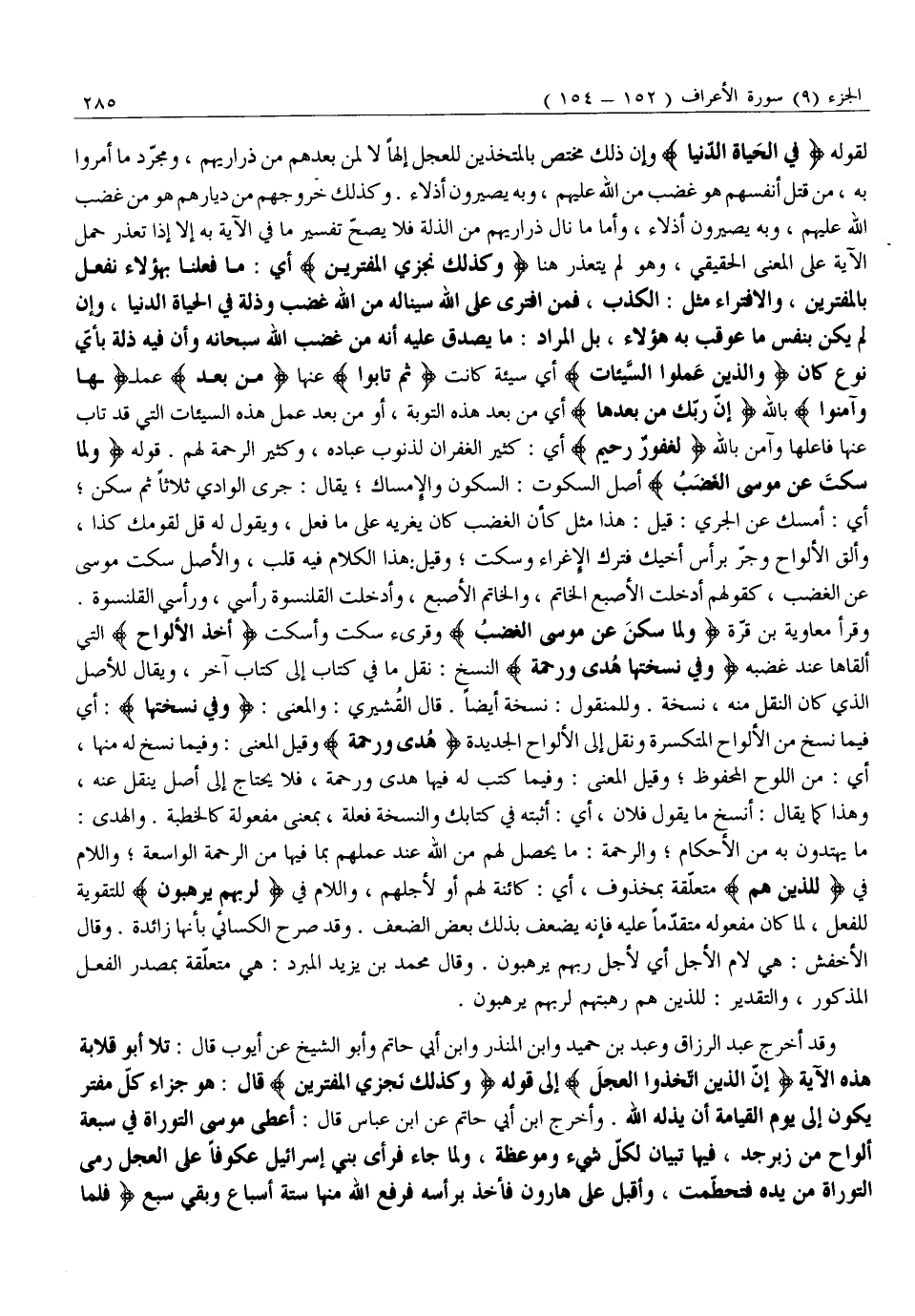 لِقَوْلِهِ فِي الْحَياةِ الدُّنْيا وَإِنَّ ذَلِكَ مُخْتَصٌّ بِالْمُتَّخِذِينَ لِلْعِجْلِ إِلَهًا لَا لِمَنْ بَعْدَهُمْ مِنْ ذَرَارِيهِمْ، وَمُجَرَّدُ مَا أُمِرُوا بِهِ، مِنْ قَتْلِ أَنْفُسِهِمْ هُوَ غَضَبٌ مِنَ اللَّهِ عَلَيْهِمْ، وَبِهِ يَصِيرُونَ أَذِلَّاءَ. وَكَذَلِكَ خُرُوجُهُمْ مِنْ دِيَارِهِمْ هُوَ مِنْ غَضَبِ اللَّهِ عَلَيْهِمْ، وَبِهِ يَصِيرُونَ أَذِلَّاءَ، وَأَمَّا مَا نَالَ ذَرَارِيَهُمْ مِنَ الذِّلَّةِ فَلَا يَصِحُّ تَفْسِيرُ مَا فِي الْآيَةِ بِهِ إِلَّا إِذَا تَعَذَّرَ حَمْلُ الْآيَةِ عَلَى الْمَعْنَى الْحَقِيقِيِّ، وَهُوَ لَمْ يَتَعَذَّرْ هُنَا وَكَذلِكَ نَجْزِي الْمُفْتَرِينَ أي: ما فعلنا بهؤلاء نفعل بالمفترين، والافتراء مثل: الْكَذِبُ، فَمَنِ افْتَرَى عَلَى اللَّهِ سَيَنَالُهُ مِنَ اللَّهِ غَضَبٌ وَذِلَّةٌ فِي الْحَيَاةِ الدُّنْيَا، وَإِنْ لَمْ يَكُنْ بِنَفْسِ مَا عُوقِبَ بِهِ هَؤُلَاءِ، بَلِ الْمُرَادُ: مَا يَصْدُقُ عَلَيْهِ أَنَّهُ مِنْ غَضَبِ اللَّهِ سُبْحَانَهُ وَأَنَّ فِيهِ ذِلَّةً بِأَيِّ نَوْعٍ كَانَ وَالَّذِينَ عَمِلُوا السَّيِّئاتِ أَيَّ سَيِّئَةٍ كَانَتْ ثُمَّ تابُوا عَنْهَا مِنْ بَعْدِ عَمَلِهَا وَآمَنُوا بِاللَّهِ إِنَّ رَبَّكَ مِنْ بَعْدِها أَيْ مِنْ بَعْدِ هَذِهِ التَّوْبَةِ، أَوْ مِنْ بَعْدِ عَمَلِ هَذِهِ السَّيِّئَاتِ الَّتِي قَدْ تَابَ عَنْهَا فَاعِلُهَا وَآمَنَ بِاللَّهِ لَغَفُورٌ رَحِيمٌ أَيْ: كَثِيرُ الْغُفْرَانِ لِذُنُوبِ عِبَادِهِ، وَكَثِيرُ الرَّحْمَةِ لَهُمْ. قَوْلُهُ وَلَمَّا سَكَتَ عَنْ مُوسَى الْغَضَبُ أَصْلُ السُّكُوتِ: السُّكُونُ وَالْإِمْسَاكُ يُقَالُ: جَرَى الْوَادِي ثَلَاثًا ثُمَّ سَكَنَ أَيْ: أَمْسَكَ عَنِ الْجَرْيِ: قِيلَ: هَذَا مَثَلٌ كَأَنَّ الْغَضَبَ كَانَ يُغْرِيهِ عَلَى مَا فَعَلَ، وَيَقُولُ لَهُ قُلْ لِقَوْمِكَ كَذَا، وَأَلْقِ الْأَلْوَاحَ وَجُرَّ بِرَأْسِ أَخِيكَ فَتَرَكَ الْإِغْرَاءَ وَسَكَتَ وَقِيلَ: هَذَا الْكَلَامُ فِيهِ قَلْبٌ، وَالْأَصْلُ سَكَتَ مُوسَى عَنِ الْغَضَبِ، كَقَوْلِهِمْ أَدْخَلْتُ الْأُصْبُعَ الْخَاتَمَ، وَالْخَاتَمَ الْأُصْبُعَ، وَأَدْخَلْتُ الْقَلَنْسُوَةَ رَأْسِي، وَرَأْسِي الْقَلَنْسُوَةَ.