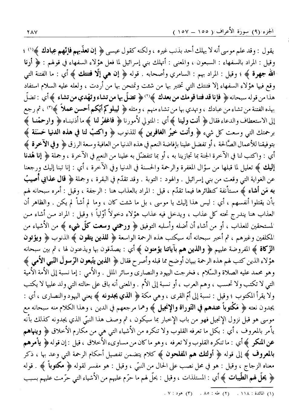 يَقُولُ: وَقَدْ عَلِمَ مُوسَى أَنَّهُ لَا يَهْلِكُ أَحَدٌ بِذَنْبِ غَيْرِهِ، وَلَكِنَّهُ كَقَوْلِ عِيسَى إِنْ تُعَذِّبْهُمْ فَإِنَّهُمْ عِبادُكَ «1» وَقِيلَ: الْمُرَادُ بِالسُّفَهَاءِ: السَّبْعُونَ، والمعنى: أتهلك بني إسرائيل لما فَعَلَ هَؤُلَاءِ السُّفَهَاءُ فِي قَوْلِهِمْ: أَرِنَا اللَّهَ جَهْرَةً وَقِيلَ: الْمُرَادُ بِهِمُ: السَّامِرِيُّ وَأَصْحَابُهُ. قَوْلُهُ إِنْ هِيَ إِلَّا فِتْنَتُكَ أَيْ: مَا الْفِتْنَةُ الَّتِي وَقَعَ فِيهَا هَؤُلَاءِ السُّفَهَاءُ إِلَّا فِتْنَتُكَ الَّتِي تَخْتَبِرُ بِهَا مَنْ شِئْتَ وَتَمْتَحِنُ بِهَا مَنْ أَرَدْتَ، وَلَعَلَّهُ عَلَيْهِ السَّلَامُ اسْتَفَادَ هَذَا مِنْ قَوْلِهِ سُبْحَانَهُ فَإِنَّا قَدْ فَتَنَّا قَوْمَكَ مِنْ بَعْدِكَ «2» تُضِلُّ بِها مَنْ تَشاءُ وَتَهْدِي مَنْ تَشاءُ أَيْ: تُضِلُّ بِهَذِهِ الْفِتْنَةِ مَنْ تَشَاءُ مِنْ عِبَادِكَ، وَتَهْدِي بِهَا مَنْ تَشَاءُ مِنْهُمْ، وَمِثْلُهُ لِيَبْلُوَكُمْ أَيُّكُمْ أَحْسَنُ عَمَلًا «3» ، ثُمَّ رَجَعَ إِلَى الِاسْتِعْطَافِ وَالدُّعَاءِ فَقَالَ أَنْتَ وَلِيُّنا أَيِ: الْمُتَوَلِّي لِأُمُورِنَا فَاغْفِرْ لَنا مَا أَذْنَبْنَاهُ وَارْحَمْنا بِرَحْمَتِكَ الَّتِي وَسِعَتْ كُلَّ شَيْءٍ وَأَنْتَ خَيْرُ الْغافِرِينَ لِلذُّنُوبِ وَاكْتُبْ لَنا فِي هذِهِ الدُّنْيا حَسَنَةً بِتَوْفِيقِنَا لِلْأَعْمَالِ الصَّالِحَةِ، أَوْ تَفَضَّلْ عَلَيْنَا بِإِفَاضَةِ النِّعَمِ فِي هَذِهِ الدُّنْيَا مِنَ الْعَافِيَةِ وَسَعَةِ الرِّزْقِ وَفِي الْآخِرَةِ أَيْ: وَاكْتُبْ لَنَا فِي الْآخِرَةِ الْجَنَّةَ بِمَا تُجَازِينَا بِهِ، أَوْ بِمَا تَتَفَضَّلُ بِهِ عَلَيْنَا مِنَ النَّعِيمِ فِي الْآخِرَةِ، وَجُمْلَةُ إِنَّا هُدْنا إِلَيْكَ تَعْلِيلٌ لِمَا قَبْلَهَا مِنْ سُؤَالِ الْمَغْفِرَةِ وَالرَّحْمَةِ وَالْحَسَنَةِ فِي الدُّنْيَا وَفِي الْآخِرَةِ، أَيْ: إِنَّا تُبْنَا إِلَيْكَ وَرَجَعْنَا عَنِ الْغَوَايَةِ الَّتِي وَقَعَتْ مِنْ بَنِي إِسْرَائِيلَ. وَالْهَوْدُ: التَّوْبَةُ. وَقَدْ تَقَدَّمَ فِي الْبَقَرَةِ، وَجُمْلَةُ قالَ عَذابِي أُصِيبُ بِهِ مَنْ أَشاءُ مُسْتَأْنَفَةٌ كَنَظَائِرِهَا فِيمَا تَقَدَّمَ، قِيلَ: الْمُرَادُ بِالْعَذَابِ هُنَا: الرَّجْفَةُ، وَقِيلَ: أَمْرُهُ سُبْحَانَهُ لَهُمْ بِأَنْ يَقْتُلُوا أَنْفُسَهُمْ، أَيْ: لَيْسَ هَذَا إِلَيْكَ يَا مُوسَى، بَلْ مَا شِئْتُ كَانَ، وَمَا لَمْ أَشَأْ لَمْ يَكُنْ. وَالظَّاهِرُ أَنَّ الْعَذَابَ هُنَا يَنْدَرِجُ تَحْتَهُ كُلُّ عَذَابٍ، وَيَدْخُلُ فِيهِ عَذَابُ هَؤُلَاءِ دُخُولًا أَوَّلِيًّا وَقِيلَ: الْمُرَادُ مَنْ أَشَاءُ مِنَ الْمُسْتَحِقِّينَ لِلْعَذَابِ، أَوْ مَنْ أَشَاءُ أَنْ أُضِلَّهُ وَأَسْلُبَهُ التَّوْفِيقَ وَرَحْمَتِي وَسِعَتْ كُلَّ شَيْءٍ مِنَ الْأَشْيَاءِ مِنَ الْمُكَلَّفِينَ وَغَيْرِهِمْ، ثُمَّ أَخْبَرَ سُبْحَانَهُ أَنَّهُ سَيَكْتُبُ هَذِهِ الرَّحْمَةَ الْوَاسِعَةَ لِلَّذِينَ يَتَّقُونَ الذُّنُوبَ وَيُؤْتُونَ الزَّكاةَ الْمَفْرُوضَةَ عَلَيْهِمْ وَالَّذِينَ هُمْ بِآياتِنا يُؤْمِنُونَ أَيْ: يُصَدِّقُونَ بِهَا وَيُذْعِنُونَ لَهَا، ثُمَّ بَيَّنَ سُبْحَانَهُ هَؤُلَاءِ الَّذِينَ كَتَبَ لَهُمْ هَذِهِ الرَّحْمَةَ بِبَيَانٍ أَوْضَحَ مِمَّا قَبْلَهُ وَأَصْرَحَ فَقَالَ الَّذِينَ يَتَّبِعُونَ الرَّسُولَ النَّبِيَّ الْأُمِّيَّ وَهُوَ مُحَمَّدٌ عَلَيْهِ الصَّلَاةُ وَالسَّلَامُ، فَخَرَجَتِ الْيَهُودُ وَالنَّصَارَى وَسَائِرُ الْمِلَلِ. وَالْأُمِّيُّ: إِمَّا نِسْبَةٌ إِلَى الْأُمَّةِ الْأُمِّيَّةِ الَّتِي لَا تَكْتُبُ وَلَا تَحْسِبُ، وَهُمُ الْعَرَبُ، أَوْ نِسْبَةٌ إِلَى الْأُمِّ. وَالْمَعْنَى أَنَّهُ بَاقٍ عَلَى حَالَتِهِ الَّتِي وُلِدَ عَلَيْهَا لَ