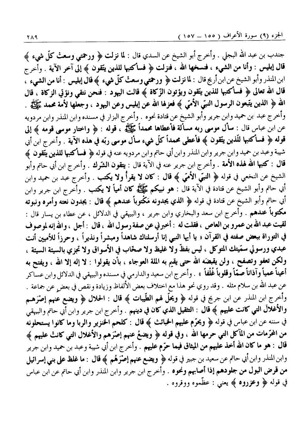 جُنْدَبِ بْنِ عَبْدِ اللَّهِ الْبَجَلِيِّ. وَأَخْرَجَ أَبُو الشَّيْخِ عَنِ السُّدِّيِّ قَالَ: لَمَّا نَزَلَتْ وَرَحْمَتِي وَسِعَتْ كُلَّ شَيْءٍ قَالَ إِبْلِيسُ: وَأَنَا مِنَ الشَّيْءِ، فَنَسَخَهَا اللَّهُ، فَنَزَلَتْ فَسَأَكْتُبُها لِلَّذِينَ يَتَّقُونَ إِلَى آخَرِ الْآيَةِ. وَأَخْرَجَ ابْنُ الْمُنْذِرِ وَأَبُو الشَّيْخِ عَنْ ابن أريج قَالَ: لَمَّا نَزَلَتْ وَرَحْمَتِي وَسِعَتْ كُلَّ شَيْءٍ قَالَ إِبْلِيسُ: أَنَا مِنَ الشَّيْءِ، قَالَ اللَّهُ تَعَالَى فَسَأَكْتُبُها لِلَّذِينَ يَتَّقُونَ وَيُؤْتُونَ الزَّكاةَ قَالَتِ الْيَهُودُ: فَنَحْنُ نَتَّقِي وَنُؤْتِي الزَّكَاةَ، قَالَ اللَّهُ الَّذِينَ يَتَّبِعُونَ الرَّسُولَ النَّبِيَّ الْأُمِّيَّ فَعَزَلَهَا اللَّهُ عَنْ إِبْلِيسَ وَعَنِ الْيَهُودِ، وَجَعَلَهَا لِأَمَةِ مُحَمَّدٍ صَلَّى اللَّهُ عَلَيْهِ وَسَلَّمَ.