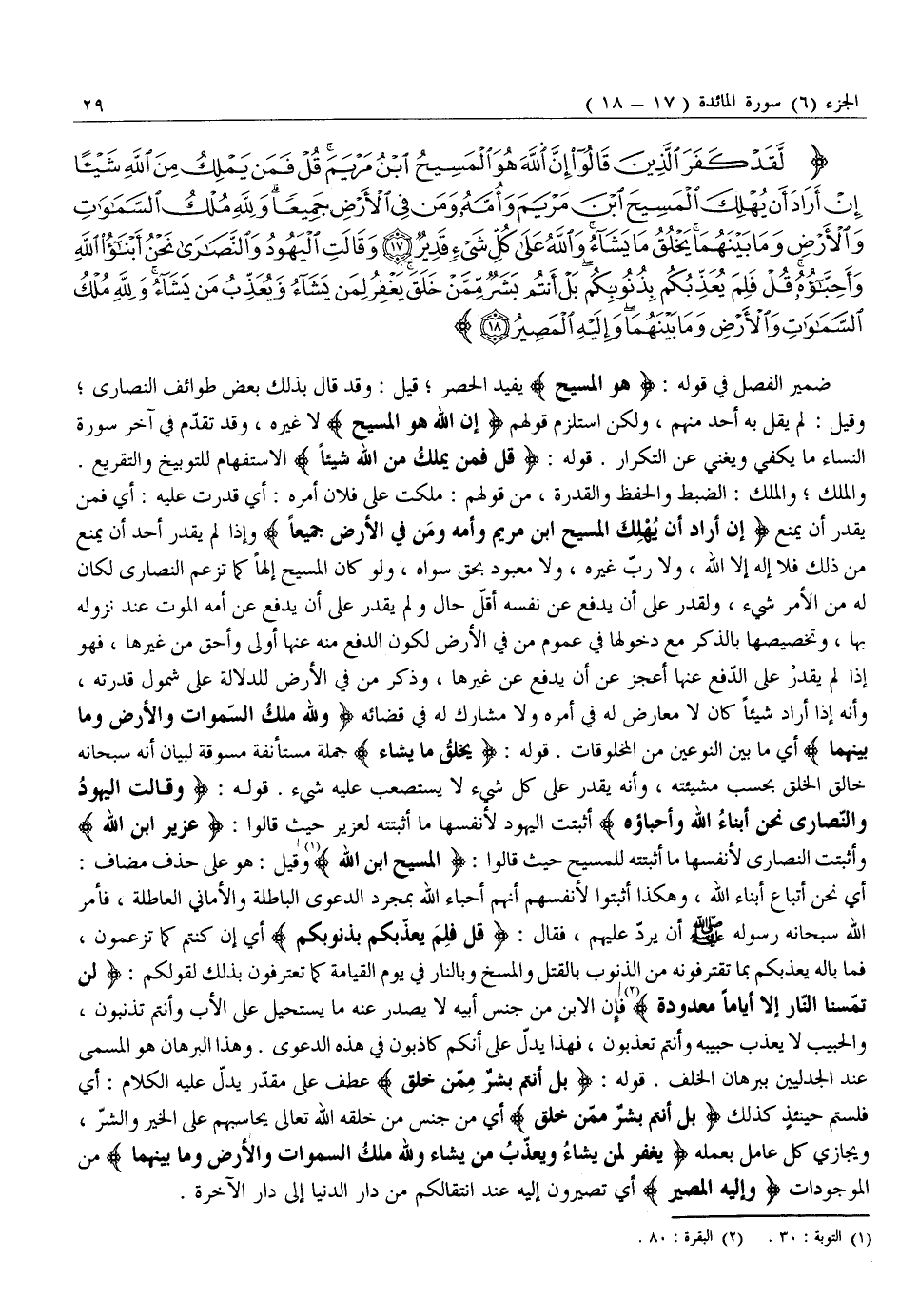 لَقَدْ كَفَرَ الَّذِينَ قالُوا إِنَّ اللَّهَ هُوَ الْمَسِيحُ ابْنُ مَرْيَمَ قُلْ فَمَنْ يَمْلِكُ مِنَ اللَّهِ شَيْئاً إِنْ أَرادَ أَنْ يُهْلِكَ الْمَسِيحَ ابْنَ مَرْيَمَ وَأُمَّهُ وَمَنْ فِي الْأَرْضِ جَمِيعاً وَلِلَّهِ مُلْكُ السَّماواتِ وَالْأَرْضِ وَما بَيْنَهُما يَخْلُقُ مَا يَشاءُ وَاللَّهُ عَلى كُلِّ شَيْءٍ قَدِيرٌ (17) وَقالَتِ الْيَهُودُ وَالنَّصارى نَحْنُ أَبْناءُ اللَّهِ وَأَحِبَّاؤُهُ قُلْ فَلِمَ يُعَذِّبُكُمْ بِذُنُوبِكُمْ بَلْ أَنْتُمْ بَشَرٌ مِمَّنْ خَلَقَ يَغْفِرُ لِمَنْ يَشاءُ وَيُعَذِّبُ مَنْ يَشاءُ وَلِلَّهِ مُلْكُ السَّماواتِ وَالْأَرْضِ وَما بَيْنَهُما وَإِلَيْهِ الْمَصِيرُ (18)