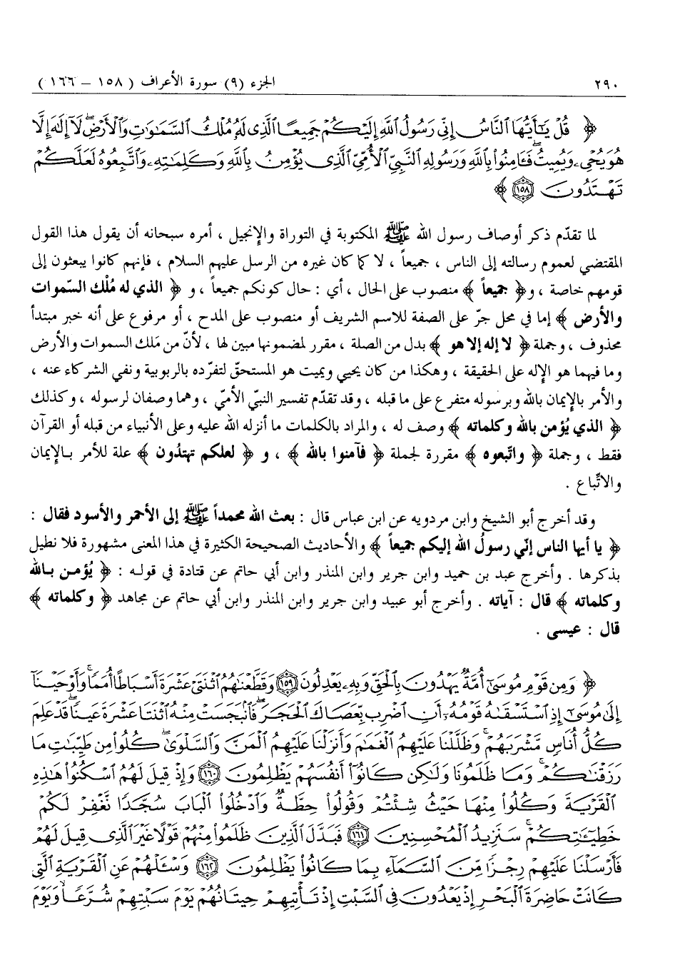 لَمَّا تَقَدَّمَ ذِكْرُ أوصاف رسول الله صلّى الله عليه وَسَلَّمَ الْمَكْتُوبَةِ فِي التَّوْرَاةِ وَالْإِنْجِيلِ، أَمَرَهُ سُبْحَانَهُ أَنْ يَقُولَ هَذَا الْقَوْلَ الْمُقْتَضِي لِعُمُومِ رِسَالَتِهِ إِلَى النَّاسِ، جَمِيعًا، لَا كَمَا كَانَ غَيْرُهُ مِنَ الرُّسُلِ عَلَيْهِمُ السَّلَامُ، فَإِنَّهُمْ كَانُوا يُبْعَثُونَ إِلَى قَوْمِهِمْ خَاصَّةً، وجَمِيعاً مَنْصُوبٌ عَلَى الْحَالِ، أي: حال كونكم جميعا، والَّذِي لَهُ مُلْكُ السَّماواتِ وَالْأَرْضِ إِمَّا فِي مَحَلِّ جَرٍّ عَلَى الصِّفَةِ لِلِاسْمِ الشَّرِيفِ أَوْ مَنْصُوبٌ عَلَى الْمَدْحِ، أَوْ مَرْفُوعٌ عَلَى أَنَّهُ خَبَرُ مُبْتَدَأٍ مَحْذُوفٍ، وَجُمْلَةُ لَا إِلهَ إِلَّا هُوَ بَدَلٌ مِنَ الصِّلَةِ، مُقَرِّرٌ لِمَضْمُونِهَا مُبَيِّنٌ لَهَا، لأنّ من ملك السموات وَالْأَرْضَ وَمَا فِيهِمَا هُوَ الْإِلَهُ عَلَى الْحَقِيقَةِ، وَهَكَذَا مَنْ كَانَ يُحْيِي وَيُمِيتُ هُوَ الْمُسْتَحِقُّ لِتَفَرُّدِهِ بِالرُّبُوبِيَّةِ وَنَفْيِ الشُّرَكَاءِ عَنْهُ، وَالْأَمْرُ بِالْإِيمَانِ بِاللَّهِ وَبِرَسُولِهِ مُتَفَرِّعٌ عَلَى مَا قَبْلَهُ، وَقَدْ تَقَدَّمَ تَفْسِيرُ النَّبِيَّ الْأُمِّيَّ، وَهُمَا وَصْفَانِ لِرَسُولِهِ، وَكَذَلِكَ الَّذِي يُؤْمِنُ بِاللَّهِ وَكَلِماتِهِ وَصْفٌ لَهُ، وَالْمُرَادُ بِالْكَلِمَاتِ مَا أَنْزَلَهُ اللَّهُ عَلَيْهِ وَعَلَى الْأَنْبِيَاءِ مِنْ قَبْلِهِ أَوِ الْقُرْآنُ فَقَطْ، وَجُمْلَةُ وَاتَّبِعُوهُ مُقَرِّرَةٌ لِجُمْلَةِ فَآمِنُوا بِاللَّهِ، ولَعَلَّكُمْ تَهْتَدُونَ عِلَّةٌ لِلْأَمْرِ بِالْإِيمَانِ وَالِاتِّبَاعِ.