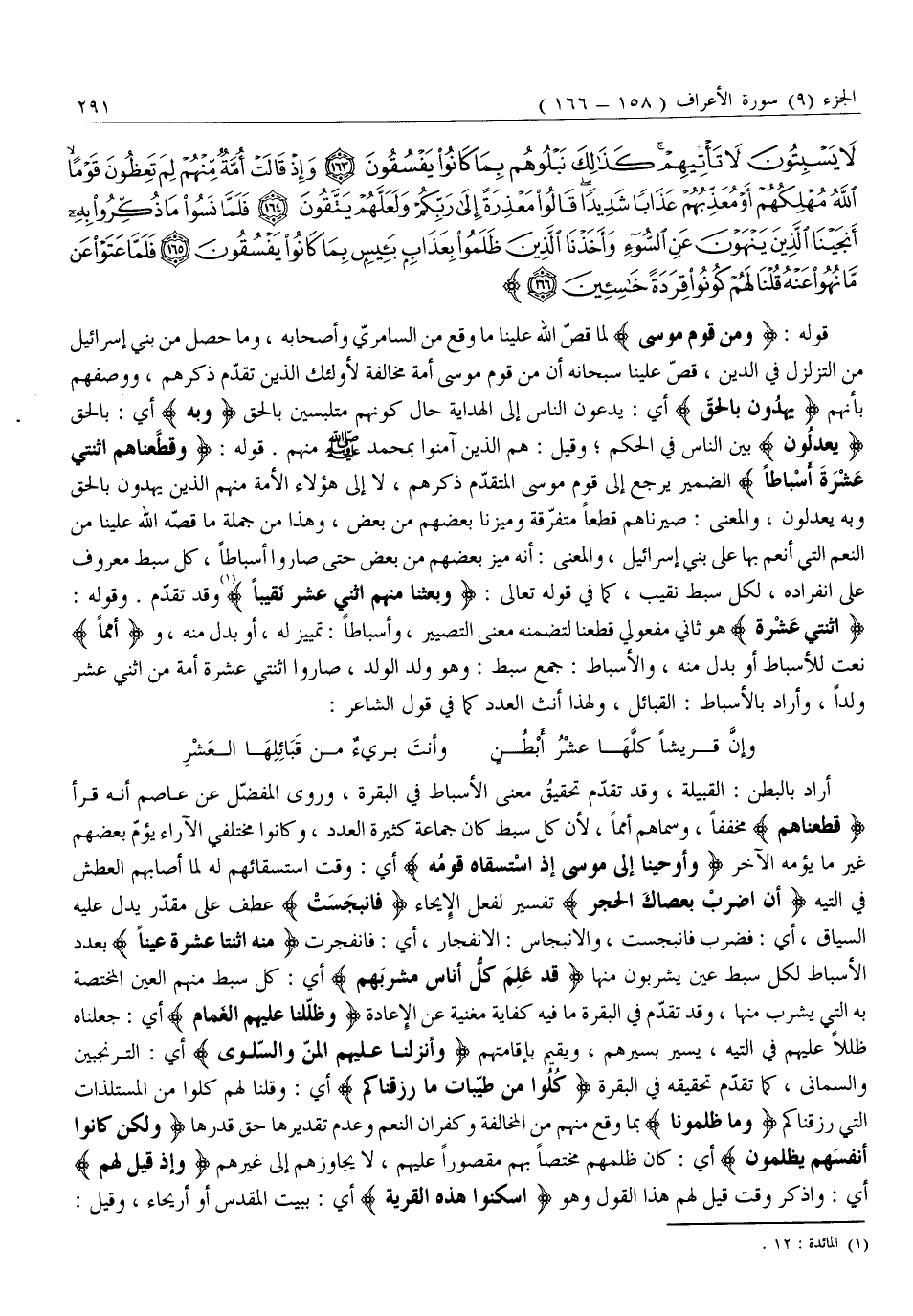 قَوْلُهُ: وَمِنْ قَوْمِ مُوسى لَمَّا قَصَّ اللَّهُ عَلَيْنَا مَا وَقَعَ مِنَ السَّامِرِيِّ وَأَصْحَابِهِ، وَمَا حَصَلَ مِنْ بَنِي إِسْرَائِيلَ مِنَ التَّزَلْزُلِ فِي الدِّينِ، قَصَّ عَلَيْنَا سُبْحَانَهُ أَنَّ مِنْ قَوْمِ مُوسَى أُمَّةً مُخَالِفَةً لِأُولَئِكَ الَّذِينَ تَقَدَّمَ ذِكْرُهُمْ، وَوَصْفُهُمْ بِأَنَّهُمْ يَهْدُونَ بِالْحَقِّ أَيْ: يَدْعُونَ النَّاسَ إِلَى الْهِدَايَةِ حَالَ كَوْنِهِمْ مُتَلَبِّسِينَ بِالْحَقِّ وَبِهِ أَيْ: بِالْحَقِّ يَعْدِلُونَ بَيْنَ النَّاسِ فِي الْحُكْمِ وَقِيلَ: هُمُ الَّذِينَ آمَنُوا بِمُحَمَّدٍ صَلَّى اللَّهُ عَلَيْهِ وَسَلَّمَ مِنْهُمْ. قَوْلُهُ: وَقَطَّعْناهُمُ اثْنَتَيْ عَشْرَةَ أَسْباطاً الضَّمِيرُ يَرْجِعُ إِلَى قَوْمِ مُوسَى الْمُتَقَدِّمِ ذِكْرُهُمْ، لَا إِلَى هَؤُلَاءِ الْأُمَّةِ مِنْهُمُ الَّذِينَ يَهْدُونَ بِالْحَقِّ وَبِهِ يَعْدِلُونَ، وَالْمَعْنَى: صَيَّرْنَاهُمْ قِطَعًا مُتَفَرِّقَةً وَمَيَّزْنَا بَعْضَهُمْ مِنْ بَعْضٍ، وَهَذَا مِنْ جُمْلَةِ مَا قَصَّهُ اللَّهُ عَلَيْنَا مِنَ النِّعَمِ الَّتِي أَنْعَمَ بِهَا عَلَى بَنِي إِسْرَائِيلَ، وَالْمَعْنَى: أَنَّهُ مَيَّزَ بَعْضَهُمْ مِنْ بَعْضٍ حَتَّى صَارُوا أَسْبَاطًا، كُلُّ سِبْطٍ مَعْرُوفٌ عَلَى انْفِرَادِهِ، لِكُلِّ سِبْطٍ نَقِيبٌ، كَمَا فِي قَوْلِهِ تَعَالَى: وَبَعَثْنا مِنْهُمُ اثْنَيْ عَشَرَ نَقِيباً «1» وَقَدْ تَقَدَّمَ. وَقَوْلُهُ: