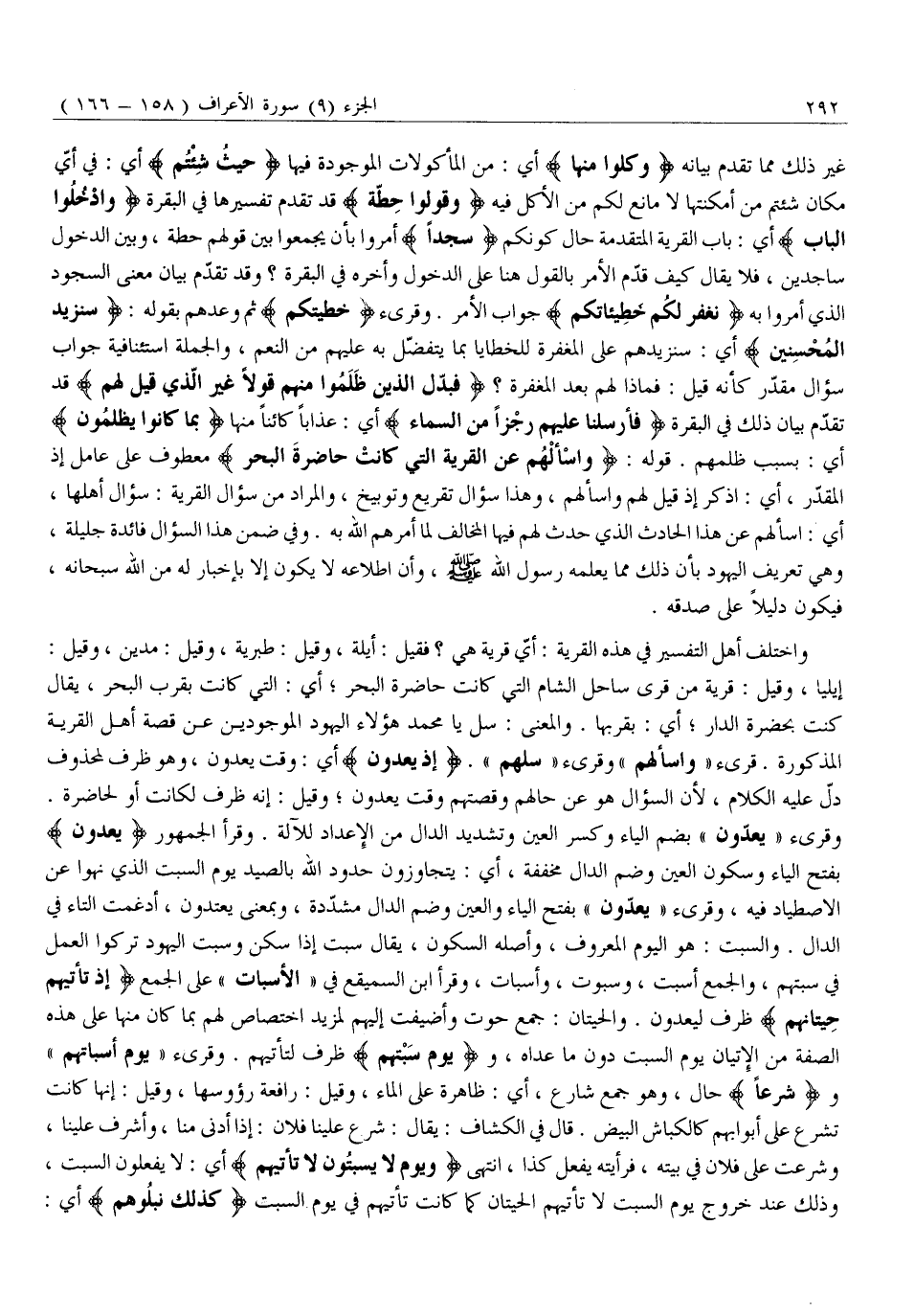 إِيلِيَا، وَقِيلَ: قَرْيَةٌ مِنْ قُرَى سَاحِلِ الشَّامِ الَّتِي كَانَتْ حَاضِرَةَ الْبَحْرِ أَيِ: الَّتِي كَانَتْ بِقُرْبِ الْبَحْرِ، يُقَالُ كُنْتُ بِحَضْرَةِ الدَّارِ أَيْ: بِقُرْبِهَا. وَالْمَعْنَى: سَلْ يَا مُحَمَّدُ هَؤُلَاءِ الْيَهُودَ الْمَوْجُودِينَ عَنْ قِصَّةِ أَهْلِ الْقَرْيَةِ الْمَذْكُورَةِ. قُرِئَ «وَاسْأَلْهُمْ» وَقُرِئَ «سَلْهُمْ» . إِذْ يَعْدُونَ أَيْ: وَقْتَ يَعْدُونَ، وَهُوَ ظَرْفٌ لِمَحْذُوفٍ دَلَّ عَلَيْهِ الْكَلَامُ، لِأَنَّ السُّؤَالَ هُوَ عَنْ حَالِهِمْ وَقِصَّتِهِمْ وَقْتَ يَعْدُونَ وَقِيلَ: إِنَّهُ ظَرْفٌ لِكَانَتْ أَوْ لِحَاضِرَةٍ.