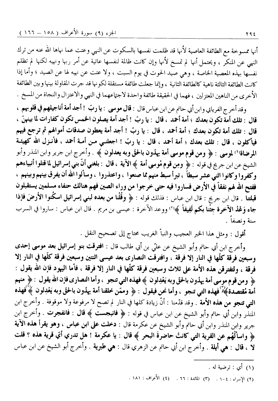 وَمِنْ قَوْمِ مُوسى أُمَّةٌ يَهْدُونَ بِالْحَقِّ وَبِهِ يَعْدِلُونَ فَهَذِهِ الَّتِي تَنْجُو، وَأَمَّا النَّصَارَى فَإِنَّ اللَّهَ يَقُولُ: مِنْهُمْ أُمَّةٌ مُقْتَصِدَةٌ «3» فَهَذِهِ الَّتِي تَنْجُو، وَأَمَّا نَحْنُ فَيَقُولُ: وَمِمَّنْ خَلَقْنا أُمَّةٌ يَهْدُونَ بِالْحَقِّ وَبِهِ يَعْدِلُونَ «4» فَهَذِهِ الَّتِي تَنْجُو مِنْ هَذِهِ الْأُمَّةِ. وَقَدْ قَدَّمْنَا: أَنَّ زِيَادَةَ كُلُّهَا فِي النَّارِ لَمْ تَصِحَّ لَا مَرْفُوعَةً وَلَا مَوْقُوفَةً. وَأَخْرَجَ ابْنُ الْمُنْذِرِ وَابْنُ أَبِي حَاتِمٍ وَأَبُو الشَّيْخِ عَنِ ابْنِ عَبَّاسٍ فِي قَوْلِهِ: فَانْبَجَسَتْ قَالَ: فَانْفَجَرَتْ. وَأَخْرَجَ ابْنُ جَرِيرٍ وَابْنُ الْمُنْذِرِ وَابْنُ أَبِي حَاتِمٍ وَأَبُو الشَّيْخِ عَنْ عِكْرِمَةَ قَالَ: دَخَلْتُ عَلَى ابْنِ عباس، وهو يقرأ هذه الآية وَسْئَلْهُمْ عَنِ الْقَرْيَةِ الَّتِي كانَتْ حاضِرَةَ الْبَحْرِ قَالَ: يَا عِكْرِمَةُ! هَلْ تَدْرِي أَيَّ قَرْيَةٍ هَذِهِ؟ قُلْتُ لَا، قَالَ: هِيَ أَيْلَةُ. وَأَخْرَجَ ابْنُ أَبِي حَاتِمٍ عَنِ الزُّهْرِيِّ قَالَ: هِيَ طَبَرِيَّةُ. وأخرج أبو الشيخ عن ابن عباس