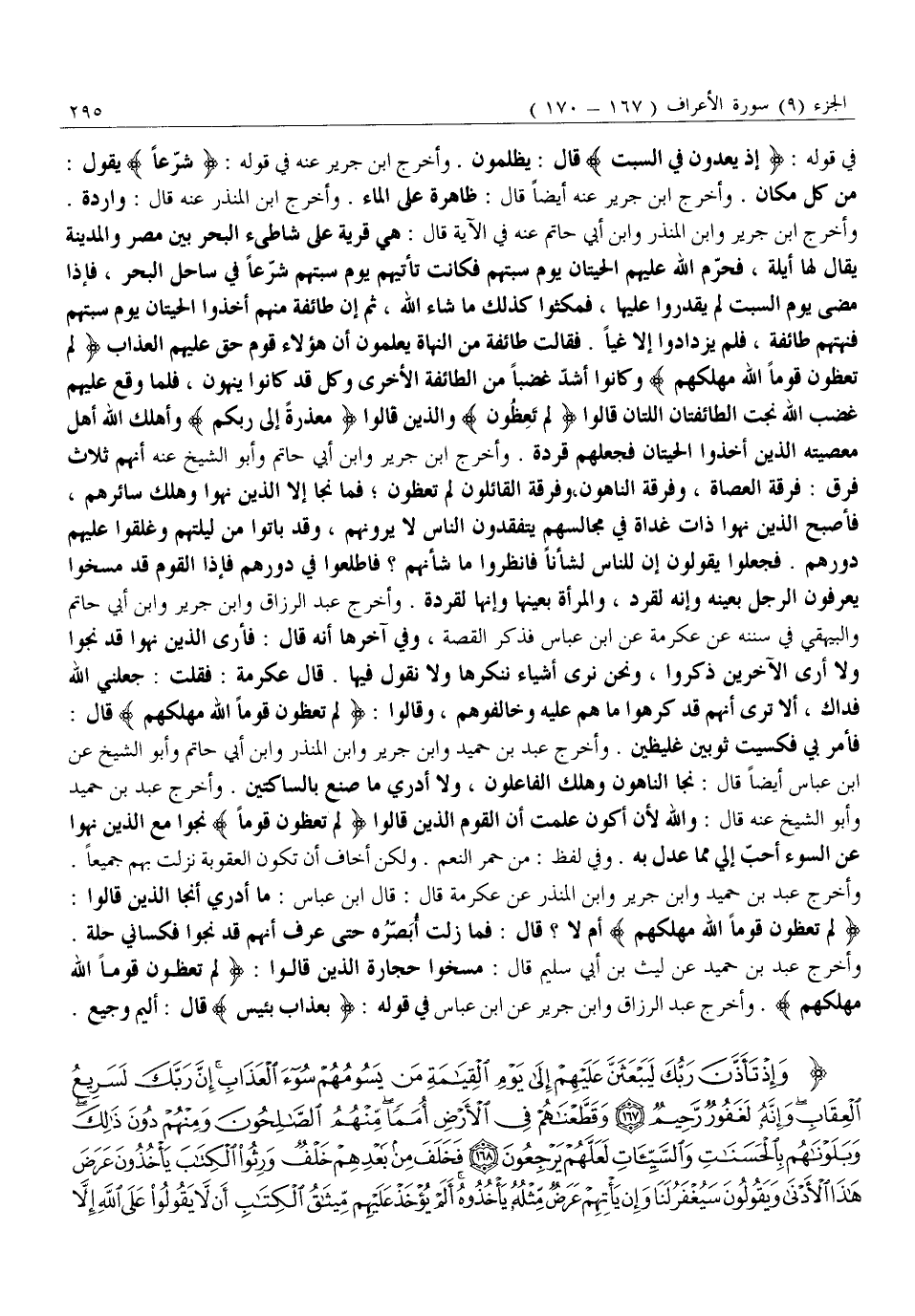 وَأَخْرَجَ ابْنُ جَرِيرٍ وَابْنُ الْمُنْذِرِ وَابْنُ أَبِي حَاتِمٍ عَنْهُ فِي الْآيَةِ قَالَ: هِيَ قَرْيَةٌ عَلَى شَاطِئِ الْبَحْرِ بَيْن مِصْرَ وَالْمَدِينَةِ يُقَالُ لَهَا أَيْلَةُ، فَحَرَّمَ اللَّهُ عَلَيْهِمُ الْحِيتَانَ يَوْمَ سَبْتِهِمْ فَكَانَتْ تَأْتِيهِمْ يَوْمَ سَبْتِهِمْ شُرَّعًا فِي سَاحِلِ الْبَحْرِ، فَإِذَا مَضَى يَوْمُ السَّبْتِ لَمْ يَقْدِرُوا عَلَيْهَا، فَمَكَثُوا كَذَلِكَ مَا شَاءَ اللَّهُ، ثُمَّ إِنَّ طَائِفَةً مِنْهُمْ أَخَذُوا الْحِيتَانَ يَوْمَ سَبْتِهِمْ فَنَهَتْهُمْ طَائِفَةٌ، فَلَمْ يَزْدَادُوا إِلَّا غَيًّا. فَقَالَتْ طَائِفَةٌ مِنَ النُّهَاةِ يَعْلَمُونَ أَنَّ هَؤُلَاءِ قَوْمٌ حَقَّ عَلَيْهِمُ الْعَذَابُ لِمَ تَعِظُونَ قَوْماً اللَّهُ مُهْلِكُهُمْ وَكَانُوا أَشَدَّ غَضَبًا مِنَ الطَّائِفَةِ الْأُخْرَى وَكُلٌّ قَدْ كَانُوا يَنْهَوْنَ، فَلَمَّا وَقَعَ عَلَيْهِمْ غَضَبُ اللَّهِ نَجَتْ الطَّائِفَتَانِ اللَّتَانِ قَالُوا لِمَ تَعِظُونَ وَالَّذِينَ قَالُوا مَعْذِرَةً إِلى رَبِّكُمْ وَأَهْلَكَ اللَّهُ أَهْلَ مَعْصِيَتِهِ الَّذِينَ أَخَذُوا الْحِيتَانَ فَجَعَلَهُمْ قِرَدَةً. وَأَخْرَجَ ابْنُ جَرِيرٍ وَابْنُ أَبِي حَاتِمٍ وَأَبُو الشَّيْخِ عَنْهُ أَنَّهُمْ ثَلَاثُ فِرَقٍ: فِرْقَةُ العصاة، وفرقة الناهون، وفرقة القائلون لِمَ تَعِظُونَ فَمَا نَجَا إِلَّا الَّذِينَ نَهَوْا وَهَلَكَ سَائِرُهُمْ، فَأَصْبَحَ الَّذِينَ نَهَوْا ذَاتَ غَدَاةٍ فِي مَجَالِسِهِمْ يَتَفَقَّدُونَ النَّاسَ لَا يَرَوْنَهُمْ، وَقَدْ بَاتُوا مِنْ لَيْلَتِهِمْ وَغَلَّقُوا عَلَيْهِمْ دُورَهُمْ. فَجَعَلُوا يَقُولُونَ إِنَّ لِلنَّاسِ لَشَأْنًا فَانْظُرُوا مَا شَأْنُهُمْ؟ فَاطَّلَعُوا فِي دَوْرِهِمْ فَإِذَا الْقَوْمُ قَدْ مُسِخُوا يَعْرِفُونَ الرَّجُلَ بِعَيْنِهِ وَإِنَّهُ لَقِرْدٌ، وَالْمَرْأَةَ بِعَيْنِهَا وَإِنَّهَا لَقِرْدَةٌ. وَأَخْرَجَ عَبْدُ الرَّزَّاقِ وَابْنُ جَرِيرٍ وَابْنُ أَبِي حَاتِمٍ وَالْبَيْهَقِيُّ فِي سننه عن عِكْرِمَةَ عَنِ ابْنِ عَبَّاسٍ فَذَكَرَ الْقِصَّةَ، وَفِي آخِرِهَا أَنَّهُ قَالَ: فَأَرَى الَّذِينَ نَهَوْا قَدْ نَجَوْا وَلَا أَرَى الْآخَرِينَ ذُكِرُوا، وَنَحْنُ نَرَى أَشْيَاءَ نُنْكِرُهَا وَلَا نَقُولُ فِيهَا. قَالَ عِكْرِمَةُ: فَقُلْتُ: جَعَلَنِي اللَّهُ فِدَاكَ، أَلَا تَرَى أَنَّهُمْ قَدْ كَرِهُوا مَا هُمْ عَلَيْهِ وَخَالَفُوهُمْ، وَقَالُوا: لِمَ تَعِظُونَ قَوْماً اللَّهُ مُهْلِكُهُمْ قَالَ: