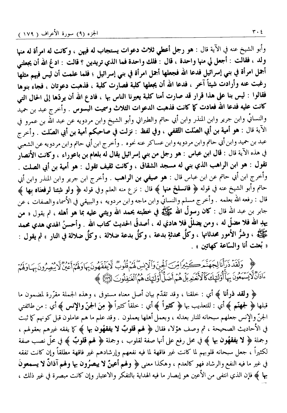 وَأَخْرَجَ ابْنُ أَبِي حَاتِمٍ عَنِ ابْنِ عَبَّاسٍ قَالَ: هُوَ صَيْفِيُّ بْنُ الرَّاهِبِ. وَأَخْرَجَ ابْنُ جَرِيرٍ وَابْنُ الْمُنْذِرِ وَابْنُ أَبِي حَاتِمٍ وَأَبُو الشَّيْخِ عَنْهُ فِي قَوْلِهِ فَانْسَلَخَ مِنْها قَالَ: نُزِعَ مِنْهُ الْعِلْمُ وَفِي قَوْلِهِ وَلَوْ شِئْنا لَرَفَعْناهُ بِها قَالَ: رَفَعَهُ اللَّهُ بِعِلْمِهِ. وَأَخْرَجَ مُسْلِمٌ وَالنَّسَائِيُّ وَابْنُ مَاجَهْ وَابْنُ مَرْدَوَيْهِ، وَالْبَيْهَقِيُّ فِي الْأَسْمَاءِ وَالصِّفَاتِ، عَنْ جَابِرِ بْنِ عَبْدِ اللَّهِ قَالَ: كَانَ رَسُولُ اللَّهِ صَلَّى اللَّهُ عَلَيْهِ وسلم في خُطْبَتِهِ يَحْمَدُ اللَّهَ وَيُثْنِي عَلَيْهِ بِمَا هُوَ أَهْلُهُ، ثُمَّ يَقُولُ «مَنْ يَهْدِ اللَّهُ فَلَا مُضِلَّ لَهُ، وَمَنْ يُضْلِلُ فَلَا هَادِيَ لَهُ، أَصْدَقُ الْحَدِيثِ كِتَابُ اللَّهِ. وَأَحْسَنُ الْهَدْيِ هَدْيُ مُحَمَّدٍ صَلَّى اللَّهُ عَلَيْهِ وَسَلَّمَ، وَشَرُّ الْأُمُورِ محدثاتها، وكلّ محدثة بِدْعَةٌ، وَكُلُّ بِدْعَةٍ ضَلَالَةٌ، وَكُلُّ ضَلَالَةٍ فِي النَّارِ» ثُمَّ يَقُولُ: