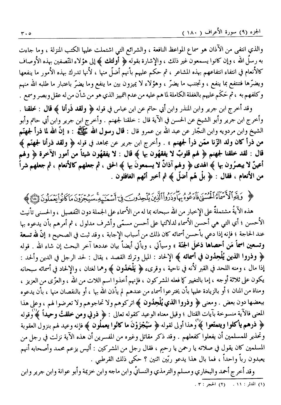 هَذِهِ الْآيَةُ مُشْتَمِلَةٌ عَلَى الْإِخْبَارِ مِنَ اللَّهِ سُبْحَانَهُ بِمَا لَهُ مِنَ الْأَسْمَاءِ عَلَى الْجُمْلَةِ دُونَ التَّفْصِيلِ، وَالْحُسْنَى تَأْنِيثُ الْأَحْسَنِ أَيِ الَّتِي هِيَ أَحْسَنُ الْأَسْمَاءِ لِدَلَالَتِهَا عَلَى أَحْسَنِ مُسَمًّى وَأَشْرَفِ مَدْلُولٍ، ثُمَّ أَمَرَهُمْ بِأَنْ يَدْعُوهُ بِهَا عِنْدَ الْحَاجَةِ فَإِنَّهُ إِذَا دُعِيَ بِأَحْسَنِ أَسْمَائِهِ كَانَ ذَلِكَ مِنْ أَسْبَابِ الْإِجَابَةِ، وَقَدْ ثَبَتَ فِي الصَّحِيحِ «إِنَّ لِلَّهِ تِسْعَةً وَتِسْعِينَ اسْمًا مَنْ أَحْصَاهَا دَخَلَ الْجَنَّةَ» وَسَيَأْتِي، وَيَأْتِي أَيْضًا بَيَانُ عَدَدِهَا آخِرَ الْبَحْثِ إِنْ شَاءَ اللَّهُ. قَوْلُهُ وَذَرُوا الَّذِينَ يُلْحِدُونَ فِي أَسْمائِهِ الْإِلْحَادُ: الْمَيْلُ وَتَرْكُ الْقَصْدِ، يُقَالُ: لَحَدَ الرَّجُلُ فِي الدِّينِ وَأَلْحَدَ: