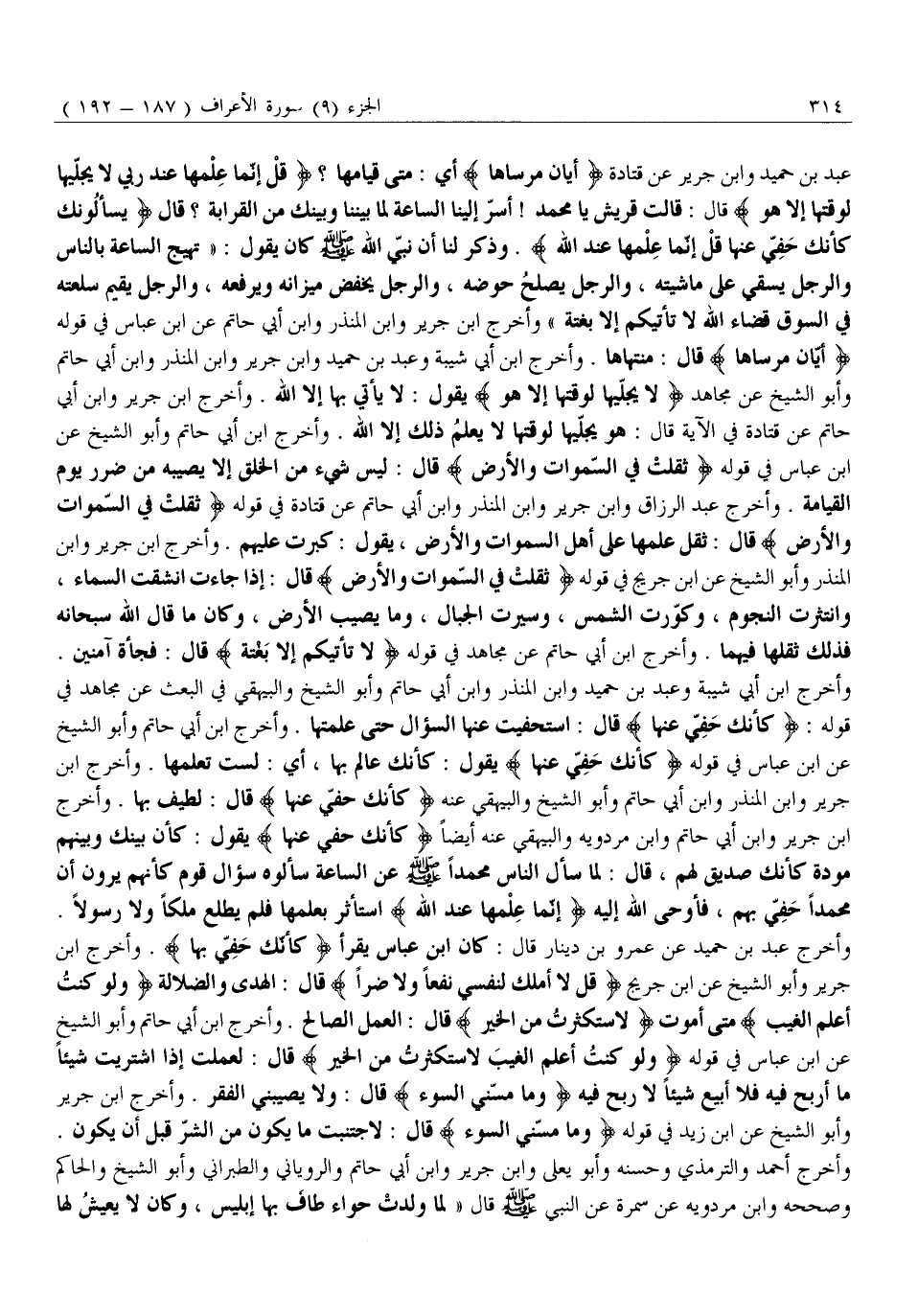 عَبْدُ بْنُ حُمَيْدٍ وَابْنُ جَرِيرٍ عَنْ قَتَادَةَ أَيَّانَ مُرْساها أي: متى قيامها؟ قُلْ إِنَّما عِلْمُها عِنْدَ رَبِّي لَا يُجَلِّيها لِوَقْتِها إِلَّا هُوَ قَالَ: قَالَتْ قُرَيْشٌ يَا مُحَمَّدُ! أَسِرَّ إِلَيْنَا السَّاعَةَ لِمَا بَيْنَنَا وَبَيْنَكَ من القرابة؟ قال يَسْئَلُونَكَ كَأَنَّكَ حَفِيٌّ عَنْها قُلْ إِنَّما عِلْمُها عِنْدَ اللَّهِ. وَذُكِرَ لَنَا أَنَّ نَبِيَّ اللَّهِ صَلَّى اللَّهُ عَلَيْهِ وَسَلَّمَ كَانَ يَقُولُ: «تَهَيِجُ السَّاعَةُ بِالنَّاسِ وَالرَّجُلُ يَسْقِي عَلَى مَاشِيَتِهِ، وَالرَّجُلُ يُصْلِحُ حَوْضَهُ، وَالرَّجُلُ يَخْفِضُ مِيزَانَهُ وَيَرْفَعُهُ، وَالرَّجُلُ يُقِيمُ سِلْعَتَهُ فِي السُّوقِ قَضَاءُ اللَّهِ لَا تَأْتِيكُمْ إِلَّا بَغْتَةً» وَأَخْرَجَ ابْنُ جَرِيرٍ وَابْنُ الْمُنْذِرِ وَابْنُ أَبِي حَاتِمٍ عَنِ ابْنِ عَبَّاسٍ فِي قَوْلِهِ أَيَّانَ مُرْساها قَالَ: مُنْتَهَاهَا. وَأَخْرَجَ ابْنُ أَبِي شَيْبَةَ وَعَبْدُ بْنُ حُمَيْدٍ وَابْنُ جَرِيرٍ وَابْنُ الْمُنْذِرِ وَابْنُ أَبِي حَاتِمٍ وَأَبُو الشَّيْخِ عَنْ مُجَاهِدٍ لَا يُجَلِّيها لِوَقْتِها إِلَّا هُوَ يَقُولُ: لَا يَأْتِي بِهَا إِلَّا اللَّهِ. وَأَخْرَجَ ابْنُ جَرِيرٍ وَابْنُ أَبِي حَاتِمٍ عَنْ قَتَادَةَ فِي الْآيَةِ قَالَ: هُوَ يُجَلِّيهَا لِوَقْتِهَا لَا يَعْلَمُ ذَلِكَ إِلَّا اللَّهُ. وَأَخْرَجَ ابْنُ أَبِي حَاتِمٍ وَأَبُو الشَّيْخِ عَنْ ابْنِ عَبَّاسٍ فِي قَوْلِهِ ثَقُلَتْ فِي السَّماواتِ وَالْأَرْضِ قَالَ: لَيْسَ شَيْءٌ مِنَ الْخَلْقِ إِلَّا يُصِيبُهُ مِنْ ضَرَرِ يَوْمَ الْقِيَامَةِ. وَأَخْرَجَ عَبْدُ الرَّزَّاقِ وَابْنُ جَرِيرٍ وَابْنُ الْمُنْذِرِ وَابْنُ أَبِي حَاتِمٍ عَنْ قَتَادَةَ فِي قَوْلِهِ ثَقُلَتْ فِي السَّماواتِ وَالْأَرْضِ قَالَ: ثقل علمها على أهل السموات وَالْأَرْضِ، يَقُولُ: كَبُرَتْ عَلَيْهِمْ. وَأَخْرَجَ ابْنُ جَرِيرٍ وَابْنُ الْمُنْذِرِ وَأَبُو الشَّيْخِ عَنِ ابْنِ جُرَيْجٍ فِي قَوْلِهِ ثَقُلَتْ فِي السَّماواتِ وَالْأَرْضِ قَالَ: إِذَا جَاءَتِ انْشَقَّتِ السَّمَاءُ، وَانْتَثَرَتِ النُّجُومُ، وَكُوِّرَتِ الشَّمْسُ، وَسُيِّرَتِ الْجِبَالُ، وَمَا يُصِيبُ الْأَرْضَ، وَكَانَ مَا قَالَ اللَّهُ سُبْحَانَهُ فَذَلِكَ ثِقَلُهَا فِيهِمَا. وَأَخْرَجَ ابْنُ أَبِي حَاتِمٍ عَنْ مُجَاهِدٍ فِي قَوْلِهِ لَا تَأْتِيكُمْ إِلَّا بَغْتَةً قَالَ: فَجْأَةً آمِنِينَ.