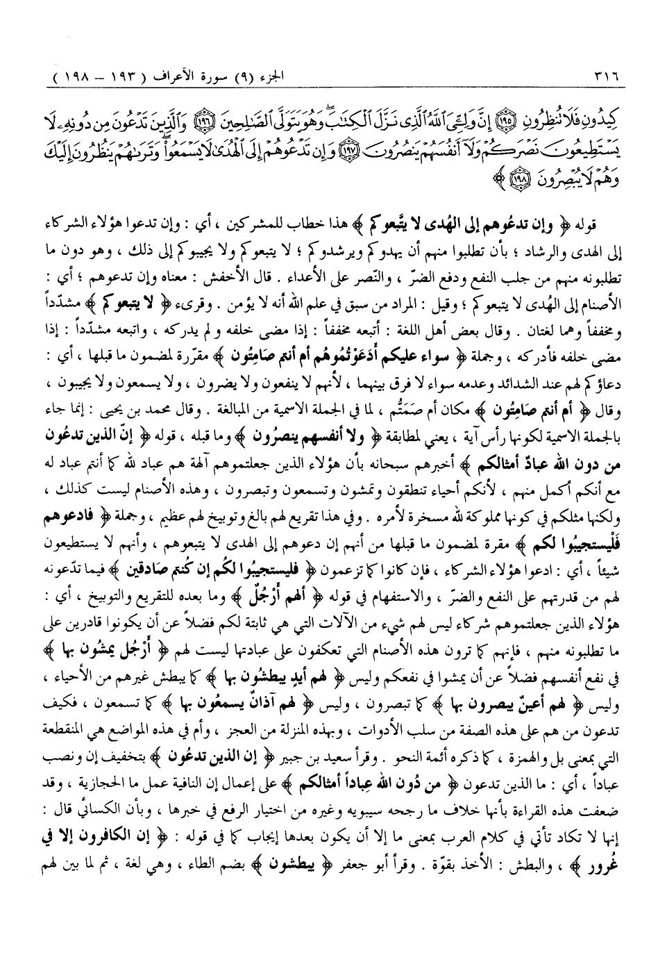 دُعَاؤُكُمْ لَهُمْ عِنْدَ الشَّدَائِدِ وَعَدَمُهُ سَوَاءٌ لَا فَرْقَ بَيْنَهُمَا، لِأَنَّهُمْ لَا يَنْفَعُونَ وَلَا يَضُرُّونَ، وَلَا يَسْمَعُونَ وَلَا يُجِيبُونَ، وَقَالَ أَمْ أَنْتُمْ صامِتُونَ مكان أم صمتم، لِمَا فِي الْجُمْلَةِ الِاسْمِيَّةِ مِنَ الْمُبَالَغَةِ. وَقَالَ مُحَمَّدُ بْنُ يَحْيَى: إِنَّمَا جَاءَ بِالْجُمْلَةِ الِاسْمِيَّةِ لِكَوْنِهَا رَأْسَ آيَةٍ، يَعْنِي لِمُطَابَقَةِ وَلا أَنْفُسَهُمْ يَنْصُرُونَ وَمَا قَبْلَهُ، قَوْلُهُ إِنَّ الَّذِينَ تَدْعُونَ مِنْ دُونِ اللَّهِ عِبادٌ أَمْثالُكُمْ أَخْبَرَهُمْ سُبْحَانَهُ بأن هَؤُلَاءِ الَّذِينَ جَعَلْتُمُوهُمْ آلِهَةً هُمْ عِبَادٌ لِلَّهِ كَمَا أَنْتُمْ عِبَادٌ لَهُ مَعَ أَنَّكُمْ أَكْمَلُ مِنْهُمْ، لِأَنَّكُمْ أَحْيَاءٌ تَنْطِقُونَ وَتَمْشُونَ وَتَسْمَعُونَ وَتُبْصِرُونَ، وَهَذِهِ الْأَصْنَامُ لَيْسَتْ كَذَلِكَ، وَلَكِنَّهَا مِثْلُكُمْ فِي كَوْنِهَا مَمْلُوكَةً لِلَّهِ مُسَخَّرَةً لِأَمْرِهِ. وَفِي هَذَا تَقْرِيعٌ لَهُمْ بَالِغٌ وَتَوْبِيخٌ لَهُمْ عَظِيمٌ، وَجُمْلَةُ فَادْعُوهُمْ فَلْيَسْتَجِيبُوا لَكُمْ مقرة لِمَضْمُونِ مَا قَبْلَهَا مِنْ أَنَّهُمْ إِنْ دَعَوْهُمْ إِلَى الْهُدَى لَا يَتَّبِعُوهُمْ، وَأَنَّهُمْ لَا يَسْتَطِيعُونَ شَيْئًا، أَيِ: ادْعُوا هَؤُلَاءِ الشُّرَكَاءَ، فَإِنْ كَانُوا كَمَا تَزْعُمُونَ فَلْيَسْتَجِيبُوا لَكُمْ إِنْ كُنْتُمْ صادِقِينَ فِيمَا تَدَّعُونَهُ لَهُمْ مِنْ قُدْرَتِهِمْ عَلَى النَّفْعِ وَالضُّرِّ، وَالِاسْتِفْهَامُ فِي قَوْلِهِ أَلَهُمْ أَرْجُلٌ وَمَا بَعْدَهُ لِلتَّقْرِيعِ وَالتَّوْبِيخِ، أَيْ: