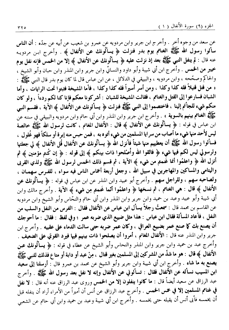 عَنْ سَعْدٍ مِنْ وُجُوهٍ أُخَرَ. وَأَخْرَجَ ابْنُ جَرِيرٍ وَابْنُ مَرْدَوَيْهِ عَنْ عَمْرِو بْنِ شُعَيْبٍ عَنْ أَبِيهِ عَنْ جَدِّهِ: أَنَّ النَّاسَ سَأَلُوا رَسُولَ اللَّهِ صَلَّى اللَّهُ عَلَيْهِ وَسَلَّمَ الْغَنَائِمَ يوم بدر فنزلت يَسْئَلُونَكَ عَنِ الْأَنْفالِ. وأخرج ابن مردويه عَنْهُ قَالَ: لَمْ يَنْفَلِ النَّبِيُّ صَلَّى اللَّهُ عليه وسلّم بعد إذ نزلت عليه يَسْئَلُونَكَ عَنِ الْأَنْفالِ إِلَّا مِنَ الْخُمُسِ فَإِنَّهُ نَفَلَ يَوْمَ خَيْبَرَ مِنَ الْخُمُسِ. وَأَخْرَجَ ابْنُ أَبِي شَيْبَةَ وَأَبُو دَاوُدَ وَالنَّسَائِيُّ وَابْنُ جَرِيرٍ وَابْنُ الْمُنْذِرِ وَابْنُ حِبَّانَ وَأَبُو الشَّيْخِ، وَالْحَاكِمُ وَصَحَّحَهُ، وَابْنُ مَرْدَوَيْهِ، وَالْبَيْهَقِيُّ فِي الدَّلَائِلِ، عَنِ ابْنِ عَبَّاسٍ قَالَ لَمَّا كَانَ يَوْمُ بَدْرٍ قَالَ النَّبِيُّ صَلَّى اللَّهُ عَلَيْهِ وَسَلَّمَ:
