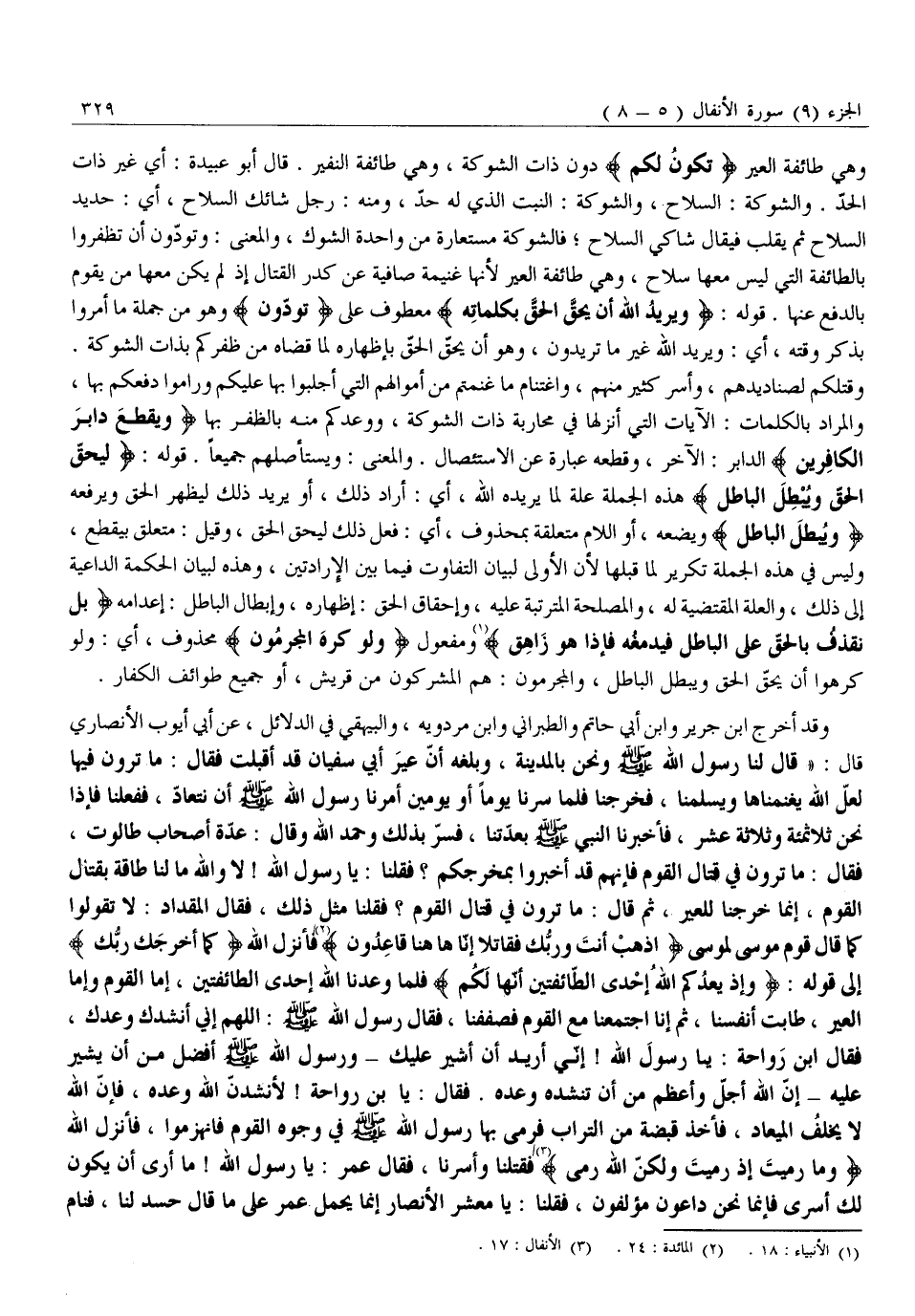 وَهِيَ طَائِفَةُ الْعِيرِ تَكُونُ لَكُمْ دُونَ ذَاتِ الشَّوْكَةِ، وَهِيَ طَائِفَةُ النَّفِيرِ. قَالَ أَبُو عُبَيْدَةَ: أَيْ غَيْرُ ذَاتِ الْحَدِّ. وَالشَّوْكَةُ: السِّلَاحُ، وَالشَّوْكَةُ: النَّبْتُ الَّذِي لَهُ حَدٌّ، وَمِنْهُ: رَجُلٌ شَائِكُ السِّلَاحِ، أَيْ: حَدِيدُ السِّلَاحِ ثُمَّ يُقْلَبُ فَيُقَالُ شَاكِي السِّلَاحِ فَالشَّوْكَةُ مُسْتَعَارَةٌ مِنْ وَاحِدَةِ الشَّوْكِ، وَالْمَعْنَى: وَتَوَدُّونَ أَنْ تَظْفَرُوا بِالطَّائِفَةِ الَّتِي لَيْسَ مَعَهَا سِلَاحٌ، وَهِيَ طَائِفَةُ الْعِيرِ لِأَنَّهَا غَنِيمَةٌ صَافِيَةٌ عَنْ كَدَرِ الْقِتَالِ إِذْ لَمْ يَكُنْ مَعَهَا مَنْ يَقُومُ بِالدَّفْعِ عَنْهَا. قَوْلُهُ: وَيُرِيدُ اللَّهُ أَنْ يُحِقَّ الْحَقَّ بِكَلِماتِهِ مَعْطُوفٌ عَلَى تَوَدُّونَ وَهُوَ مِنْ جُمْلَةِ مَا أُمِرُوا بِذِكْرِ وَقْتِهِ، أَيْ: وَيُرِيدُ اللَّهُ غَيْرَ مَا تُرِيدُونَ، وَهُوَ أَنْ يُحِقَّ الْحَقَّ بِإِظْهَارِهِ لِمَا قَضَاهُ من ظفركم بذات الشوكة.