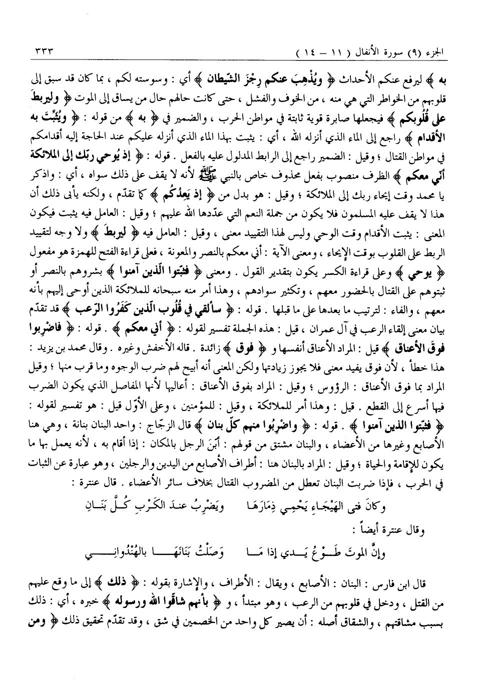 بِهِ لِيَرْفَعَ عَنْكُمُ الْأَحْدَاثَ وَيُذْهِبَ عَنْكُمْ رِجْزَ الشَّيْطانِ أَيْ: وَسْوَسَتَهُ لَكُمْ، بِمَا كَانَ قَدْ سَبَقَ إِلَى قُلُوبِهِمْ مِنَ الْخَوَاطِرِ الَّتِي هِيَ مِنْهُ، مِنَ الْخَوْفِ وَالْفَشَلِ، حَتَّى كَانَتْ حَالُهُمْ حَالَ مَنْ يُسَاقُ إِلَى الْمَوْتِ وَلِيَرْبِطَ عَلى قُلُوبِكُمْ فَيَجْعَلَهَا صَابِرَةً قَوِيَّةً ثَابِتَةً فِي مُوَاطِنِ الْحَرْبِ، وَالضَّمِيرُ فِي بِهِ مِنْ قَوْلِهِ: وَيُثَبِّتَ بِهِ الْأَقْدامَ رَاجِعٌ إِلَى الْمَاءِ الَّذِي أَنْزَلَهُ اللَّهُ، أَيْ: يُثَبِّتُ بِهَذَا الْمَاءِ الَّذِي أَنْزَلَهُ عَلَيْكُمْ عِنْدَ الْحَاجَةِ إِلَيْهِ أَقْدَامَكُمْ فِي مَوَاطِنِ القتال وقيل: الضمير راجع إلى الرابط الْمَدْلُولِ عَلَيْهِ بِالْفِعْلِ. قَوْلُهُ: إِذْ يُوحِي رَبُّكَ إِلَى الْمَلائِكَةِ أَنِّي مَعَكُمْ الظَّرْفُ مَنْصُوبٌ بِفِعْلٍ مَحْذُوفٍ خَاصٍّ بِالنَّبِيِّ صَلَّى اللَّهُ عَلَيْهِ وَسَلَّمَ لِأَنَّهُ لَا يَقِفُ عَلَى ذَلِكَ سِوَاهُ، أَيْ: وَاذْكُرْ يَا مُحَمَّدُ وَقْتَ إِيحَاءِ رَبِّكَ إِلَى الْمَلَائِكَةِ وَقِيلَ: هُوَ بَدَلٌ مِنْ إِذْ يَعِدُكُمُ كَمَا تَقَدَّمَ، وَلَكِنَّهُ يَأْبَى ذَلِكَ أَنَّ هَذَا لَا يَقِفُ عَلَيْهِ الْمُسْلِمُونَ فَلَا يَكُونُ مِنْ جُمْلَةِ النِّعَمِ الَّتِي عَدَّدَهَا اللَّهُ عَلَيْهِمْ وَقِيلَ: الْعَامِلُ فِيهِ يُثَبِّتَ فَيَكُونُ الْمَعْنَى: يُثَبِّتُ الْأَقْدَامَ وَقْتَ الْوَحْيِ وَلَيْسَ لِهَذَا التَّقْيِيدِ مَعْنَى، وَقِيلَ: الْعَامِلُ فِيهِ لِيَرْبِطَ وَلَا وَجْهَ لِتَقْيِيدِ الرَّبْطِ عَلَى الْقُلُوبِ بِوَقْتِ الْإِيحَاءِ، وَمَعْنَى الْآيَةِ: أَنِّي مَعَكُمْ بِالنَّصْرِ وَالْمَعُونَةِ، فَعَلَى قِرَاءَةِ الْفَتْحِ لِلْهَمْزَةِ هُوَ مَفْعُولُ يُوحِي وَعَلَى قِرَاءَةِ الْكَسْرِ يَكُونُ بِتَقْدِيرِ الْقَوْلِ. وَمَعْنَى فَثَبِّتُوا الَّذِينَ آمَنُوا بَشِّرُوهُمْ بِالنَّصْرِ أَوْ ثَبِّتُوهُمْ عَلَى الْقِتَالِ بِالْحُضُورِ مَعَهُمْ، وَتَكْثِيرِ سَوَادِهِمْ، وَهَذَا أَمَرٌ مِنْهُ سُبْحَانَهُ لِلْمَلَائِكَةِ الَّذِينَ أَوْحَى إِلَيْهِمْ بِأَنَّهُ مَعَهُمْ، وَالْفَاءُ: لِتَرْتِيبِ مَا بَعْدَهَا عَلَى مَا قَبْلَهَا. قَوْلُهُ: سَأُلْقِي فِي قُلُوبِ الَّذِينَ كَفَرُوا الرُّعْبَ قَدْ تَقَدَّمَ بَيَانُ مَعْنَى إِلْقَاءِ الرُّعْبِ فِي آلِ عِمْرَانَ، قِيلَ: هَذِهِ الْجُمْلَةُ تَفْسِيرٌ لِقَوْلِهِ: أَنِّي مَعَكُمْ. قَوْلُهُ: فَاضْرِبُوا فَوْقَ الْأَعْناقِ قِيلَ: الْمُرَادُ الْأَعْنَاقُ أنفسها وفَوْقَ زَائِدَةٌ. قَالَهُ الْأَخْفَشُ وَغَيْرُهُ. وَقَالَ مُحَمَّدُ بْنُ يَزِيدَ: