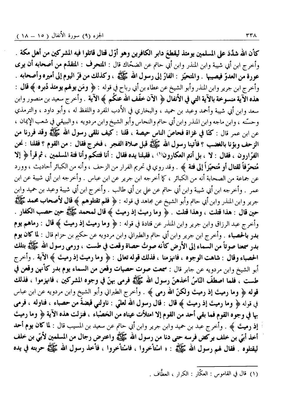 هَذِهِ الْآيَةُ مَنْسُوخَةٌ بِالْآيَةِ الَّتِي فِي الْأَنْفَالِ الْآنَ خَفَّفَ اللَّهُ عَنْكُمْ الْآيَةَ. وَأَخْرَجَ سَعِيدُ بْنُ مَنْصُورٍ وَابْنُ سَعْدٍ وَابْنُ أَبِي شَيْبَةَ وَأَحْمَدُ وَعَبْدُ بْنُ حُمَيْدٍ، وَالْبُخَارِيُّ فِي الْأَدَبِ الْمُفْرَدِ وَاللَّفْظُ لَهُ، وَأَبُو دَاوُدَ، وَالتِّرْمِذِيُّ وَحَسَّنَهُ، وَابْنُ مَاجَهْ وَابْنُ الْمُنْذِرِ وَابْنُ أَبِي حَاتِمٍ وَالنَّحَّاسُ وَأَبُو الشَّيْخِ وَابْنُ مَرْدَوَيْهِ، وَالْبَيْهَقِيُّ فِي شُعَبِ الْإِيمَانِ، عَنِ ابْنِ عُمَرَ قَالَ: كُنَّا فِي غَزَاةٍ فَحَاصَ النَّاسُ حَيْصَةً، قُلْنَا: كَيْفَ نَلْقَى رَسُولَ اللَّهِ صَلَّى اللَّهُ عَلَيْهِ وَسَلَّمَ وَقَدْ فَرَرْنَا مِنَ الزَّحْفِ وبؤنا بالغضب؟ فأتينا رَسُولُ اللَّهِ صَلَّى اللَّهُ عَلَيْهِ وَسَلَّمَ قَبْلَ صَلَاةِ الْفَجْرِ، فَخَرَجَ فَقَالَ: مَنِ الْقَوْمُ؟ فَقُلْنَا: نَحْنُ الْفَرَّارُونَ، فَقَالَ: لَا، بَلْ أَنْتُمُ الْعَكَّارُونَ «1» ، فَقَبَّلْنَا يَدَهُ فَقَالَ: أَنَا فِئَتُكُمْ وَأَنَا فِئَةُ الْمُسْلِمِينَ، ثُمَّ قَرَأَ إِلَّا مُتَحَرِّفاً لِقِتالٍ أَوْ مُتَحَيِّزاً إِلى فِئَةٍ. وَقَدْ رُوِيَ فِي تَحْرِيمِ الْفِرَارِ مِنَ الزَّحْفِ، وَأَنَّهُ مِنَ الْكَبَائِرِ أَحَادِيثُ، وَوَرْدَ عَنْ جَمَاعَةٍ مِنَ الصَّحَابَةِ أَنَّهُ مِنَ الْكَبَائِرِ، كَمَا أَخْرَجَهُ ابْنُ جَرِيرٍ عَنِ ابن عباس. وأخرجه ابن أبي شيبة عن ابن عمر. وأخرجه ابْنُ أَبِي شَيْبَةَ وَابْنُ أَبِي حَاتِمٍ عَنِ عَلِيِّ بْنِ أَبِي طَالِبٍ. وَأَخْرَجَ ابْنُ أَبِي شَيْبَةَ وَعَبْدُ بْنُ حُمَيْدٍ وَابْنُ جَرِيرٍ وَابْنُ الْمُنْذِرِ وَابْنُ أَبِي حَاتِمٍ وأبو الشيخ عن مُجَاهِدٍ فِي قَوْلِهِ: فَلَمْ تَقْتُلُوهُمْ قَالَ لِأَصْحَابِ مُحَمَّدٍ صَلَّى اللَّهُ عَلَيْهِ وَسَلَّمَ حِينَ قَالَ: هَذَا قَتَلْتُ، وَهَذَا قَتَلْتُ. وَما رَمَيْتَ إِذْ رَمَيْتَ قَالَ لِمُحَمَّدٍ صَلَّى اللَّهُ عَلَيْهِ وَسَلَّمَ حِينَ حَصَبَ الْكُفَّارَ.