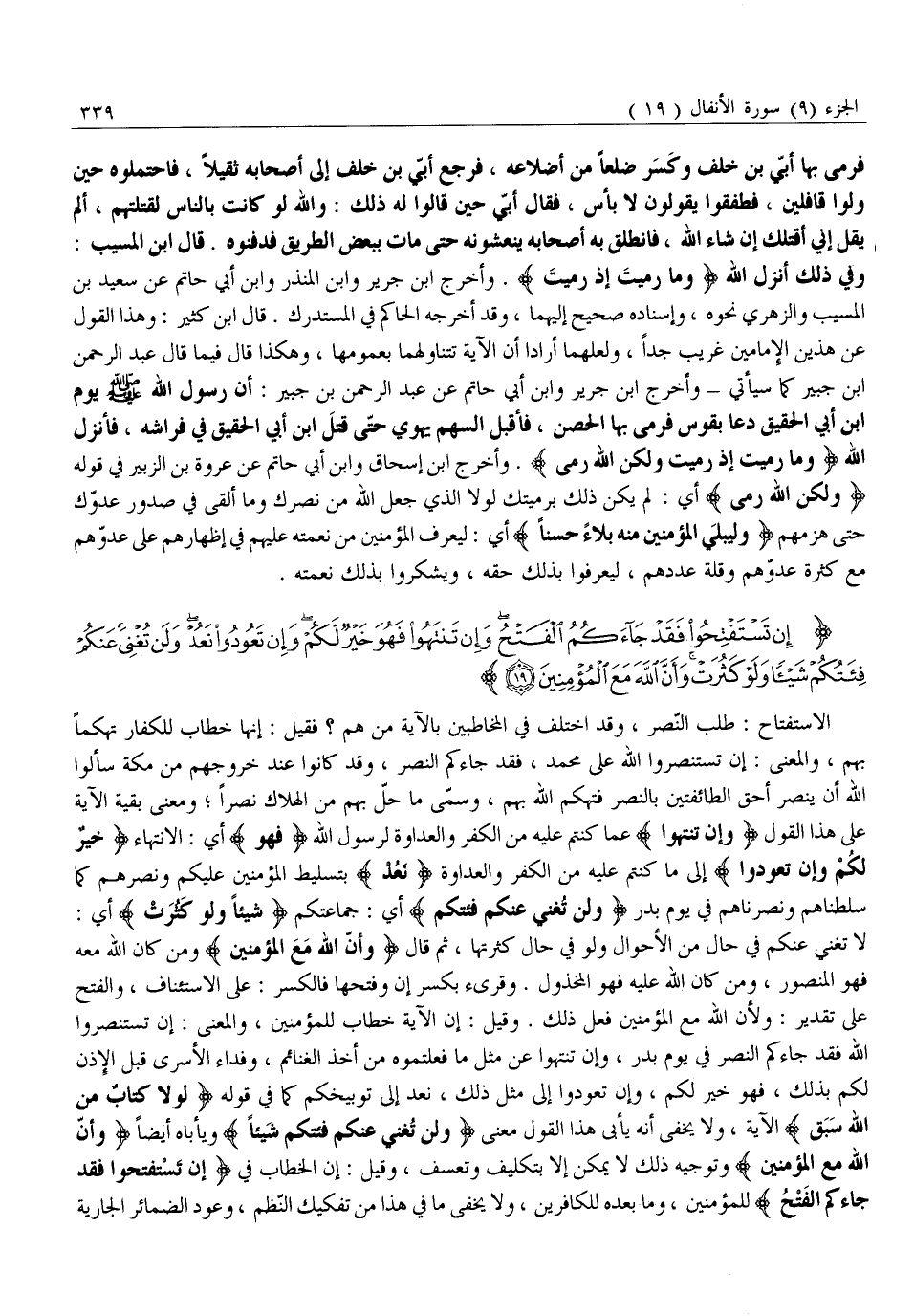 الِاسْتِفْتَاحُ: طَلَبُ النَّصْرِ، وَقَدِ اخْتُلِفَ فِي الْمُخَاطَبِينَ بِالْآيَةِ مَنْ هُمْ؟ فَقِيلَ: إِنَّهَا خِطَابٌ لِلْكُفَّارِ تَهَكُّمًا بِهِمْ، وَالْمَعْنَى: إِنْ تَسْتَنْصِرُوا اللَّهَ عَلَى مُحَمَّدٍ، فَقَدْ جَاءَكُمُ النَّصْرُ، وَقَدْ كَانُوا عِنْدَ خُرُوجِهِمْ مِنْ مَكَّةَ سَأَلُوا اللَّهَ أَنْ يَنْصُرَ أَحَقَّ الطَّائِفَتَيْنِ بِالنَّصْرِ فَتَهَكَّمَ اللَّهُ بِهِمْ، وَسَمَّى مَا حَلَّ بِهِمْ مِنَ الْهَلَاكِ نَصْرًا وَمَعْنَى بَقِيَّةِ الْآيَةِ عَلَى هَذَا الْقَوْلِ وَإِنْ تَنْتَهُوا عَمَّا كُنْتُمْ عَلَيْهِ مِنَ الْكُفْرِ وَالْعَدَاوَةِ لِرَسُولِ اللَّهِ فَهُوَ أَيِ: الِانْتِهَاءُ خَيْرٌ لَكُمْ وَإِنْ تَعُودُوا إِلَى مَا كُنْتُمْ عَلَيْهِ مِنَ الْكُفْرِ وَالْعَدَاوَةِ نَعُدْ بِتَسْلِيطِ الْمُؤْمِنِينَ عَلَيْكُمْ وَنَصْرِهِمْ كَمَا سَلَّطْنَاهُمْ وَنَصَرْنَاهُمْ فِي يَوْمِ بَدْرٍ وَلَنْ تُغْنِيَ عَنْكُمْ فِئَتُكُمْ أَيْ: جَمَاعَتُكُمْ شَيْئاً وَلَوْ كَثُرَتْ أَيْ: