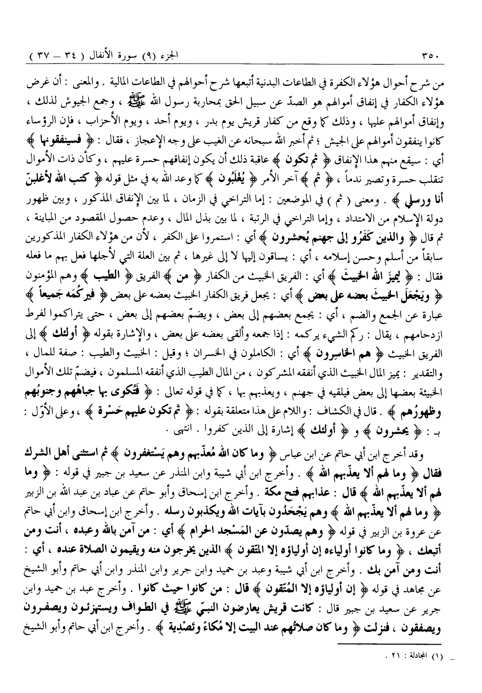 مِنْ شَرْحِ أَحْوَالِ هَؤُلَاءِ الْكَفَرَةِ فِي الطَّاعَاتِ الْبَدَنِيَّةِ أَتْبَعَهَا شَرْحَ أَحْوَالِهِمْ فِي الطَّاعَاتِ الْمَالِيَّةِ. وَالْمَعْنَى: أَنَّ غَرَضَ هَؤُلَاءِ الْكُفَّارِ فِي إِنْفَاقِ أَمْوَالِهِمْ هُوَ الصَّدُّ عَنْ سَبِيلِ الْحَقِّ بِمُحَارَبَةِ رَسُولِ اللَّهِ صَلَّى اللَّهُ عَلَيْهِ وَسَلَّمَ، وَجَمْعِ الْجُيُوشِ لِذَلِكَ، وَإِنْفَاقِ أَمْوَالِهِمْ عَلَيْهَا، وَذَلِكَ كَمَا وَقَعَ مِنْ كُفَّارِ قُرَيْشٍ يَوْمَ بَدْرٍ، وَيَوْمَ أُحُدٍ، وَيَوْمَ الْأَحْزَابِ، فَإِنَّ الرُّؤَسَاءَ كَانُوا يُنْفِقُونَ أَمْوَالَهُمْ عَلَى الْجَيْشِ ثُمَّ أَخْبَرَ اللَّهُ سُبْحَانَهُ عَنِ الْغَيْبِ عَلَى وَجْهِ الْإِعْجَازِ، فَقَالَ: فَسَيُنْفِقُونَها أَيْ: سَيَقَعُ مِنْهُمْ هَذَا الْإِنْفَاقُ ثُمَّ تَكُونُ عَاقِبَةُ ذَلِكَ أَنْ يَكُونَ إِنْفَاقُهُمْ حَسْرَةً عَلَيْهِمْ، وكأن ذات الأموال تنقلب حسرة وتصير ندما، ثُمَّ آخر الأمر يُغْلَبُونَ كَمَا وَعَدَ اللَّهُ بِهِ فِي مِثْلِ قوله كَتَبَ اللَّهُ لَأَغْلِبَنَّ أَنَا وَرُسُلِي. وَمَعْنَى (ثُمَّ) فِي الْمَوْضِعَيْنِ: إِمَّا التَّرَاخِي فِي الزَّمَانِ، لِمَا بَيْنَ الْإِنْفَاقِ الْمَذْكُورِ، وَبَيْنَ ظُهُورِ دَوْلَةِ الْإِسْلَامِ مِنَ الِامْتِدَادِ، وَإِمَّا التَّرَاخِي فِي الرُّتْبَةِ، لِمَا بَيْنَ بَذْلِ الْمَالِ، وَعَدَمِ حُصُولِ الْمَقْصُودِ مِنَ الْمُبَايَنَةِ، ثُمَّ قَالَ وَالَّذِينَ كَفَرُوا إِلى جَهَنَّمَ يُحْشَرُونَ أَيِ: اسْتَمَرُّوا عَلَى الْكُفْرِ، لِأَنَّ مِنْ هَؤُلَاءِ الْكُفَّارِ الْمَذْكُورِينَ سَابِقًا مَنْ أَسْلَمَ وَحَسُنَ إِسْلَامُهُ، أَيْ: يُسَاقُونَ إِلَيْهَا لَا إِلَى غَيْرِهَا، ثُمَّ بَيَّنَ الْعِلَّةَ الَّتِي لِأَجْلِهَا فَعَلَ بِهِمْ مَا فَعَلَهُ فَقَالَ: لِيَمِيزَ اللَّهُ الْخَبِيثَ أَيِ: الْفَرِيقَ الْخَبِيثَ مِنَ الْكُفَّارِ مِنَ الْفَرِيقِ الطَّيِّبِ وَهُمُ الْمُؤْمِنُونَ وَيَجْعَلَ الْخَبِيثَ بَعْضَهُ عَلى بَعْضٍ أَيْ: يَجْعَلَ فَرِيقَ الْكُفَّارِ الْخَبِيثَ بَعْضَهُ عَلَى بَعْضٍ فَيَرْكُمَهُ جَمِيعاً عِبَارَةٌ عَنِ الجمع والضم، أي: يجمع بعضهم إلى بَعْضٍ، وَيَضُمَّ بَعْضَهُمْ إِلَى بَعْضٍ، حَتَّى يَتَرَاكَمُوا لِفَرْطِ ازْدِحَامِهِمْ، يُقَالُ: رَكَمَ الشَّيْءَ يَرْكُمُهُ: إِذَا جَمَعَهُ وَأَلْقَى بَعْضَهُ عَلَى بَعْضٍ، وَالْإِشَارَةُ بِقَوْلِهِ أُولئِكَ إِلَى الْفَرِيقِ الْخَبِيثِ هُمُ الْخاسِرُونَ أَيِ: الْكَامِلُونَ فِي الْخُسْرَانِ وَقِيلَ: الْخَبِيثُ وَالطَّيِّبُ: صِفَةٌ لِلْمَالِ، وَالتَّقْدِيرُ: يَمِيزَ الْمَالَ الْخَبِيثَ الَّذِي أَنْفَقَهُ الْمُشْرِكُونَ، مِنَ الْمَالِ الطَّيِّبِ الَّذِي أَنْفَقَهُ الْمُسْلِمُونَ، فَيَضُمَّ تِلْكَ الْأَمْوَالَ الْخَبِيثَةَ بَعْضَهَا إِلَى بَعْضٍ فيلقيه فِي جَهَنَّمَ، وَيُعَذِّبَهُمْ بِهَا، كَمَا فِي قَوْلِهِ تعالى: فَتُكْوى بِها جِباهُهُمْ وَجُنُوبُهُمْ وَظُهُورُهُمْ. قَالَ فِي الْكَشَّافِ: وَاللَّامُ عَلَى هَذَا مُتَعَلِّقَةٌ بِقَوْلِهِ: ثُمَّ تَكُونُ عَلَيْهِمْ حَسْرَةً، وَعَلَى الْأَوَّلِ:
