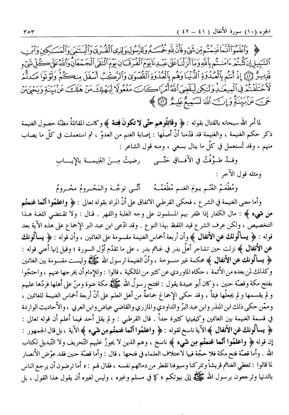 وَاعْلَمُوا أَنَّما غَنِمْتُمْ مِنْ شَيْءٍ فَأَنَّ لِلَّهِ خُمُسَهُ وَلِلرَّسُولِ وَلِذِي الْقُرْبى وَالْيَتامى وَالْمَساكِينِ وَابْنِ السَّبِيلِ إِنْ كُنْتُمْ آمَنْتُمْ بِاللَّهِ وَما أَنْزَلْنا عَلى عَبْدِنا يَوْمَ الْفُرْقانِ يَوْمَ الْتَقَى الْجَمْعانِ وَاللَّهُ عَلى كُلِّ شَيْءٍ قَدِيرٌ (41) إِذْ أَنْتُمْ بِالْعُدْوَةِ الدُّنْيا وَهُمْ بِالْعُدْوَةِ الْقُصْوى وَالرَّكْبُ أَسْفَلَ مِنْكُمْ وَلَوْ تَواعَدْتُمْ لاخْتَلَفْتُمْ فِي الْمِيعادِ وَلكِنْ لِيَقْضِيَ اللَّهُ أَمْراً كانَ مَفْعُولاً لِيَهْلِكَ مَنْ هَلَكَ عَنْ بَيِّنَةٍ وَيَحْيى مَنْ حَيَّ عَنْ بَيِّنَةٍ وَإِنَّ اللَّهَ لَسَمِيعٌ عَلِيمٌ (42)