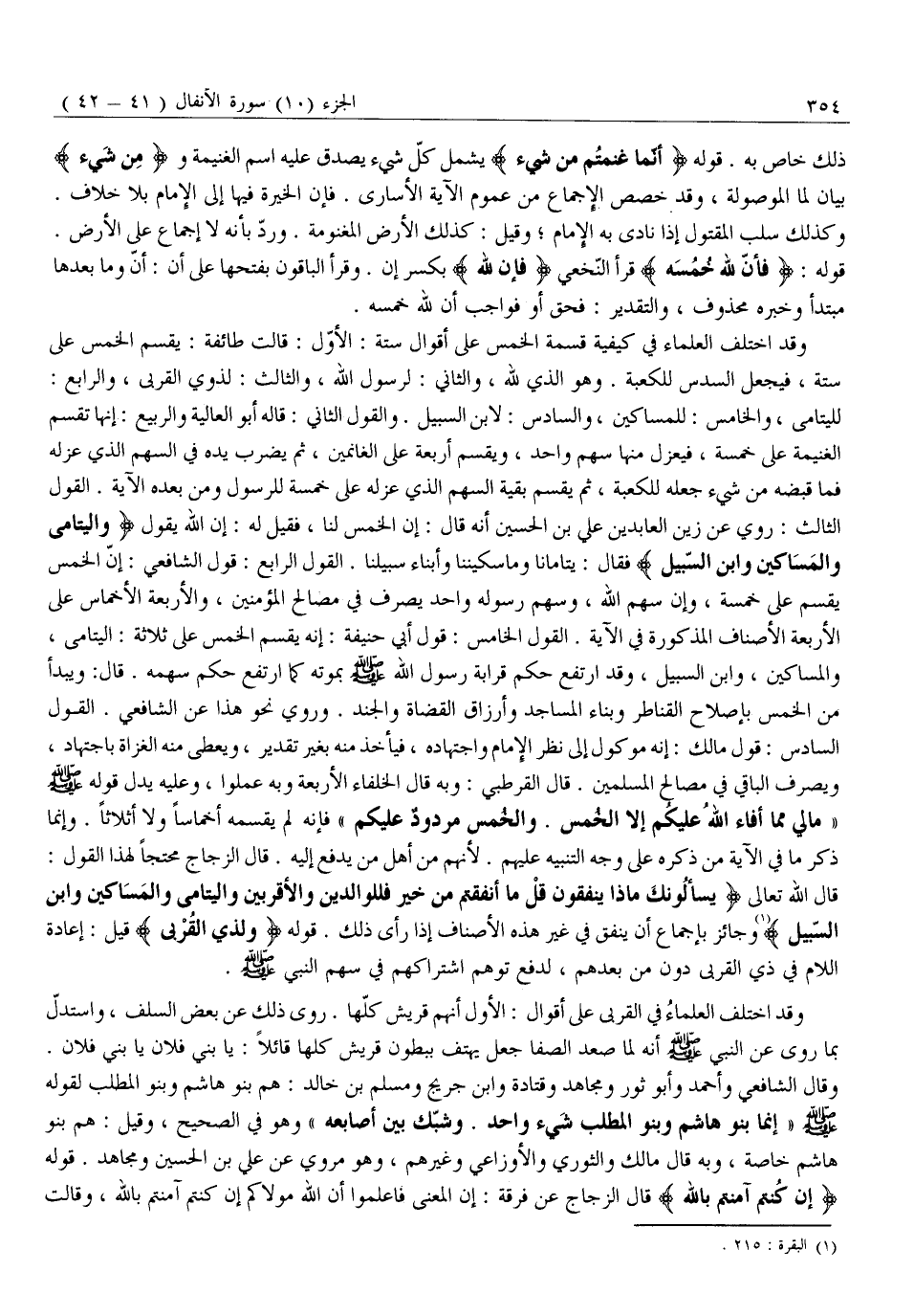 لِلْيَتَامَى، وَالْخَامِسُ: لِلْمَسَاكِينِ، وَالسَّادِسُ: لِابْنِ السَّبِيلِ. وَالْقَوْلُ الثَّانِي: قَالَهُ أَبُو الْعَالِيَةِ وَالرَّبِيعُ: إِنَّهَا تُقَسَّمُ الْغَنِيمَةَ عَلَى خَمْسَةٍ، فَيُعْزَلُ مِنْهَا سَهْمٌ وَاحِدٌ، وَيُقَسَّمُ أَرْبَعَةٌ عَلَى الْغَانِمِينَ، ثُمَّ يَضْرِبُ يَدَهُ فِي السَّهْمِ الَّذِي عَزَلَهُ فَمَا قَبَضَهُ مِنْ شَيْءٍ جَعَلَهُ لِلْكَعْبَةِ، ثُمَّ يُقَسِّمُ بقية السهم الذي عزله على خمسة للرسول ومن بعده الآية. الْقَوْلُ الثَّالِثُ: رُوِيَ عَنْ زَيْنِ الْعَابِدِينَ عَلِيِّ بْنِ الْحُسَيْنِ أَنَّهُ قَالَ: إِنَّ الْخُمُسَ لَنَا، فَقِيلَ لَهُ: إِنَّ اللَّهَ يَقُولُ وَالْيَتامى وَالْمَساكِينِ وَابْنِ السَّبِيلِ فَقَالَ: يَتَامَانَا وَمَسَاكِينِنَا وَأَبْنَاءِ سَبِيلِنَا. الْقَوْلُ الرَّابِعُ: قَوْلُ الشَّافِعِيِّ: إِنَّ الْخُمُسَ يُقَسَّمُ عَلَى خَمْسَةٍ، وَإِنَّ سَهْمَ اللَّهِ، وَسَهْمَ رَسُولِهِ وَاحِدٌ يُصْرَفُ فِي مَصَالِحِ الْمُؤْمِنِينَ، وَالْأَرْبَعَةُ الْأَخْمَاسُ عَلَى الْأَرْبَعَةِ الْأَصْنَافِ الْمَذْكُورَةِ فِي الْآيَةِ. الْقَوْلُ الْخَامِسُ: قَوْلُ أَبِي حَنِيفَةَ: إِنَّهُ يُقَسَّمُ الْخُمُسُ عَلَى ثَلَاثَةٍ: الْيَتَامَى، وَالْمَسَاكِينُ، وَابْنُ السَّبِيلِ، وَقَدِ ارْتَفَعَ حُكْمُ قَرَابَةِ رَسُولِ اللَّهِ صَلَّى اللَّهُ عَلَيْهِ وَسَلَّمَ بِمَوْتِهِ كَمَا ارْتَفَعَ حُكْمُ سَهْمِهِ. قَالَ: وَيَبْدَأُ مِنَ الْخُمُسِ بِإِصْلَاحِ الْقَنَاطِرِ وَبِنَاءِ الْمَسَاجِدِ وَأَرْزَاقِ الْقُضَاةِ وَالْجُنْدِ. وَرُوِيَ نَحْوُ هَذَا عَنِ الشَّافِعِيِّ. الْقَوْلُ السَّادِسُ: قَوْلُ مَالِكٍ: إِنَّهُ مَوْكُولٌ إِلَى نَظَرِ الْإِمَامِ وَاجْتِهَادِهِ، فَيَأْخُذُ مِنْهُ بِغَيْرِ تَقْدِيرٍ، وَيُعْطِي مِنْهُ الْغُزَاةَ بِاجْتِهَادٍ، وَيَصْرِفُ الْبَاقِيَ فِي مَصَالِحِ الْمُسْلِمِينَ. قَالَ الْقُرْطُبِيُّ: وَبِهِ قَالَ الْخُلَفَاءُ الْأَرْبَعَةُ وَبِهِ عَمِلُوا، وَعَلَيْهِ يَدُلُّ قوله صلّى الله عليه وسلّم «مالي مِمَّا أَفَاءَ اللَّهُ عَلَيْكُمْ إِلَّا الْخُمُسُ. وَالْخُمُسُ مَرْدُودٌ عَلَيْكُمْ» فَإِنَّهُ لَمْ يُقَسِّمْهُ أَخْمَاسًا وَلَا أَثْلَاثًا. وَإِنَّمَا ذَكَرَ مَا فِي الْآيَةِ مِنْ ذِكْرِهِ عَلَى وَجْهِ التَّنْبِيهِ عَلَيْهِمْ. لِأَنَّهُمْ مِنْ أهل مَنْ يُدْفَعُ إِلَيْهِ. قَالَ الزَّجَّاجُ مُحْتَجًّا لِهَذَا القول:
