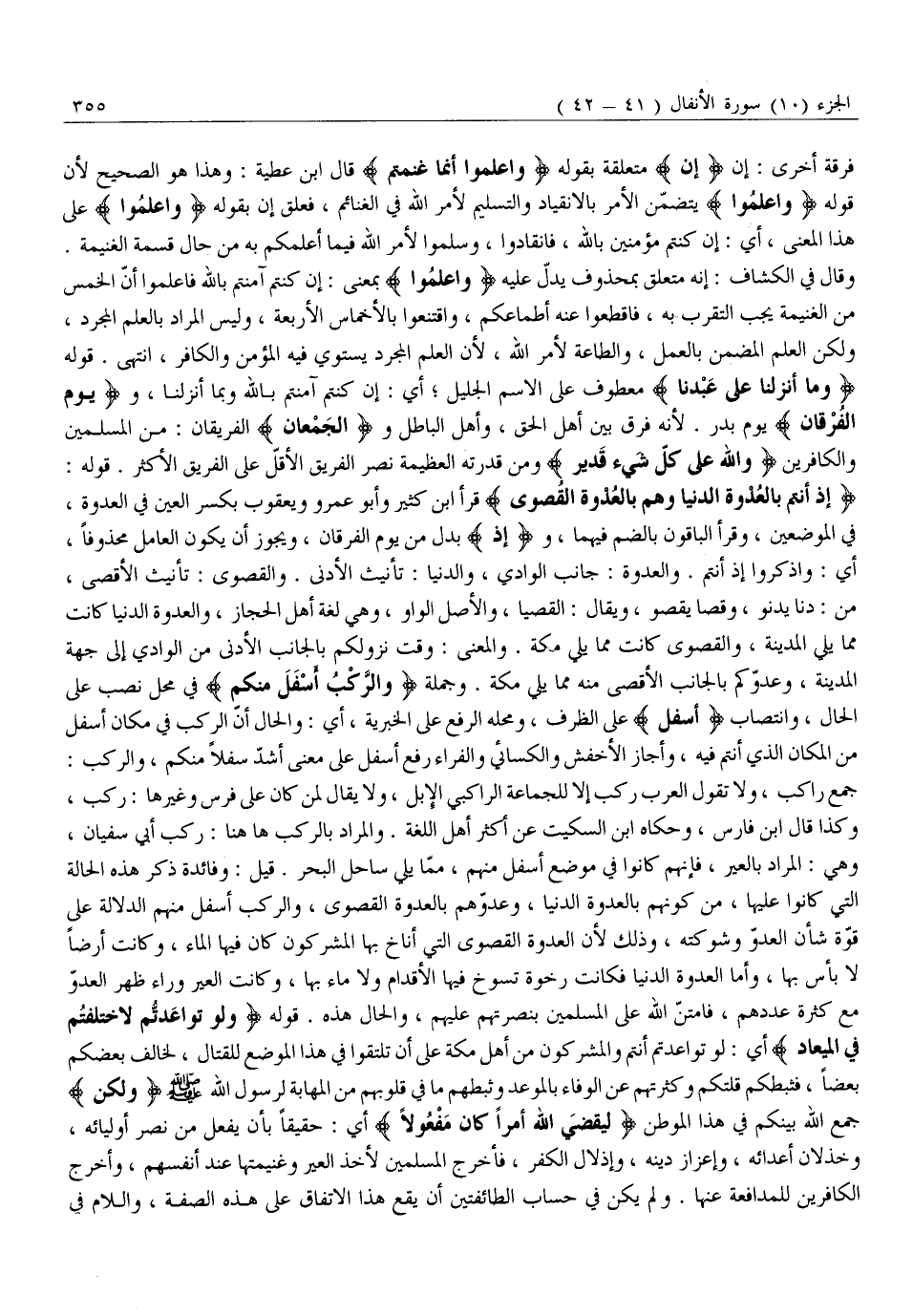 إِذْ أَنْتُمْ بِالْعُدْوَةِ الدُّنْيا وَهُمْ بِالْعُدْوَةِ الْقُصْوى قَرَأَ ابْنُ كَثِيرٍ وَأَبُو عَمْرٍو وَيَعْقُوبُ بِكَسْرِ الْعَيْنِ فِي العدوة، في الموضعين، وقرأ الباقون بالضم فيهما، وإِذْ بَدَلٌ مِنْ يَوْمَ الْفُرْقَانِ، وَيَجُوزُ أَنْ يَكُونَ الْعَامِلُ مَحْذُوفًا، أَيْ: وَاذْكُرُوا إِذْ أَنْتُمْ. وَالْعُدْوَةُ: جَانِبُ الْوَادِي، وَالدُّنْيَا: تَأْنِيثُ الْأَدْنَى. وَالْقُصْوَى: تَأْنِيثُ الْأَقْصَى، مَنْ: دَنَا يَدْنُو، وَقَصَا يَقْصُو، وَيُقَالُ: الْقُصْيَا، وَالْأَصْلُ الْوَاوُ، وَهِيَ لُغَةُ أَهْلِ الْحِجَازِ، وَالْعُدْوَةُ الدُّنْيَا كَانَتْ مِمَّا يَلِي الْمَدِينَةَ، وَالْقُصْوَى كَانَتْ مِمَّا يَلِي مَكَّةَ. وَالْمَعْنَى: وَقْتَ نُزُولِكُمْ بِالْجَانِبِ الْأَدْنَى مِنَ الْوَادِي إِلَى جِهَةِ الْمَدِينَةِ، وَعَدُوُّكُمْ بِالْجَانِبِ الْأَقْصَى مِنْهُ مِمَّا يَلِي مَكَّةَ. وَجُمْلَةُ وَالرَّكْبُ أَسْفَلَ مِنْكُمْ فِي مَحَلِّ نَصْبٍ عَلَى الْحَالِ، وَانْتِصَابُ أَسْفَلَ عَلَى الظَّرْفِ، وَمَحَلُّهُ الرَّفْعُ عَلَى الْخَبَرِيَّةِ، أَيْ: وَالْحَالُ أَنَّ الرَّكْبَ فِي مَكَانٍ أَسْفَلَ مِنَ الْمَكَانِ الَّذِي أَنْتُمْ فِيهِ، وَأَجَازَ الْأَخْفَشُ وَالْكِسَائِيُّ وَالْفَرَّاءُ رَفْعَ أَسْفَلَ عَلَى مَعْنَى أَشَدَّ سُفْلًا مِنْكُمْ، وَالرَّكْبُ: