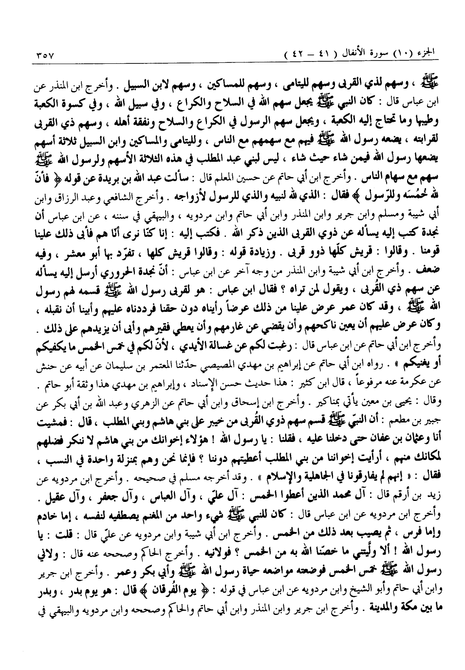 صَلَّى اللَّهُ عَلَيْهِ وَسَلَّمَ، وَسَهْمٌ لِذِي الْقُرْبَى وَسَهْمٌ لِلْيَتَامَى، وَسَهْمٌ لِلْمَسَاكِينِ، وَسَهْمٌ لِابْنِ السَّبِيلِ. وَأَخْرَجَ ابْنُ الْمُنْذِرِ عَنِ ابْنِ عَبَّاسٍ قَالَ: كَانَ النَّبِيُّ صَلَّى اللَّهُ عَلَيْهِ وَسَلَّمَ يَجْعَلُ سَهْمَ اللَّهِ فِي السِّلَاحِ وَالْكُرَاعِ، وَفِي سَبِيلِ اللَّهِ، وَفِي كُسْوَةِ الْكَعْبَةِ وَطِيبِهَا وَمَا تَحْتَاجُ إِلَيْهِ الْكَعْبَةُ، وَيَجْعَلُ سَهْمَ الرَّسُولِ فِي الْكُرَاعِ وَالسِّلَاحِ وَنَفَقَةِ أَهْلِهِ، وَسَهْمَ ذِي الْقُرْبَى لِقَرَابَتِهِ، يَضَعُهُ رَسُولُ اللَّهِ صَلَّى اللَّهُ عَلَيْهِ وَسَلَّمَ فِيهِمْ مَعَ سَهْمِهِمْ مَعَ النَّاسِ، وَلِلْيَتَامَى وَالْمَسَاكِينِ وَابْنِ السَّبِيلِ ثَلَاثَةُ أَسْهُمٍ يَضَعُهَا رَسُولُ اللَّهِ فِيمَنْ شَاءَ حَيْثُ شَاءَ، لَيْسَ لِبَنِي عَبْدِ الْمَطْلَبِ فِي هَذِهِ الثَّلَاثَةِ الْأَسْهُمِ وَلِرَسُولِ اللَّهِ صلّى الله عليه وسلّم سهم مع سِهَامِ النَّاسِ. وَأَخْرَجَ ابْنُ أَبِي حَاتِمٍ عَنْ حُسَيْنٍ الْمُعَلِّمِ قَالَ: سَأَلْتُ عَبْدَ اللَّهِ بْنَ بُرَيْدَةَ عَنْ قَوْلِهِ فَأَنَّ لِلَّهِ خُمُسَهُ وَلِلرَّسُولِ فَقَالَ: الَّذِي لِلَّهِ لِنَبِيِّهِ وَالَّذِي لِلرَّسُولِ لِأَزْوَاجِهِ. وَأَخْرَجَ الشَّافِعِيُّ وَعَبْدُ الرَّزَّاقِ وَابْنُ أَبِي شَيْبَةَ وَمُسْلِمٌ وَابْنُ جَرِيرٍ وَابْنُ الْمُنْذِرِ وَابْنُ أَبِي حَاتِمٍ وَابْنُ مَرْدَوَيْهِ، وَالْبَيْهَقِيُّ فِي سُنَنِهِ، عَنِ ابْنِ عَبَّاسٍ أَنَّ نَجْدَةَ كَتَبَ إِلَيْهِ يَسْأَلُهُ عَنْ ذَوِي الْقُرْبَى الَّذِينَ ذَكَرَ اللَّهُ. فَكَتَبَ إِلَيْهِ: إِنَّا كُنَّا نَرَى أَنَّا هُمْ فَأَبَى ذَلِكَ عَلَيْنَا قَوْمُنَا. وَقَالُوا: قُرَيْشٌ كُلُّهَا ذَوُو قُرْبَى. وَزِيَادَةُ قَوْلِهِ: وَقَالُوا قُرَيْشٌ كُلُّهَا، تَفَرَّدَ بِهَا أَبُو مَعْشَرٍ، وَفِيهِ ضَعْفٌ. وَأَخْرَجَ ابْنُ أَبِي شَيْبَةَ وَابْنُ الْمُنْذِرِ مِنْ وَجْهٍ آخَرَ عَنِ ابْنِ عَبَّاسٍ: أَنَّ نَجْدَةَ الْحَرُورَيَّ أَرْسَلَ إِلَيْهِ يَسْأَلُهُ عَنْ سَهْمِ ذِي الْقُرْبَى، وَيَقُولُ لِمَنْ تَرَاهُ؟ فَقَالَ ابْنُ عَبَّاسٍ: هُوَ لِقُرْبَى رَسُولِ اللَّهِ صَلَّى اللَّهُ عَلَيْهِ وَسَلَّمَ قَسَمَهُ لَهُمْ رَسُولُ اللَّهِ صَلَّى اللَّهُ عَلَيْهِ