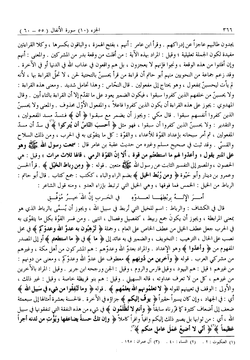 وَلَا يَحْسَبَنَّ مَنْ خَلْفِهِمُ الَّذِينَ كَفَرُوا سَبَقُوا، فَيَكُونُ الضَّمِيرُ يَعُودُ عَلَى مَا تَقَدَّمَ إِلَّا أَنَّ الْقِرَاءَةَ بِالتَّاءِ أَبْيَنُ. وَقَالَ الْمَهْدَوِيُّ: يَجُوزُ عَلَى هَذِهِ الْقِرَاءَةِ أَنْ يَكُونَ الَّذِينَ كَفَرُوا فَاعِلًا، وَالْمَفْعُولُ الْأَوَّلُ مَحْذُوفٌ. وَالْمَعْنَى وَلَا يَحْسَبَنَّ الَّذِينَ كَفَرُوا أَنْفُسَهُمْ سَبَقُوا. قَالَ مَكِّيُّ: وَيَجُوزُ أَنْ يُضْمَرَ مَعَ سَبَقُوا أَنْ فَتَسُدُّ مَسَدَّ الْمَفْعُولَيْنِ، وَالتَّقْدِيرُ: وَلَا يَحْسَبْنَ الَّذِينَ كَفَرُوا أَنْ سَبَقُوا، فهو مثل أَحَسِبَ النَّاسُ أَنْ يُتْرَكُوا «1» فِي سَدِّ أَنْ مَسَدَّ الْمَفْعُولَيْنِ، ثُمَّ أَمَرَ سُبْحَانَهُ بِإِعْدَادِ الْقُوَّةِ لِلْأَعْدَاءِ، وَالْقُوَّةُ: كُلُّ مَا يُتَقَوَّى بِهِ فِي الْحَرْبِ، وَمِنْ ذَلِكَ السِّلَاحُ وَالْقِسِيُّ. وَقَدْ ثَبَتَ فِي صَحِيحِ مُسْلِمٍ وَغَيْرِهِ مِنْ حَدِيثِ عُقْبَةَ بْنِ عَامِرٍ قَالَ: سَمِعْتُ رَسُولَ اللَّهِ صَلَّى اللَّهُ عَلَيْهِ وَسَلَّمَ وَهُوَ عَلَى الْمِنْبَرِ يَقُولُ «وَأَعِدُّوا لَهُمْ مَا اسْتَطَعْتُمْ مِنْ قُوَّةٍ، أَلَا إِنَّ الْقُوَّةَ الرَّمْيُ، قَالَهَا ثَلَاثَ مَرَّاتٍ» وَقِيلَ: هِيَ الْحُصُونُ، وَالْمَصِيرُ إِلَى التَّفْسِيرِ الثَّابِتِ عَنْ رَسُولِ اللَّهِ صَلَّى اللَّهُ عَلَيْهِ وَسَلَّمَ مُتَعَيِّنٌ. قَوْلُهُ: وَمِنْ رِباطِ الْخَيْلِ. قَرَأَ الْحَسَنُ وَعَمْرُو بْنُ دِينَارٍ وَأَبُو حَيْوَةَ وَمِنْ رُبُطِ الْخَيْلِ بِضَمِّ الرَّاءِ وَالْبَاءِ، كَكُتُبٍ: جَمْعِ كِتَابٍ. قَالَ أَبُو حَاتِمٍ: