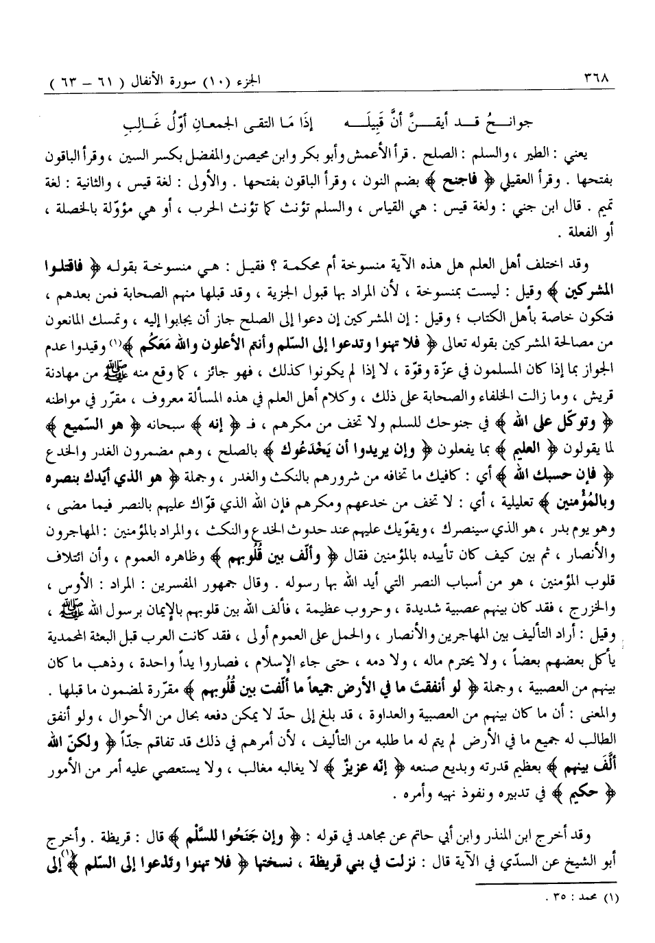 وَقَدِ اخْتَلَفَ أَهْلُ الْعِلْمِ هَلْ هَذِهِ الْآيَةُ مَنْسُوخَةٌ أَمْ مُحْكَمَةٌ؟ فَقِيلَ: هِيَ مَنْسُوخَةٌ بِقَوْلِهِ فَاقْتُلُوا الْمُشْرِكِينَ وَقِيلَ: لَيْسَتْ بِمَنْسُوخَةٍ، لِأَنَّ الْمُرَادَ بِهَا قَبُولُ الْجِزْيَةِ، وَقَدْ قَبِلَهَا مِنْهُمُ الصَّحَابَةُ فَمَنْ بَعْدَهُمْ، فَتَكُونُ خَاصَّةً بِأَهْلِ الْكِتَابِ وَقِيلَ: إِنَّ الْمُشْرِكِينَ إِنْ دَعَوْا إِلَى الصُّلْحِ جَازَ أَنْ يُجَابُوا إِلَيْهِ، وَتَمَسَّكَ الْمَانِعُونَ مِنْ مُصَالَحَةِ الْمُشْرِكِينَ بِقَوْلِهِ تَعَالَى فَلا تَهِنُوا وَتَدْعُوا إِلَى السَّلْمِ وَأَنْتُمُ الْأَعْلَوْنَ وَاللَّهُ مَعَكُمْ «1» وَقَيَّدُوا عَدَمَ الْجَوَازِ بِمَا إِذَا كَانَ الْمُسْلِمُونَ فِي عِزَّةٍ وَقُوَّةٍ، لَا إِذَا لَمْ يَكُونُوا كَذَلِكَ، فَهُوَ جَائِزٌ، كَمَا وَقَعَ مِنْهُ صَلَّى اللَّهُ عَلَيْهِ وَسَلَّمَ مِنْ مُهَادَنَةِ قُرَيْشٍ، وَمَا زَالَتِ الْخُلَفَاءُ وَالصَّحَابَةُ عَلَى ذَلِكَ، وَكَلَامُ أَهْلِ الْعِلْمِ فِي هَذِهِ الْمَسْأَلَةِ مَعْرُوفٌ، مُقَرَّرٌ فِي مَوَاطِنِهِ وَتَوَكَّلْ عَلَى اللَّهِ فِي جُنُوحِكَ لِلسَّلْمِ وَلَا تَخَفْ مِنْ مَكْرِهِمْ، فَ إِنَّهُ سُبْحَانَهُ هُوَ السَّمِيعُ لِمَا يَقُولُونَ الْعَلِيمُ بِمَا يَفْعَلُونَ وَإِنْ يُرِيدُوا أَنْ يَخْدَعُوكَ بِالصُّلْحِ، وَهُمْ مُضْمِرُونَ الْغَدْرَ وَالْخَدْعَ فَإِنَّ حَسْبَكَ اللَّهُ أَيْ: كَافِيَكَ مَا تَخَافُهُ مِنْ شُرُورِهِمْ بِالنَّكْثِ وَالْغَدْرِ، وَجُمْلَةُ هُوَ الَّذِي أَيَّدَكَ بِنَصْرِهِ وَبِالْمُؤْمِنِينَ تَعْلِيلِيَّةٌ، أَيْ: لَا تَخَفْ مِنْ خَدْعِهِمْ وَمَكْرِهِمْ فَإِنَّ اللَّهَ الَّذِي قَوَّاكَ عَلَيْهِمْ بِالنَّصْرِ فِيمَا مَضَى، وَهُوَ يَوْمُ بَدْرٍ، هُوَ الَّذِي سَيَنْصُرُكَ، وَيُقَوِّيكَ عَلَيْهِمْ عِنْدَ حُدُوثِ الْخَدْعِ وَالنَّكْثِ، وَالْمُرَادُ بِالْمُؤْمِنِينَ: الْمُهَاجِرُونَ وَالْأَنْصَارُ، ثُمَّ بَيَّنَ كَيْفَ كَانَ تَأْيِيدُهُ بِالْمُؤْمِنِينَ فَقَالَ وَأَلَّفَ بَيْنَ قُلُوبِهِمْ وَظَاهِرُهُ الْعُمُومُ، وَأَنَّ ائْتِلَافَ قُلُوبِ الْمُؤْمِنِينَ، هُوَ مِنْ أَسْبَابِ النَّصْرِ الَّتِي أَيَّدَ اللَّهُ بِهَا رَسُولَهُ. وَقَالَ جُمْهُورُ الْمُفَسِّرِينَ: الْمُرَادُ: الْأَوْسُ، وَالْخَزْرَجُ، فَقَدْ كَانَ بَيْنَهُمْ عَصَبِيَّةٌ شَدِيدَةٌ، وَحُرُوبٌ عَظِيمَةٌ، فَأَلَّفَ اللَّهُ بَيْنَ قُلُوبِهِمْ بِالْإِيمَانِ بِرَسُولِ اللَّهِ صَلَّى اللَّهُ عَلَيْهِ وَسَلَّمَ، وَقِيلَ: أَرَادَ التَّأْلِيفَ بَيْنَ الْمُهَاجِرِينَ وَالْأَنْصَارِ، وَالْحَمْلُ عَلَى الْعُمُومِ أَوْلَى، فَقَدْ كَانَتِ الْعَرَبُ قَبْلَ الْبِعْثَةِ الْمُحَمَّدِيَّةِ يَأْكُلُ بَعْضُهُمْ بَعْضًا، وَلَا يَحْتَرِمُ مَالَهُ، وَلَا دَمَهُ، حَتَّى جَاءَ الْإِسْلَامُ، فَصَارُوا يَدًا وَاحِدَةً، وَذَهَبَ مَا كَانَ بَيْنَهُمْ مِنَ الْعَصَبِيَّةِ، وَجُمْلَةُ لَوْ أَنْفَقْتَ مَا فِي الْأَرْضِ جَمِيعاً مَا أَلَّفْتَ بَيْنَ قُلُوبِهِمْ مُقَرِّرَةٌ لِمَضْمُونِ مَا قَبْلَهَا.