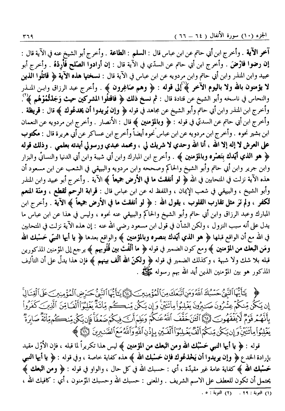 يَا أَيُّهَا النَّبِيُّ حَسْبُكَ اللَّهُ وَمَنِ اتَّبَعَكَ مِنَ الْمُؤْمِنِينَ (64) يَا أَيُّهَا النَّبِيُّ حَرِّضِ الْمُؤْمِنِينَ عَلَى الْقِتالِ إِنْ يَكُنْ مِنْكُمْ عِشْرُونَ صابِرُونَ يَغْلِبُوا مِائَتَيْنِ وَإِنْ يَكُنْ مِنْكُمْ مِائَةٌ يَغْلِبُوا أَلْفاً مِنَ الَّذِينَ كَفَرُوا بِأَنَّهُمْ قَوْمٌ لَا يَفْقَهُونَ (65) الْآنَ خَفَّفَ اللَّهُ عَنْكُمْ وَعَلِمَ أَنَّ فِيكُمْ ضَعْفاً فَإِنْ يَكُنْ مِنْكُمْ مِائَةٌ صابِرَةٌ يَغْلِبُوا مِائَتَيْنِ وَإِنْ يَكُنْ مِنْكُمْ أَلْفٌ يَغْلِبُوا أَلْفَيْنِ بِإِذْنِ اللَّهِ وَاللَّهُ مَعَ الصَّابِرِينَ (66)