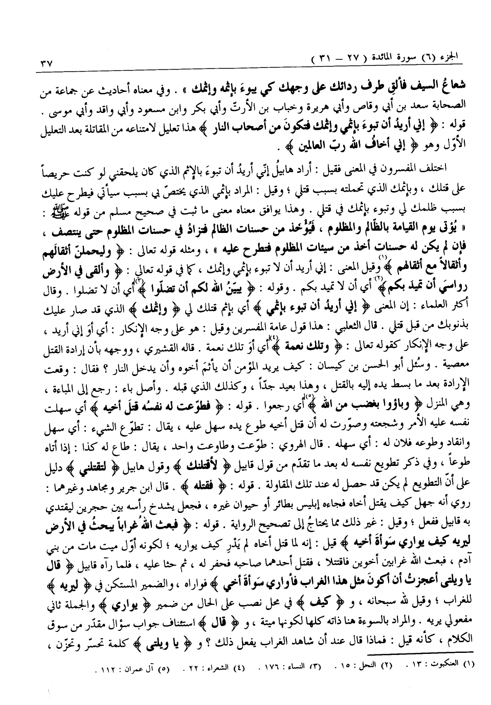 أَيْ أَوْ تِلْكَ نِعْمَةٌ. قَالَهُ الْقُشَيْرِيُّ، وَوَجْهُهُ بِأَنَّ إِرَادَةَ الْقَتْلِ مَعْصِيَةٌ. وَسُئِلَ أَبُو الْحَسَنِ بْنُ كِيسَانَ: كَيْفَ يُرِيدُ الْمُؤْمِنُ أَنْ يَأْثَمَ أَخُوهُ وَأَنْ يَدْخُلَ النَّارَ؟ فَقَالَ: وَقَعَتِ الْإِرَادَةُ بعد ما بَسَطَ يَدَهُ إِلَيْهِ بِالْقَتْلِ، وَهَذَا بَعِيدٌ جِدًّا، وَكَذَلِكَ الَّذِي قَبْلَهُ. وَأَصْلُ بَاءَ: رَجَعَ إِلَى المباءة، وهي المنزل وَباؤُ بِغَضَبٍ مِنَ اللَّهِ «5» أَيْ رَجَعُوا. قَوْلُهُ: فَطَوَّعَتْ لَهُ نَفْسُهُ قَتْلَ أَخِيهِ أَيْ سَهَّلَتْ نَفْسُهُ عَلَيْهِ الْأَمْرَ وَشَجَّعَتْهُ وَصَوَّرَتْ لَهُ أَنَّ قَتْلَ أَخِيهِ طَوْعَ يَدِهِ سَهْلٌ عَلَيْهِ، يُقَالُ: تَطَوَّعَ الشَّيْءُ: أَيْ سَهُلَ وَانْقَادَ وَطَوَّعَهُ فُلَانٌ لَهُ: أَيْ سَهَّلَهُ. قَالَ الْهَرَوِيُّ: طَوَّعَتْ وَطَاوَعَتْ وَاحِدٌ، يُقَالُ: طَاعَ لَهُ كَذَا: إِذَا أَتَاهُ طَوْعًا، وَفِي ذِكْرِ تَطْوِيعِ نفسه له بعد ما تَقَدَّمَ مِنْ قَوْلِ قَابِيلَ لَأَقْتُلَنَّكَ وَقَوْلِ هَابِيلَ لِتَقْتُلَنِي دَلِيلٌ عَلَى أَنَّ التَّطْوِيعَ لَمْ يَكُنْ قَدْ حَصَلَ لَهُ عِنْدَ تِلْكَ الْمُقَاوَلَةِ. قَوْلُهُ: فَقَتَلَهُ. قَالَ ابْنُ جَرِيرٍ وَمُجَاهِدٌ وَغَيْرُهُمَا: