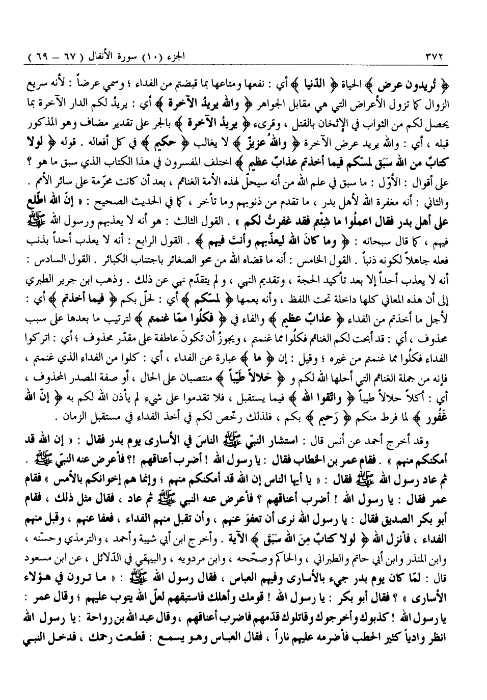 ثُمَّ عَادَ رَسُولَ اللَّهِ صَلَّى اللَّهُ عَلَيْهِ وَسَلَّمَ فَقَالَ: «يَا أَيُّهَا النَّاسُ إِنَّ اللَّهَ قَدِ أَمْكَنَكُمْ مِنْهُمْ وَإِنَّمَا هُمْ إِخْوَانُكُمْ بِالْأَمْسِ» فَقَامَ عُمَرُ فَقَالَ: يَا رَسُولَ اللَّهِ! اضْرِبْ أَعْنَاقَهُمْ؟ فَأَعْرَضَ عَنْهُ النَّبِيُّ صَلَّى اللَّهُ عَلَيْهِ وَسَلَّمَ ثُمَّ عَادَ، فَقَالَ مِثْلَ ذَلِكَ، فَقَامَ أَبُو بَكْرٍ الصِّدِّيقُ فَقَالَ: يَا رَسُولَ اللَّهِ نَرَى أَنْ تَعْفُوَ عَنْهُمْ، وَأَنْ تَقْبَلَ مِنْهُمُ الْفِدَاءَ، فَعَفَا عَنْهُمْ، وَقَبِلَ مِنْهُمُ الْفِدَاءَ، فَأَنْزَلَ اللَّهُ لَوْلا كِتابٌ مِنَ اللَّهِ سَبَقَ الْآيَةَ. وَأَخْرَجَ ابْنُ أَبِي شَيْبَةَ وَأَحْمَدُ، وَالتِّرْمِذِيُّ وَحَسَّنَهُ، وَابْنُ الْمُنْذِرِ وَابْنُ أَبِي حَاتِمٍ وَالطَّبَرَانِيُّ، وَالْحَاكِمُ وَصَحَّحَهُ، وَابْنُ مَرْدَوَيْهِ، وَالْبَيْهَقِيُّ فِي الدَّلَائِلِ، عَنِ ابْنِ مَسْعُودٍ قَالَ: لَمَّا كَانَ يَوْمُ بَدْرٍ جِيءَ بِالْأُسَارَى وَفِيهِمُ الْعَبَّاسُ، فَقَالَ رَسُولُ اللَّهِ صَلَّى اللَّهُ عَلَيْهِ وَسَلَّمَ: «مَا تَرَوْنَ فِي هَؤُلَاءِ الْأُسَارَى» ؟ فَقَالَ أَبُو بَكْرٍ: يَا رَسُولَ اللَّهِ! قَوْمُكَ وأهلك فاستبقهم لعلّ الله يَتُوبَ عَلَيْهِمْ وَقَالَ عُمَرُ:
