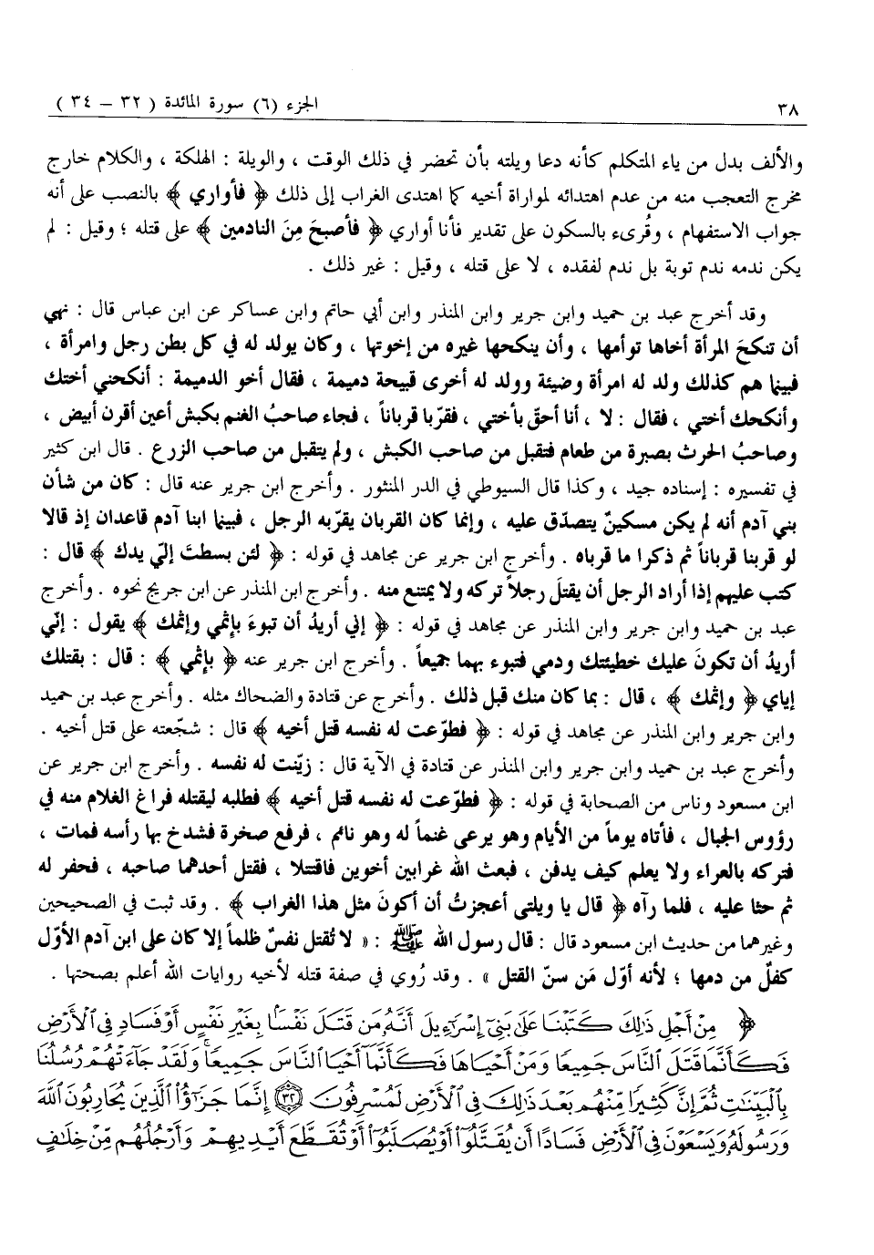 مِنْ أَجْلِ ذلِكَ كَتَبْنا عَلى بَنِي إِسْرائِيلَ أَنَّهُ مَنْ قَتَلَ نَفْساً بِغَيْرِ نَفْسٍ أَوْ فَسادٍ فِي الْأَرْضِ فَكَأَنَّما قَتَلَ النَّاسَ جَمِيعاً وَمَنْ أَحْياها فَكَأَنَّما أَحْيَا النَّاسَ جَمِيعاً وَلَقَدْ جاءَتْهُمْ رُسُلُنا بِالْبَيِّناتِ ثُمَّ إِنَّ كَثِيراً مِنْهُمْ بَعْدَ ذلِكَ فِي الْأَرْضِ لَمُسْرِفُونَ (32) إِنَّما جَزاءُ الَّذِينَ يُحارِبُونَ اللَّهَ وَرَسُولَهُ وَيَسْعَوْنَ فِي الْأَرْضِ فَساداً أَنْ يُقَتَّلُوا أَوْ يُصَلَّبُوا أَوْ تُقَطَّعَ أَيْدِيهِمْ وَأَرْجُلُهُمْ مِنْ خِلافٍ أَوْ يُنْفَوْا مِنَ الْأَرْضِ ذلِكَ لَهُمْ خِزْيٌ فِي الدُّنْيا وَلَهُمْ فِي الْآخِرَةِ عَذابٌ عَظِيمٌ (33) إِلاَّ الَّذِينَ تابُوا مِنْ قَبْلِ أَنْ تَقْدِرُوا عَلَيْهِمْ فَاعْلَمُوا أَنَّ اللَّهَ غَفُورٌ رَحِيمٌ (34)