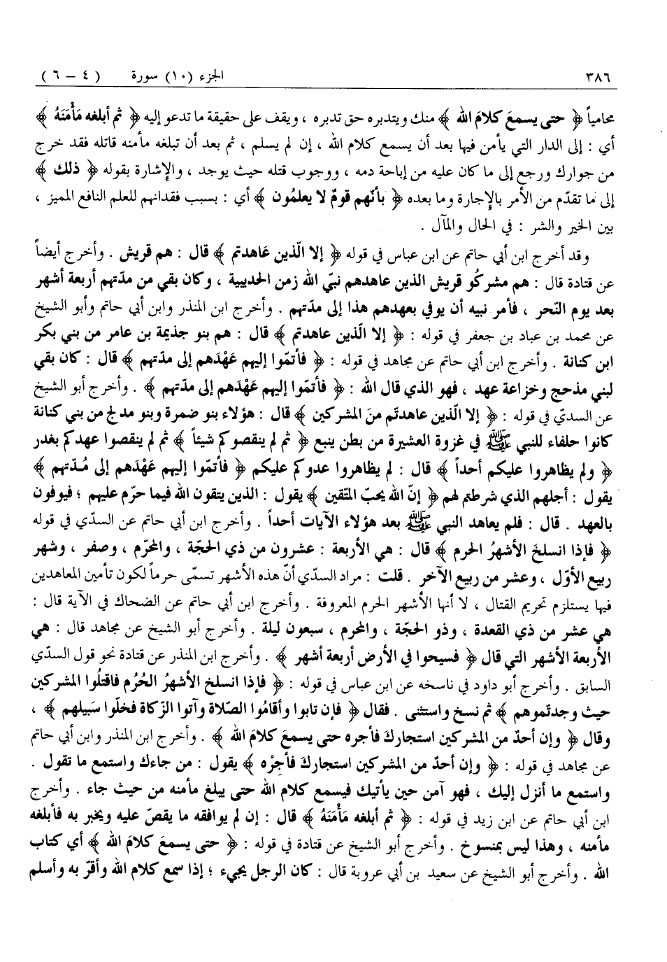 وَقَدْ أَخْرَجَ ابْنُ أَبِي حَاتِمٍ عَنِ ابْنِ عَبَّاسٍ فِي قَوْلِهِ إِلَّا الَّذِينَ عاهَدْتُمْ قَالَ: هُمْ قُرَيْشٌ. وَأَخْرَجَ أَيْضًا عَنْ قَتَادَةَ قَالَ: هُمْ مُشْرِكُو قُرَيْشٍ الَّذِينَ عَاهَدَهُمْ نَبِيُّ اللَّهِ زَمَنَ الْحُدَيْبِيَةِ، وَكَانَ بَقِيَ مِنْ مُدَّتِهِمْ أَرْبَعَةُ أَشْهُرٍ بَعْدَ يَوْمِ النَّحْرِ، فَأَمَرَ نَبِيَّهُ أَنَّ يُوفِيَ بِعَهْدِهِمْ هَذَا إِلَى مُدَّتِهِمْ. وَأَخْرَجَ ابْنُ الْمُنْذِرِ وَابْنُ أَبِي حَاتِمٍ وَأَبُو الشَّيْخِ عَنْ مُحَمَّدِ بْنِ عَبَّادِ بْنِ جَعْفَرٍ فِي قَوْلِهِ: إِلَّا الَّذِينَ عاهَدْتُمْ قَالَ: هُمْ بَنُو جَذِيمَةَ بْنِ عَامِرٍ مِنْ بني بكر ابن كِنَانَةَ. وَأَخْرَجَ ابْنُ أَبِي حَاتِمٍ عَنْ مُجَاهِدٍ فِي قَوْلِهِ: فَأَتِمُّوا إِلَيْهِمْ عَهْدَهُمْ إِلى مُدَّتِهِمْ قَالَ: كَانَ بَقِيَ لَبَنِي مَذْحِجٍ وَخُزَاعَةَ عَهْدٌ، فَهُوَ الَّذِي قَالَ اللَّهُ: فَأَتِمُّوا إِلَيْهِمْ عَهْدَهُمْ إِلى مُدَّتِهِمْ. وَأَخْرَجَ أَبُو الشَّيْخِ عَنِ السُّدِّيِّ فِي قَوْلِهِ: إِلَّا الَّذِينَ عاهَدْتُمْ مِنَ الْمُشْرِكِينَ قَالَ: هَؤُلَاءِ بَنُو ضَمْرَةَ وَبَنُو مُدْلِجٍ مِنْ بَنِي كِنَانَةَ كَانُوا حُلَفَاءَ لِلنَّبِيِّ صَلَّى اللَّهُ عَلَيْهِ وَسَلَّمَ فِي غَزْوَةِ الْعَشِيرَةِ مِنْ بَطْنِ يَنْبُعَ ثُمَّ لَمْ يَنْقُصُوكُمْ شَيْئاً ثُمَّ لَمْ يَنْقُصُوا عَهْدَكُمْ بِغَدْرٍ وَلَمْ يُظاهِرُوا عَلَيْكُمْ أَحَداً قَالَ: لَمْ يُظَاهِرُوا عَدُوَّكُمْ عَلَيْكُمْ فَأَتِمُّوا إِلَيْهِمْ عَهْدَهُمْ إِلى مُدَّتِهِمْ يَقُولُ: أَجْلُهُمُ الَّذِي شَرَطْتُمْ لَهُمْ إِنَّ اللَّهَ يُحِبُّ الْمُتَّقِينَ يَقُولُ: الَّذِينَ يَتَّقُونَ اللَّهَ فِيمَا حُرِّمَ عَلَيْهِمْ فَيُوفُونَ بِالْعَهْدِ. قَالَ: فَلَمْ يُعَاهِدِ النَّبِيُّ صَلَّى اللَّهُ عَلَيْهِ وَسَلَّمَ بَعْدَ هَؤُلَاءِ الْآيَاتِ أَحَدًا. وَأَخْرَجَ ابْنُ أَبِي حَاتِمٍ عَنِ السُّدِّيِّ فِي قَوْلِهِ فَإِذَا انْسَلَخَ الْأَشْهُرُ الْحُرُمُ قَالَ: هِيَ الْأَرْبَعَةُ: عِشْرُونَ مِنْ ذِي الْحِجَّةِ، وَالْمُحَرَّمُ، وَصَفَرٌ، وَشَهْرُ رَبِيعٍ الْأَوَّلِ، وَعَشْرٌ مِنْ رَبِيعٍ الْآخِرِ. قُلْتُ: مُرَادُ السُّدِّيِّ أَنَّ هَذِهِ الْأَشْهُرَ تُسَمَّى حُرُمًا لِكَوْنِ تَأْمِينِ الْمُعَاهَدِينَ فِيهَا يَسْتَلْزِمُ تَحْرِيمَ الْقِتَالِ، لَا أَنَّهَا الْأَشْهُرُ الْحُرُمُ الْمَعْرُوفَةُ. وَأَخْرَجَ ابْنُ أَبِي حَاتِمٍ عَنِ الضَّحَّاكِ فِي الْآيَةِ قَالَ: